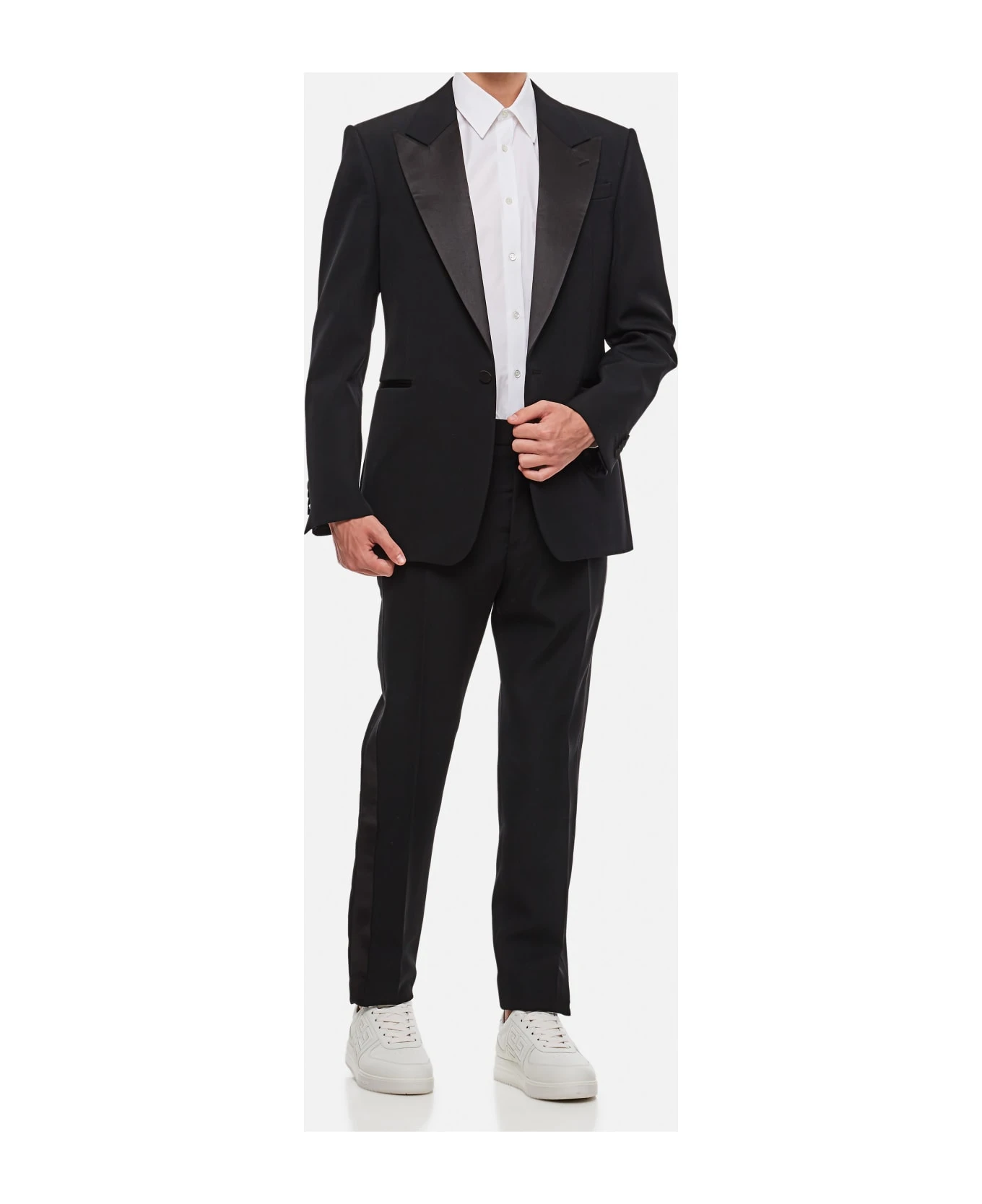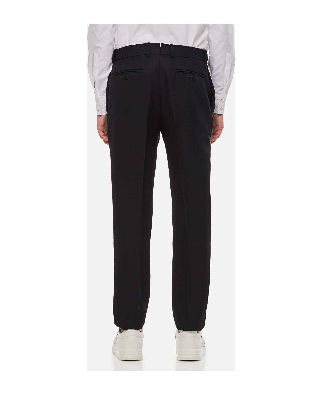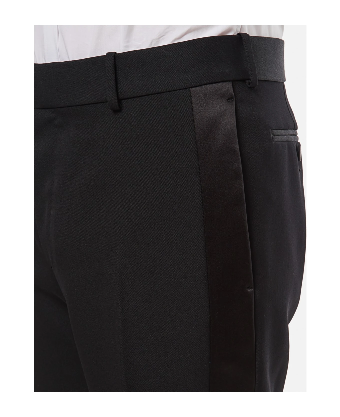 Button and zip closure. Belt loops. Side/back pockets. Satin detail. Regular fit. Color: black.