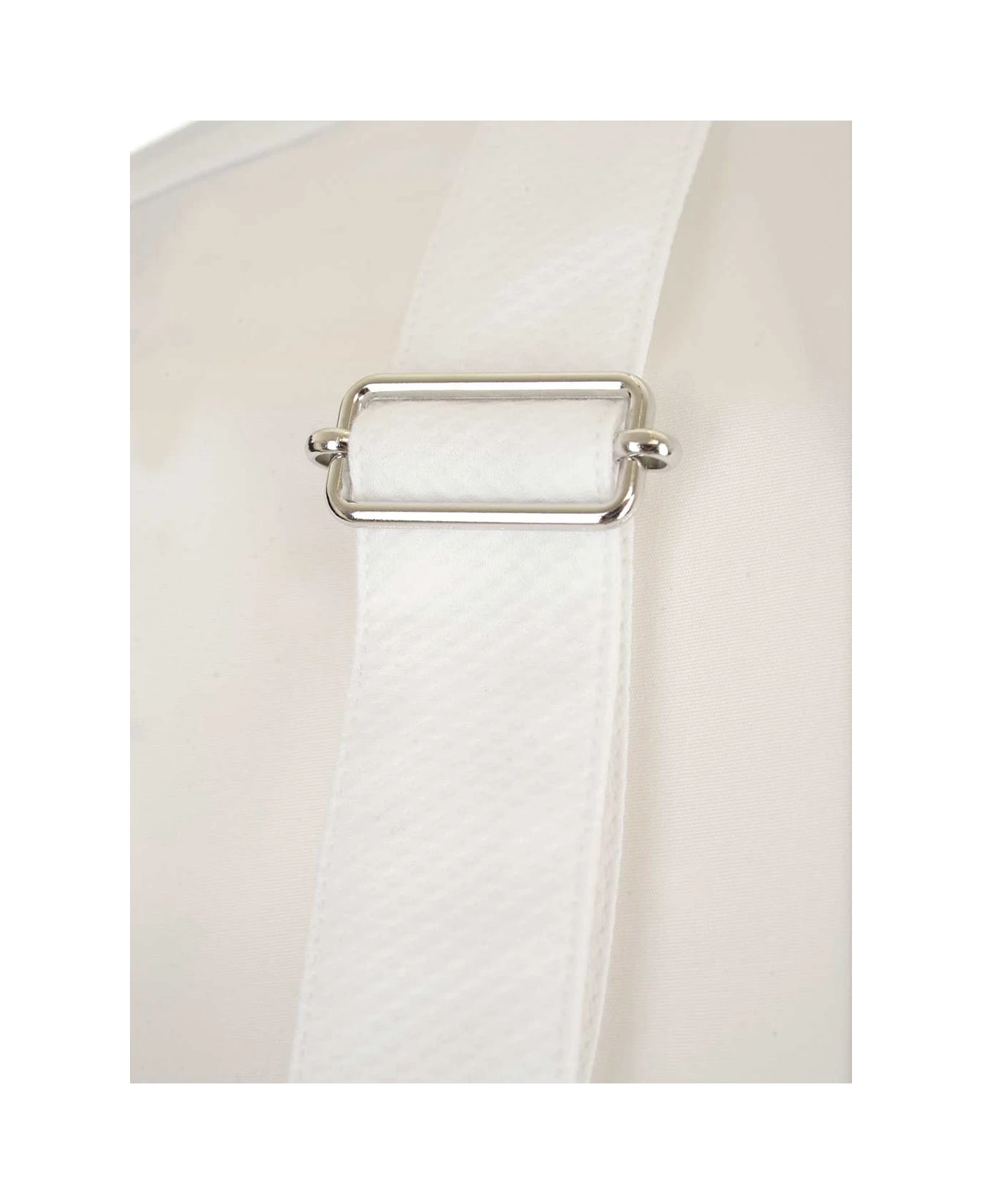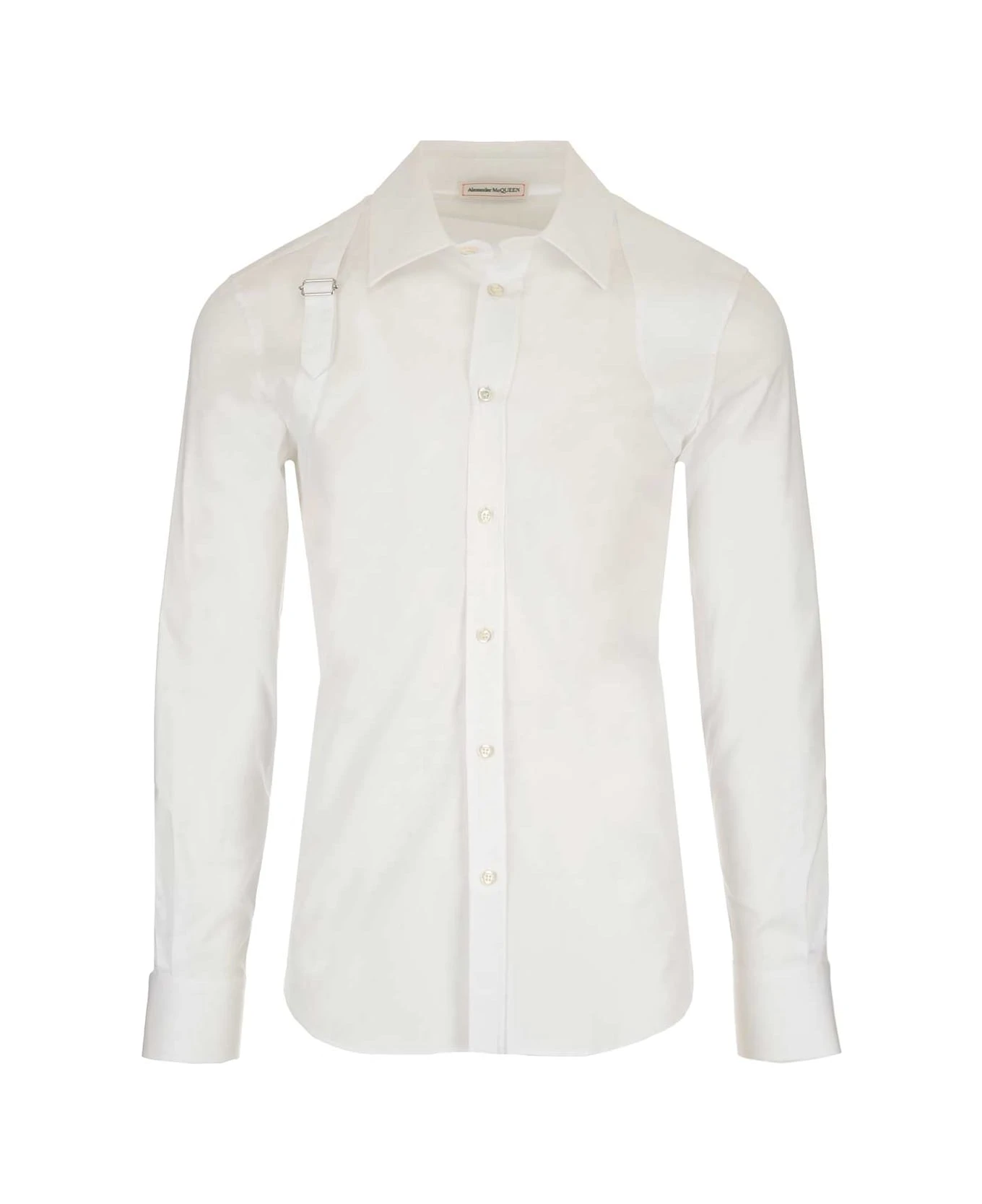 White “Harness ” shirt from Alexander McQueen in cotton poplin, long sleeves, classic collar, “Harness” detail with buckle on the shoulders.
