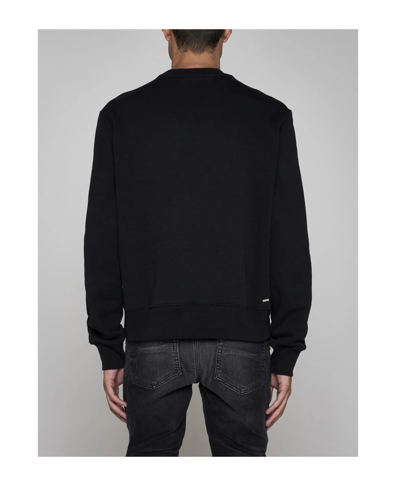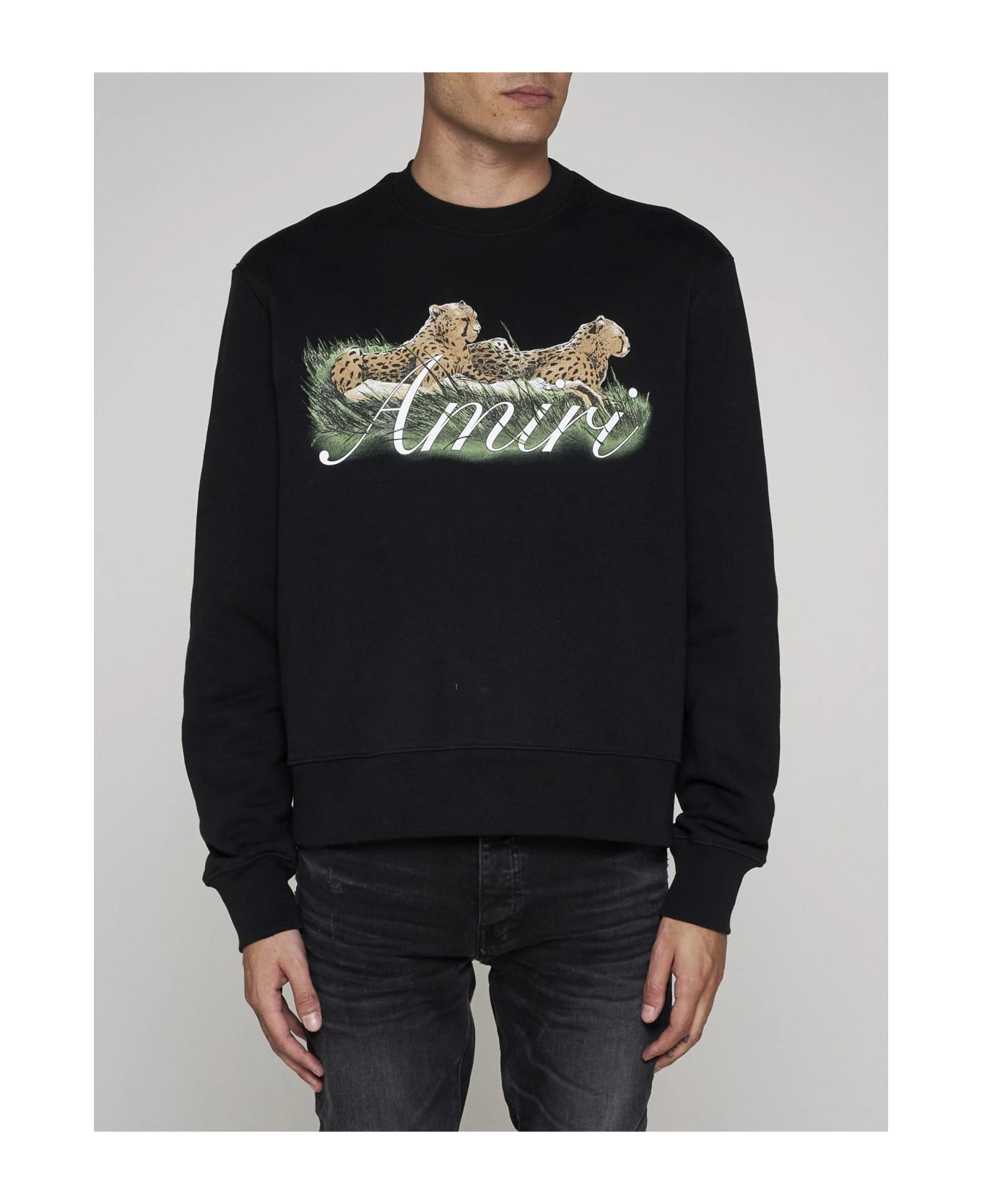 Amiri’s black cotton sweatshirt featuring a crew neck, cheetah print with logo on the chest and ribbed edges.