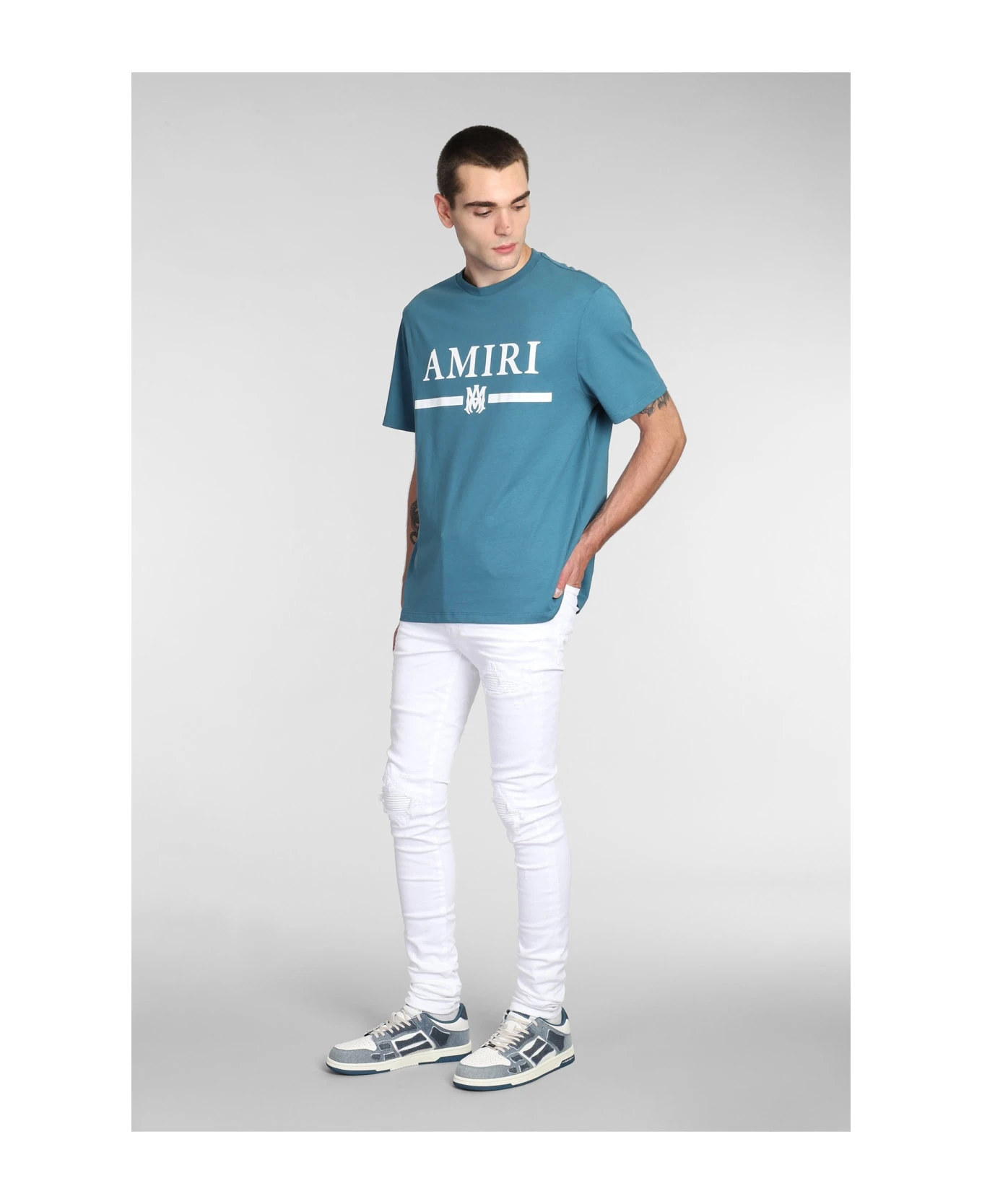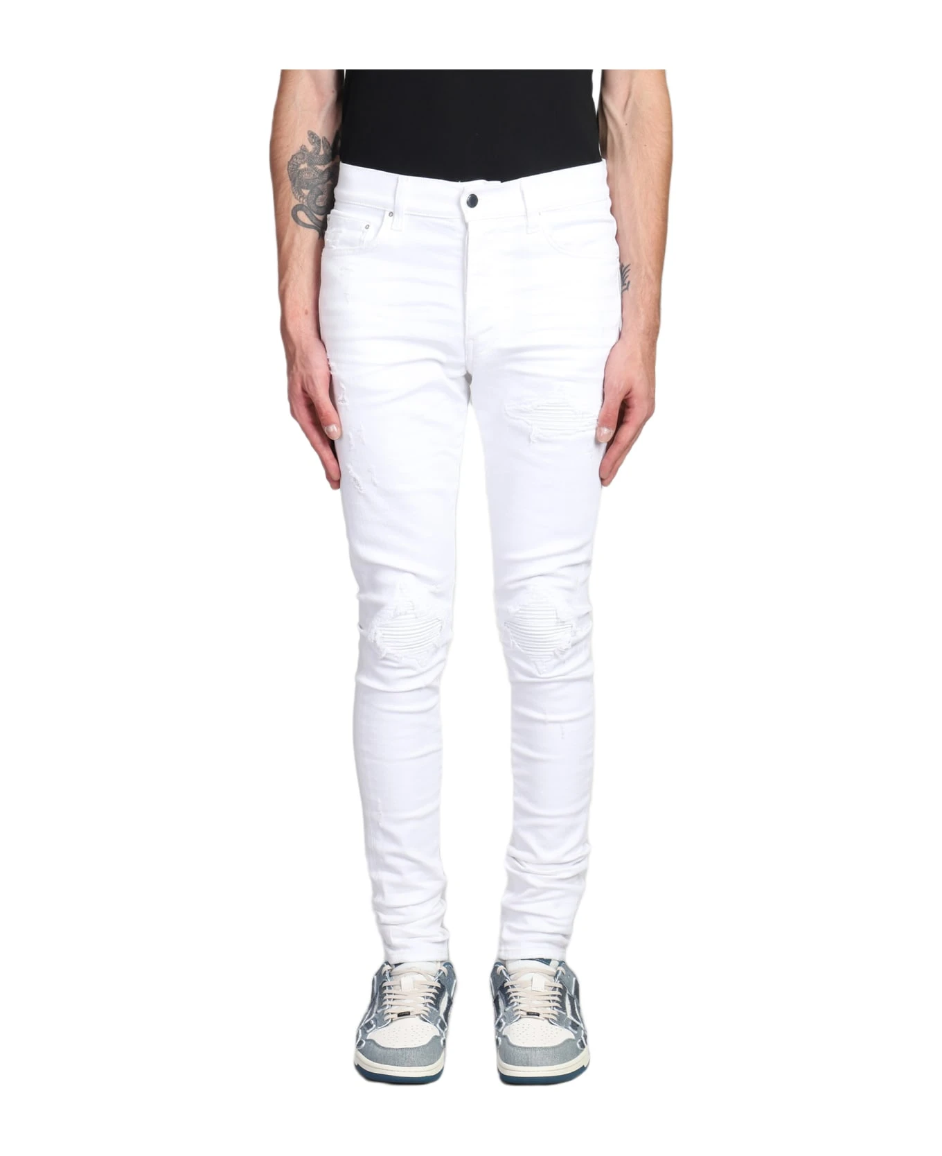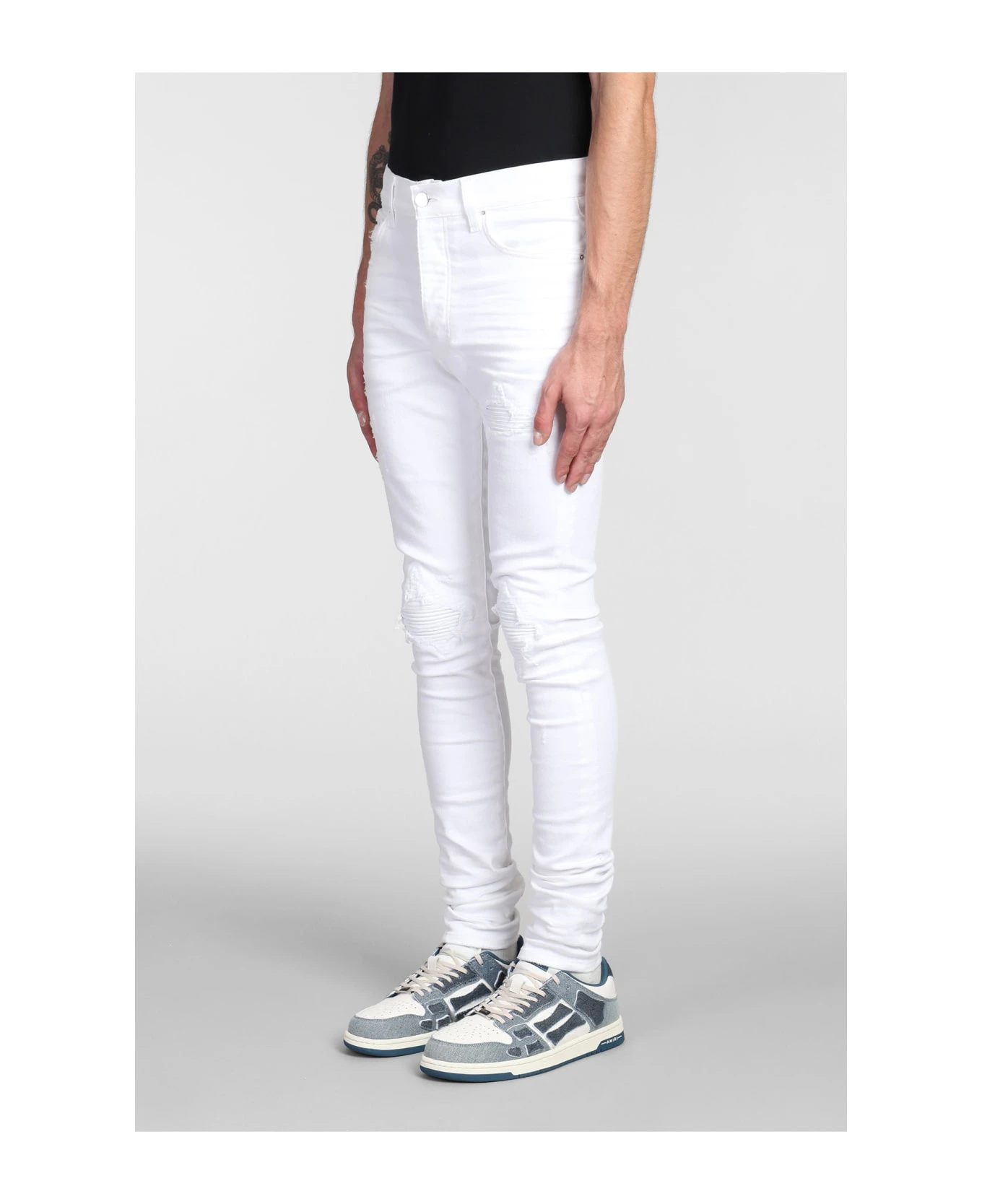 Jeans in white cotton, flap closure, five pockets, back patch logo, white leather biker details, logo plate on the back, 92 % cotton , 6% elastomultiester, 2% elastan, Made in Usa, Model is 187 cm and wears size 31