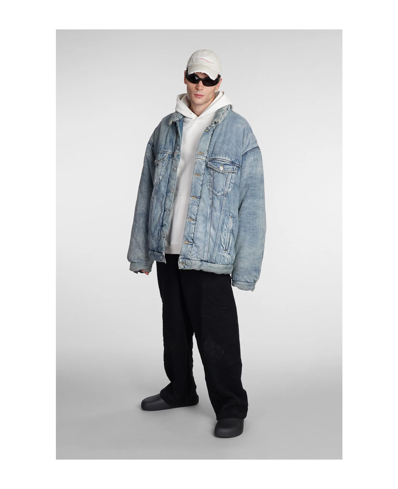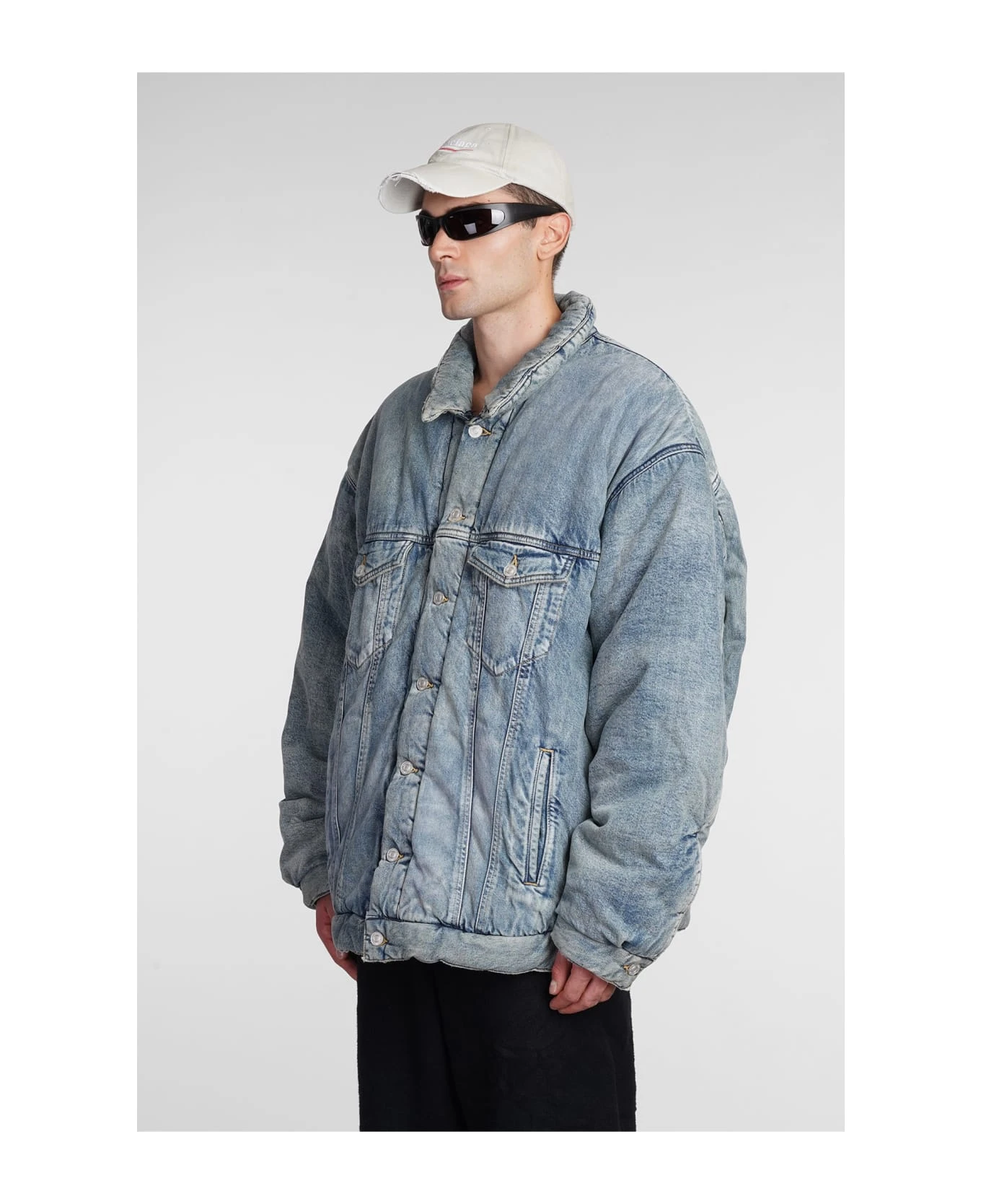 Denim Jackets in blue cotton, oversized fit, flap pockets, pockets on side, frontal buttoning, 100% cotton, Made in Japan, Model is 183 cm and wears 48