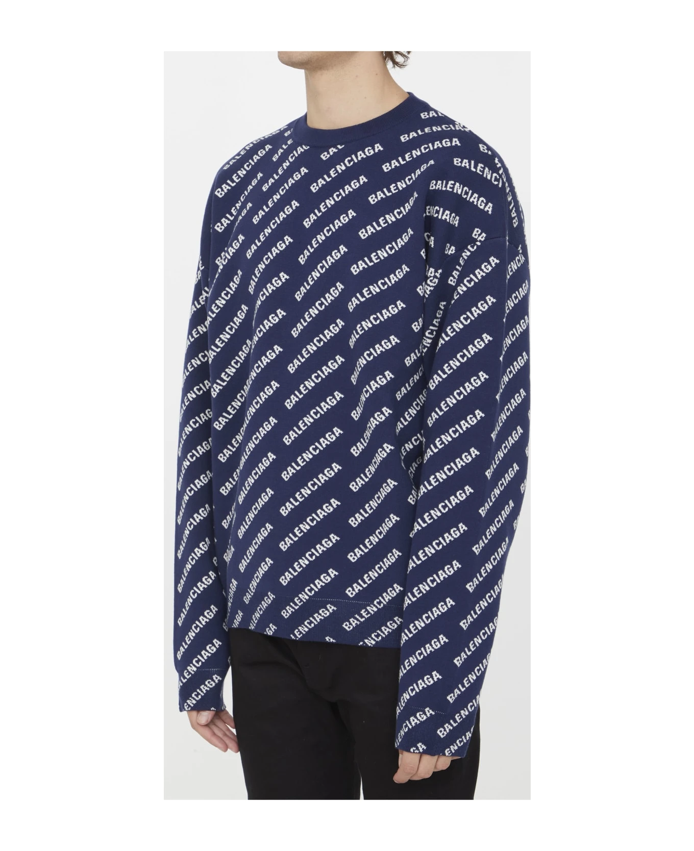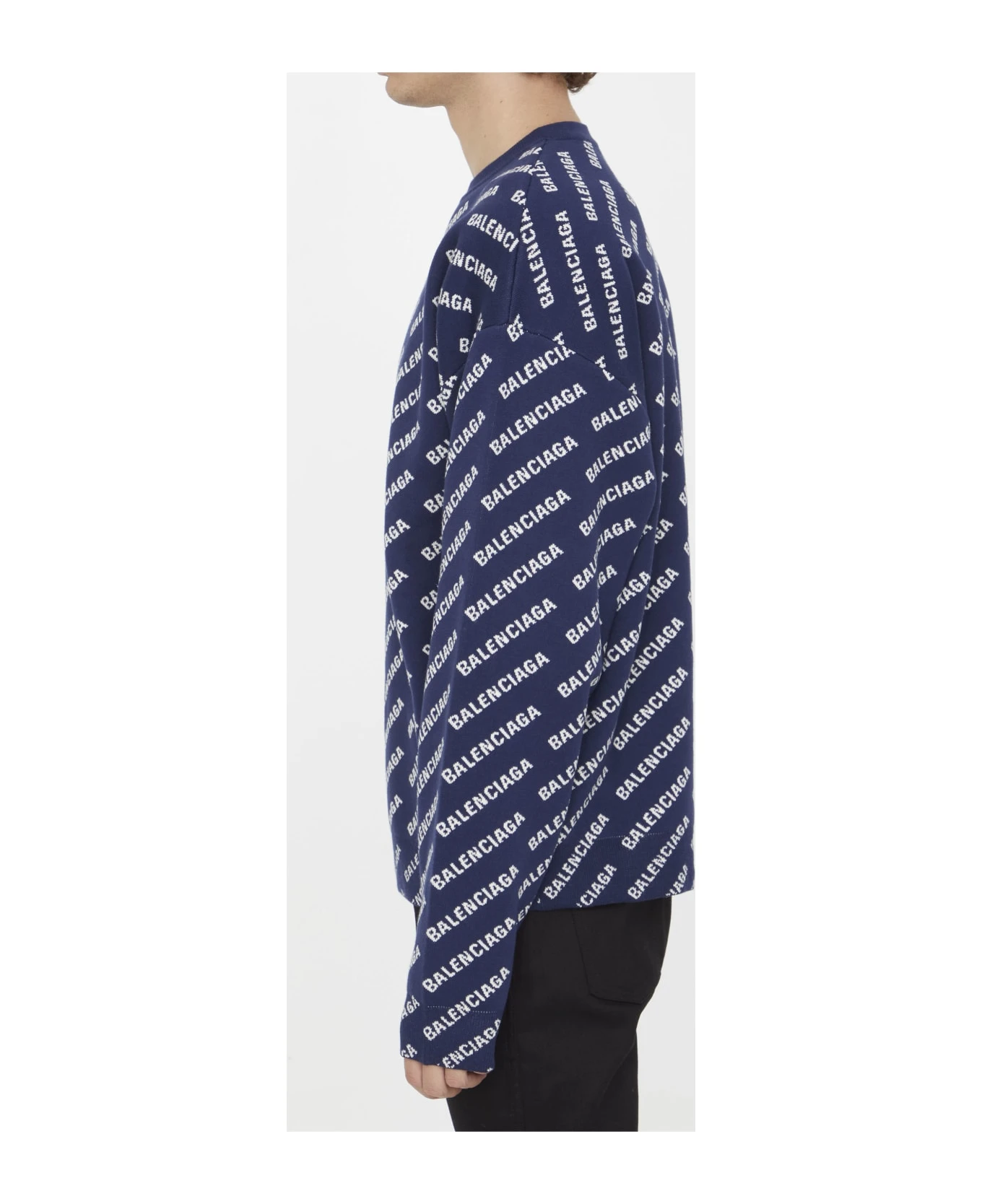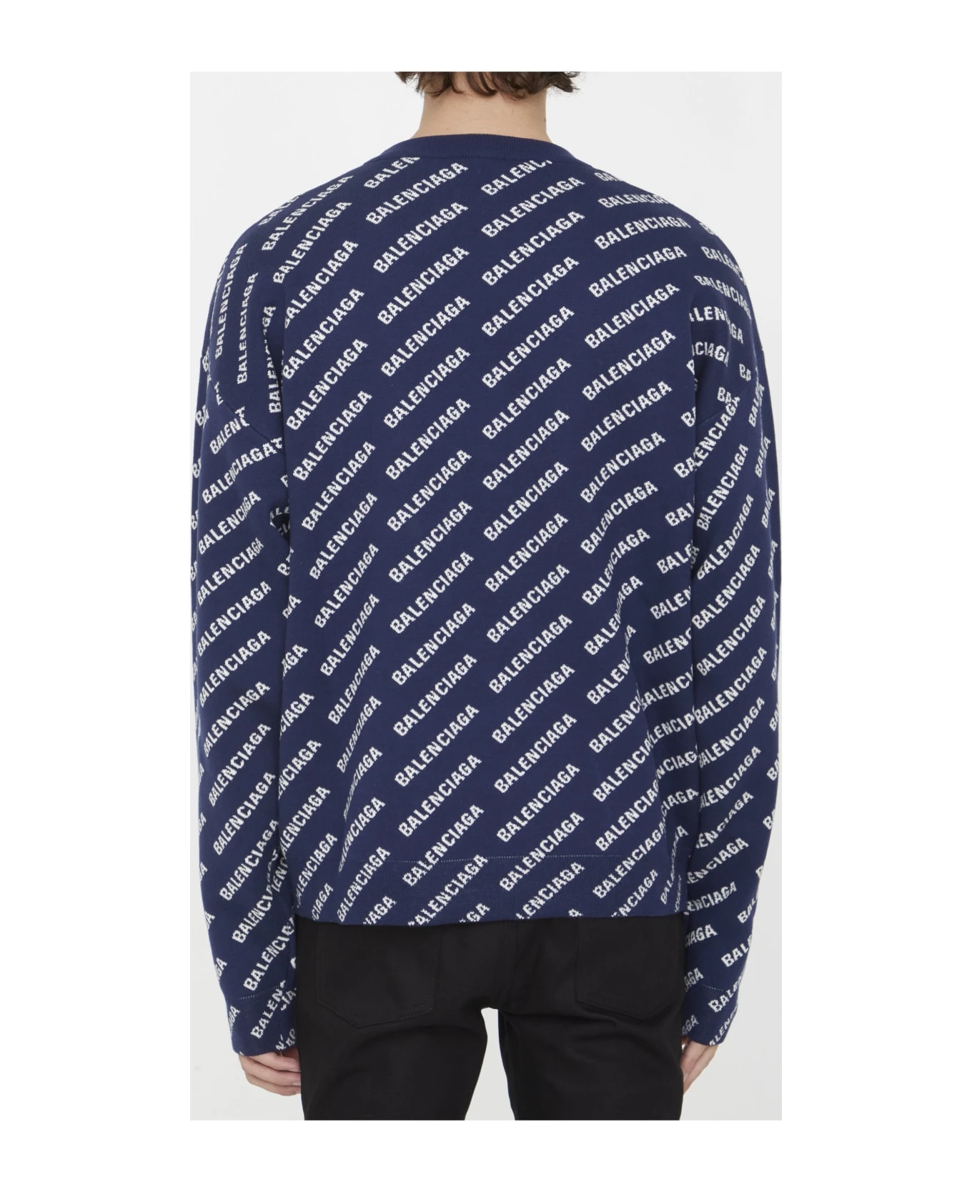 Long-sleeved crewneck sweater in blue and white cotton knit with Mini Allover Logo motif. Ribbed neck, cuffs and hem. Regular fit.