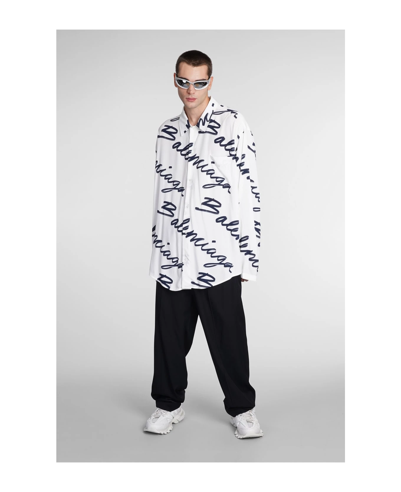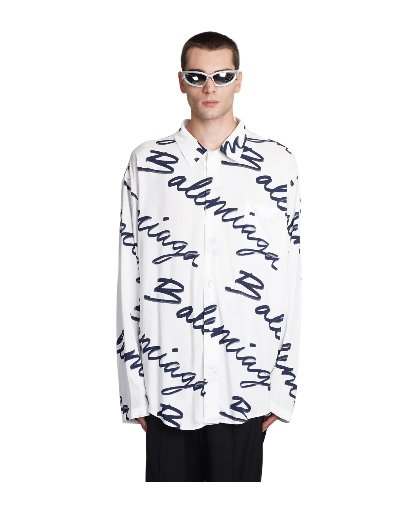 Shirt in white viscose, collar, long sleeves, curved hem, frontal buttoning, monogram print, breast pocket, 100% Viscose, Made in Madagascar, Model is 1. 83 and wears size 40