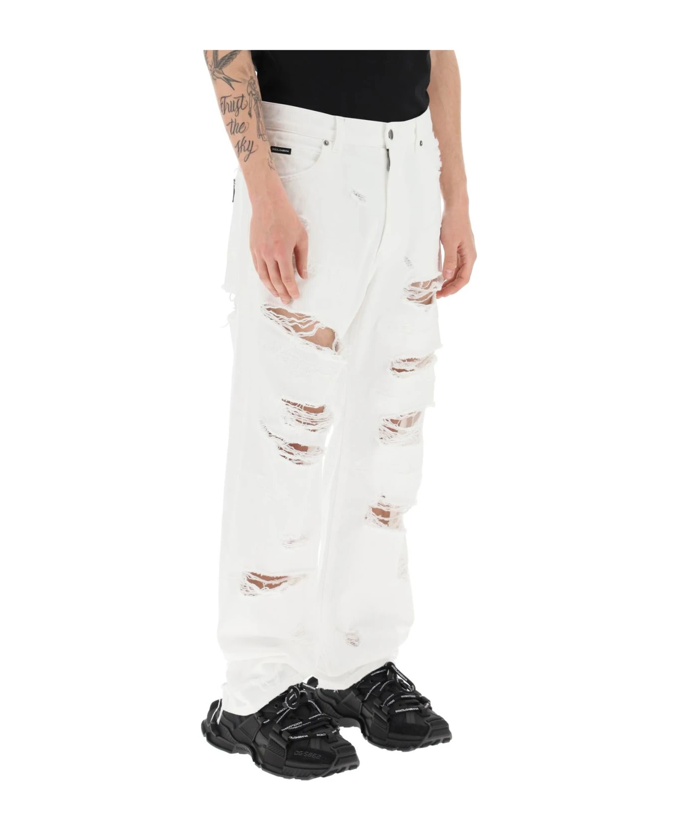 Dolce & Gabbana five-pocket jeans from the Re-Edition collection, inspired to archival garments. Cut from white destroyed denim to a baggy fit, they feature a logo label on the front coin pocket, a metal logo plate on the back pocket, belt loops, and zip fly with button. Re-Edition label stitched at the hip. The model is 187 cm tall and wears a size IT 48.