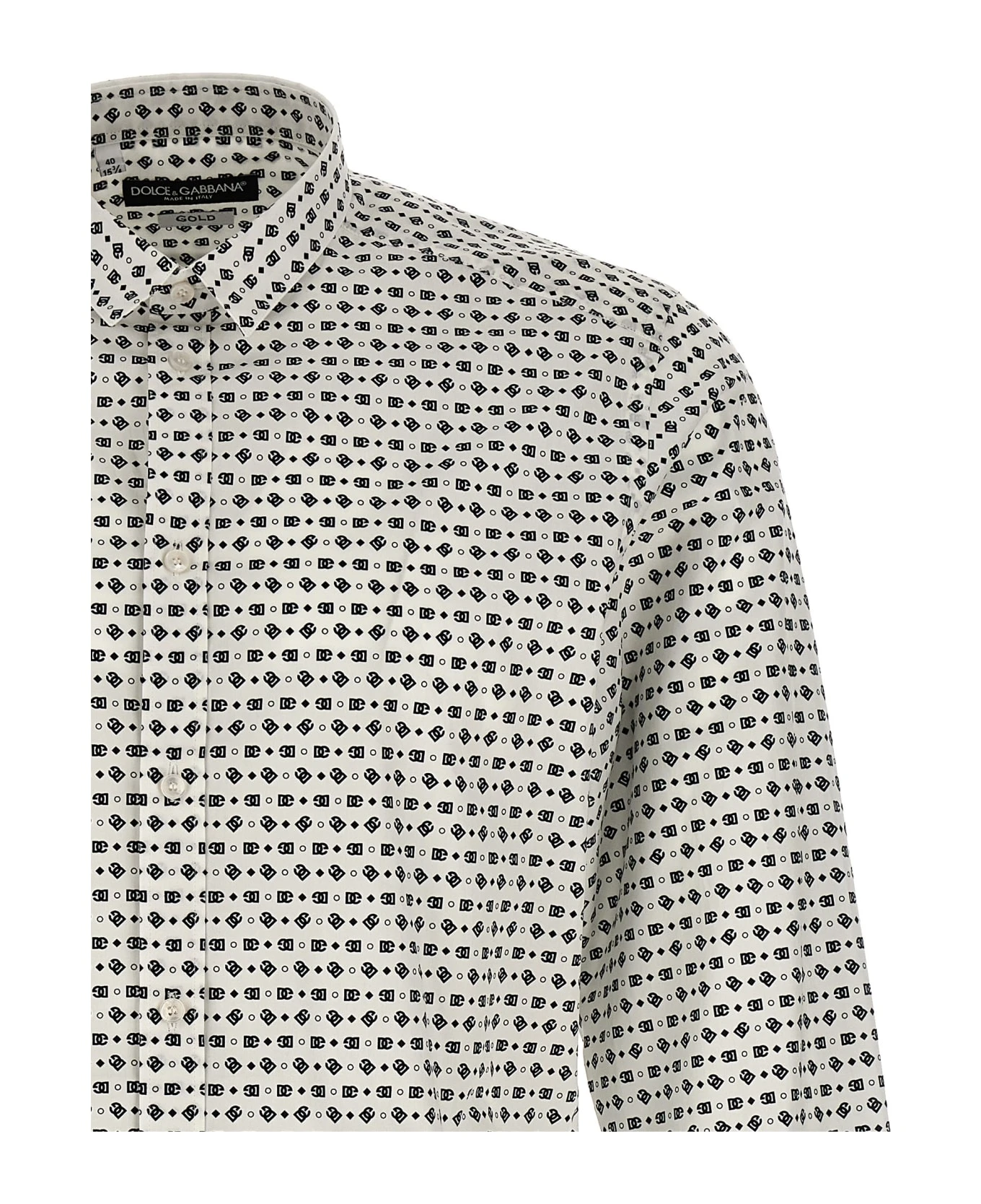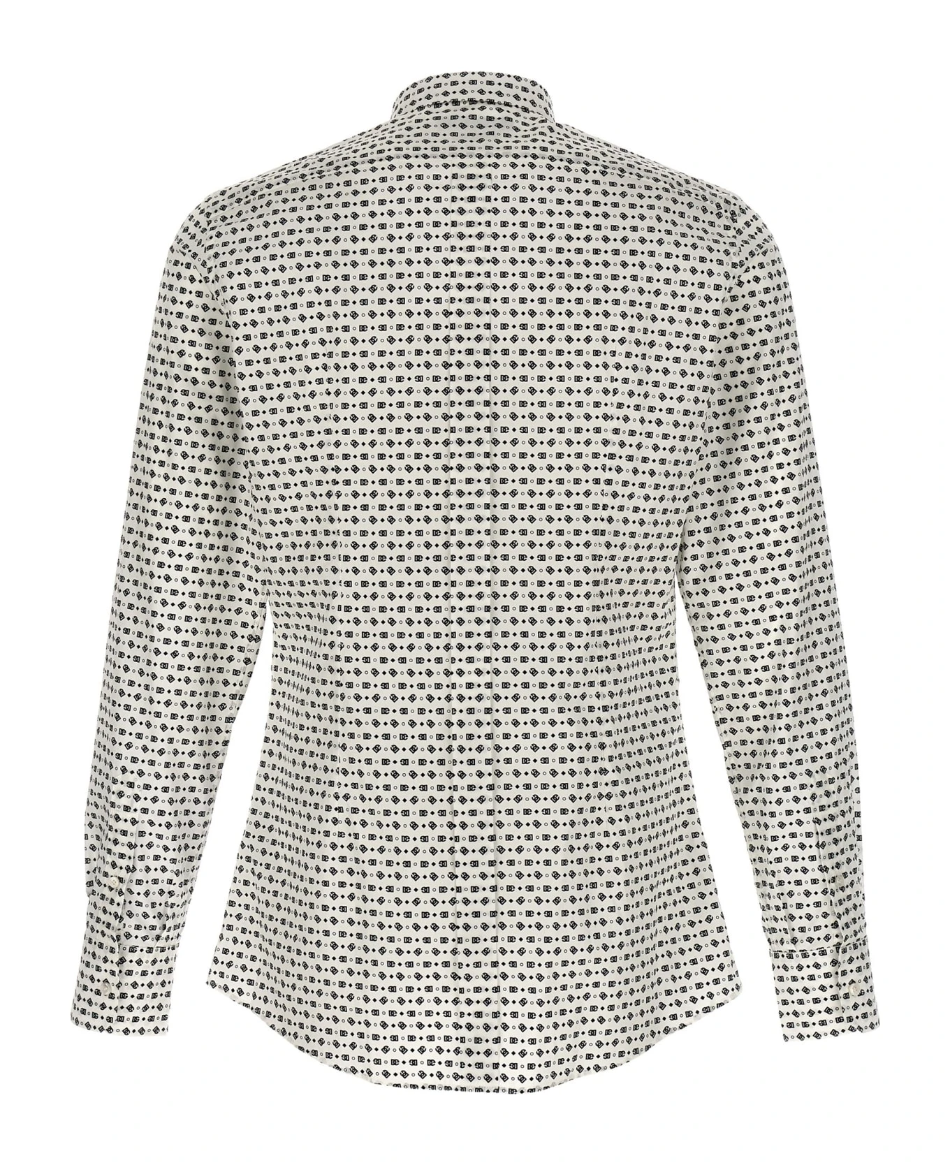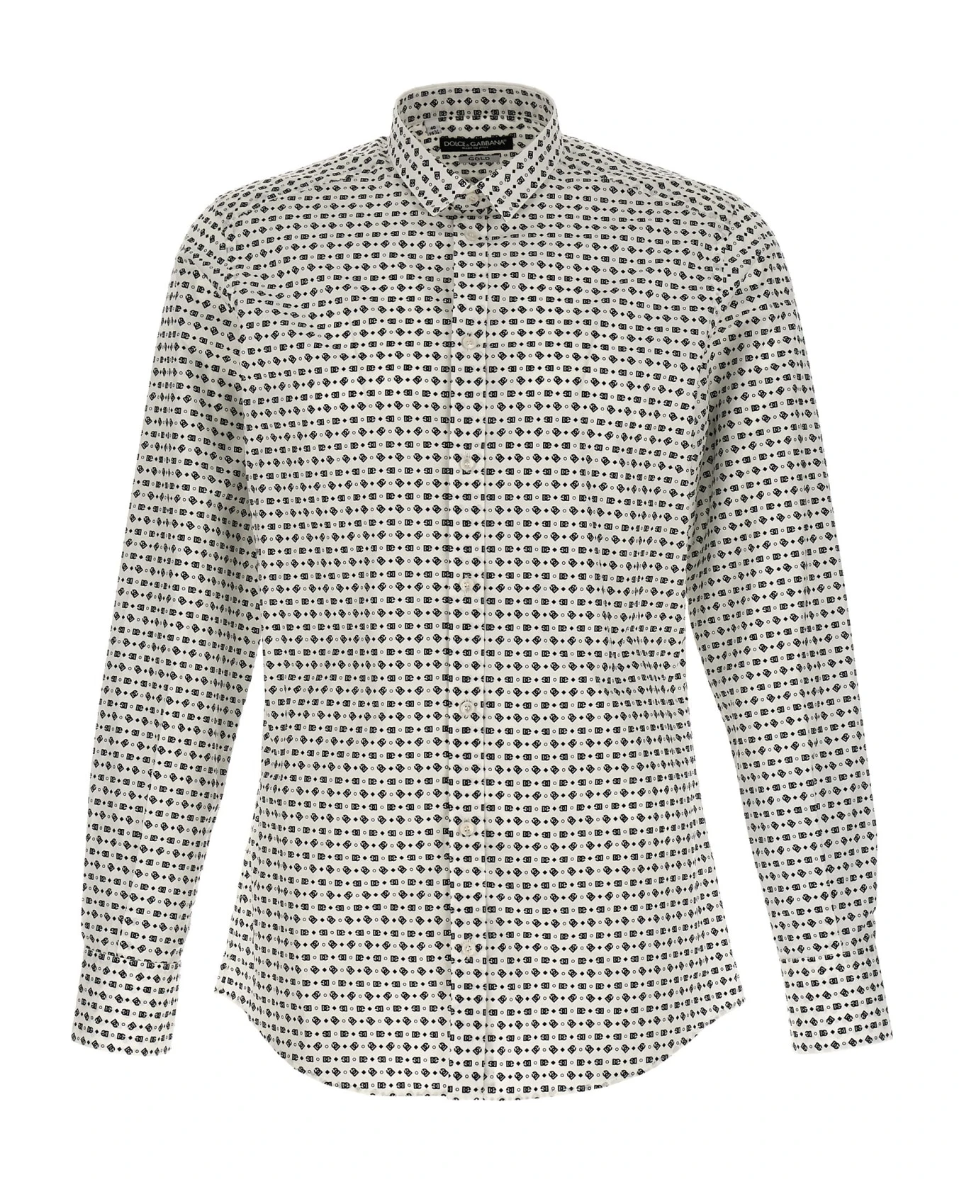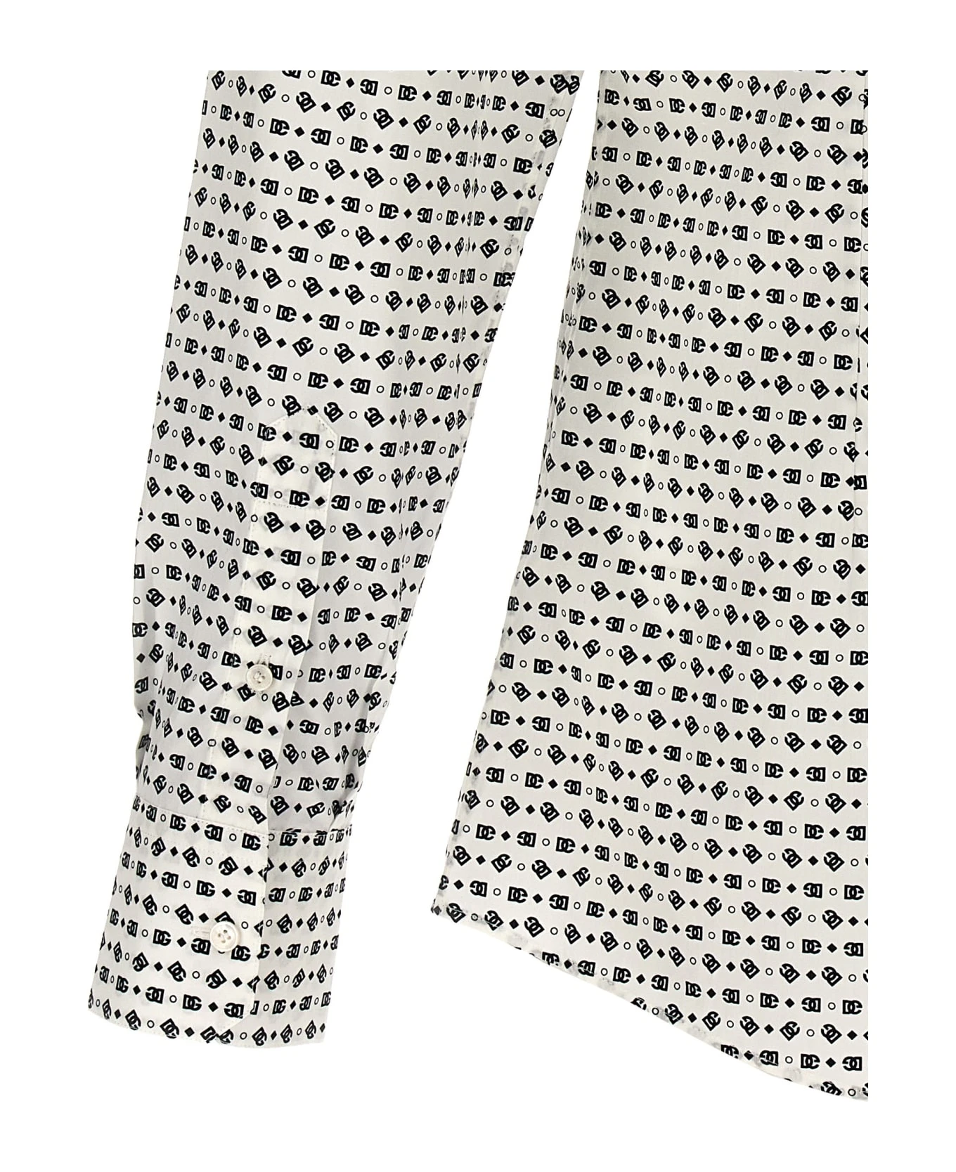 Cotton poplin shirt with all-over logo print, button closure, and long cuffed sleeves.