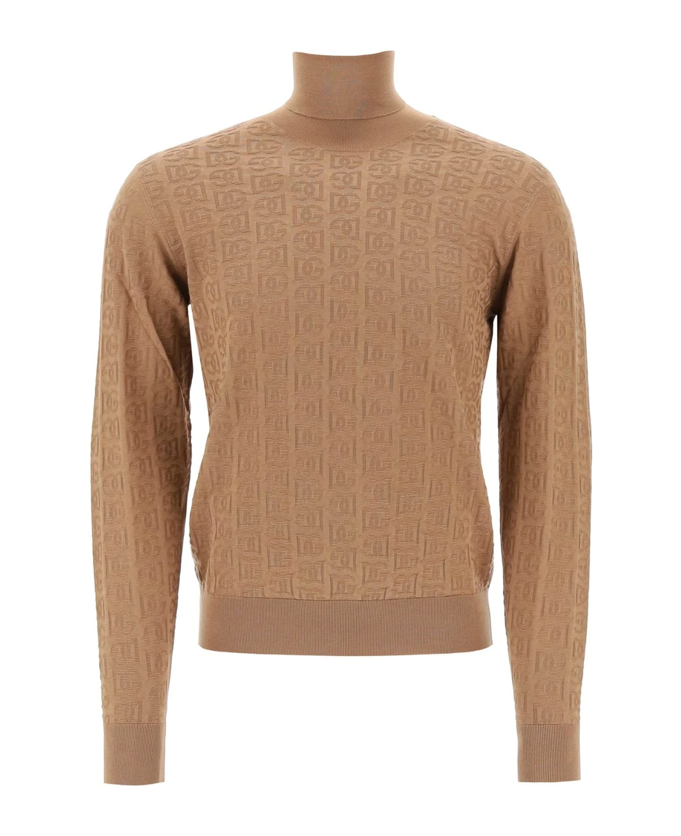 Turtleneck pullover by Dolce & Gabbana made of pure jacquard silk with DG logo motif. Ribbed hems, relaxed fit. The model is 187 cm tall and wears a size IT 48.