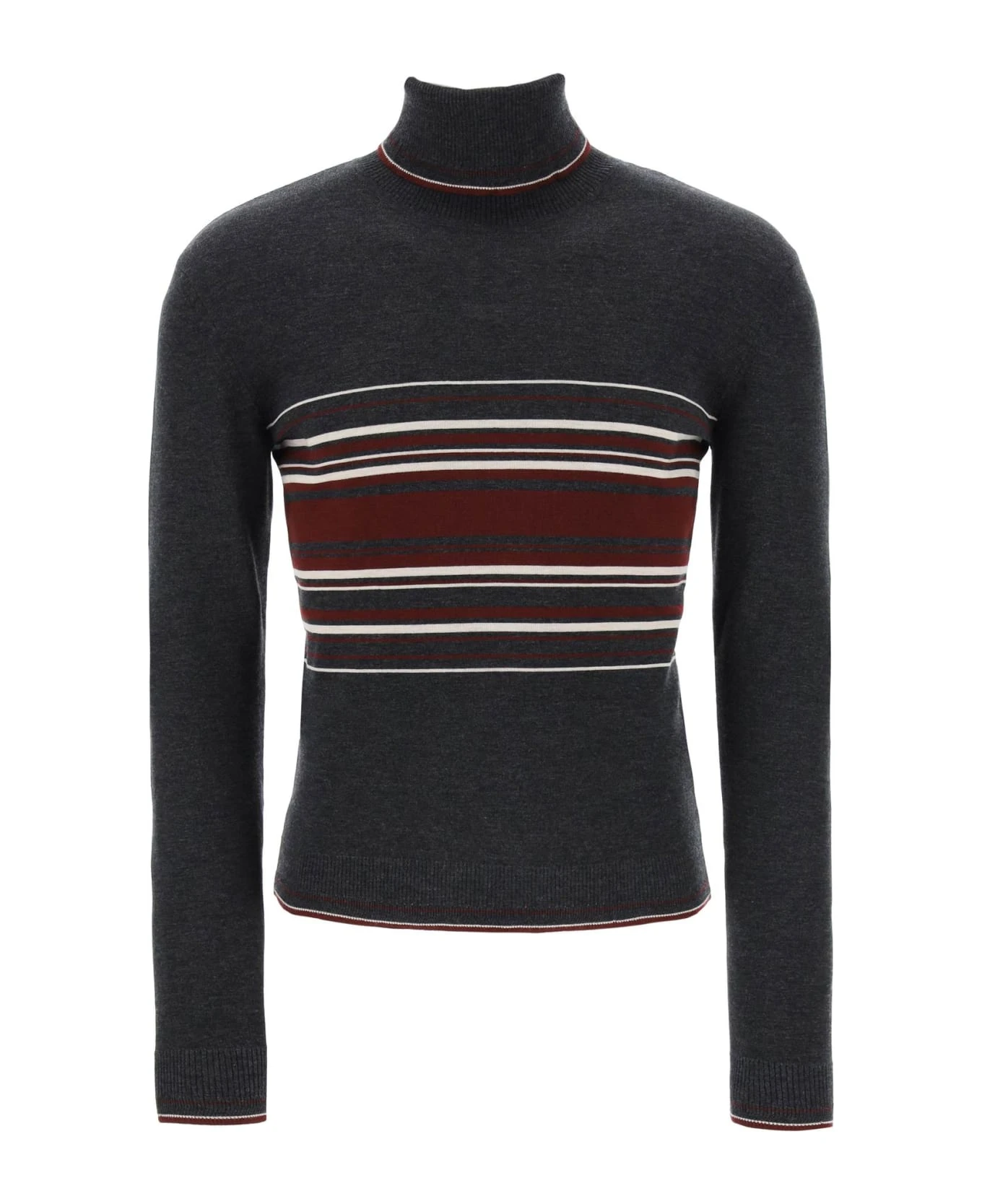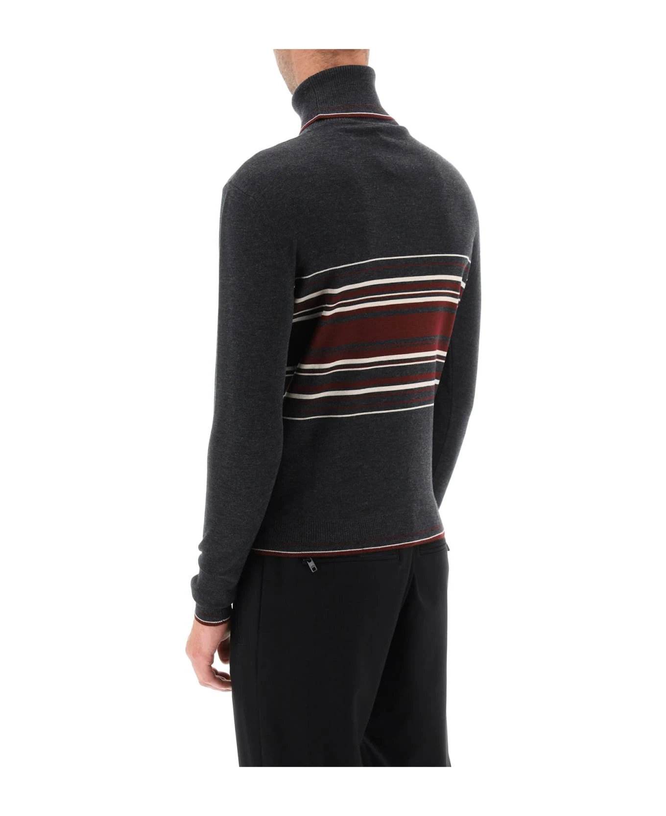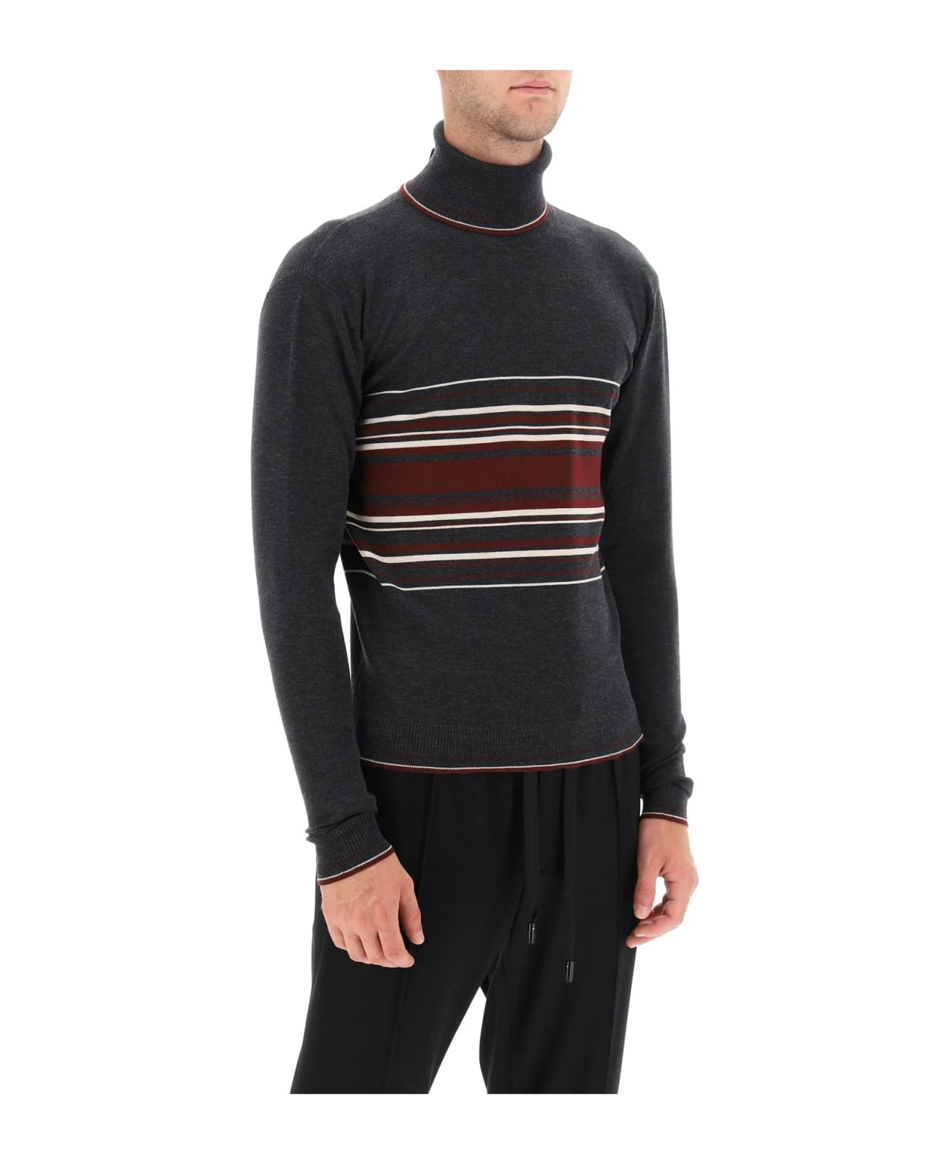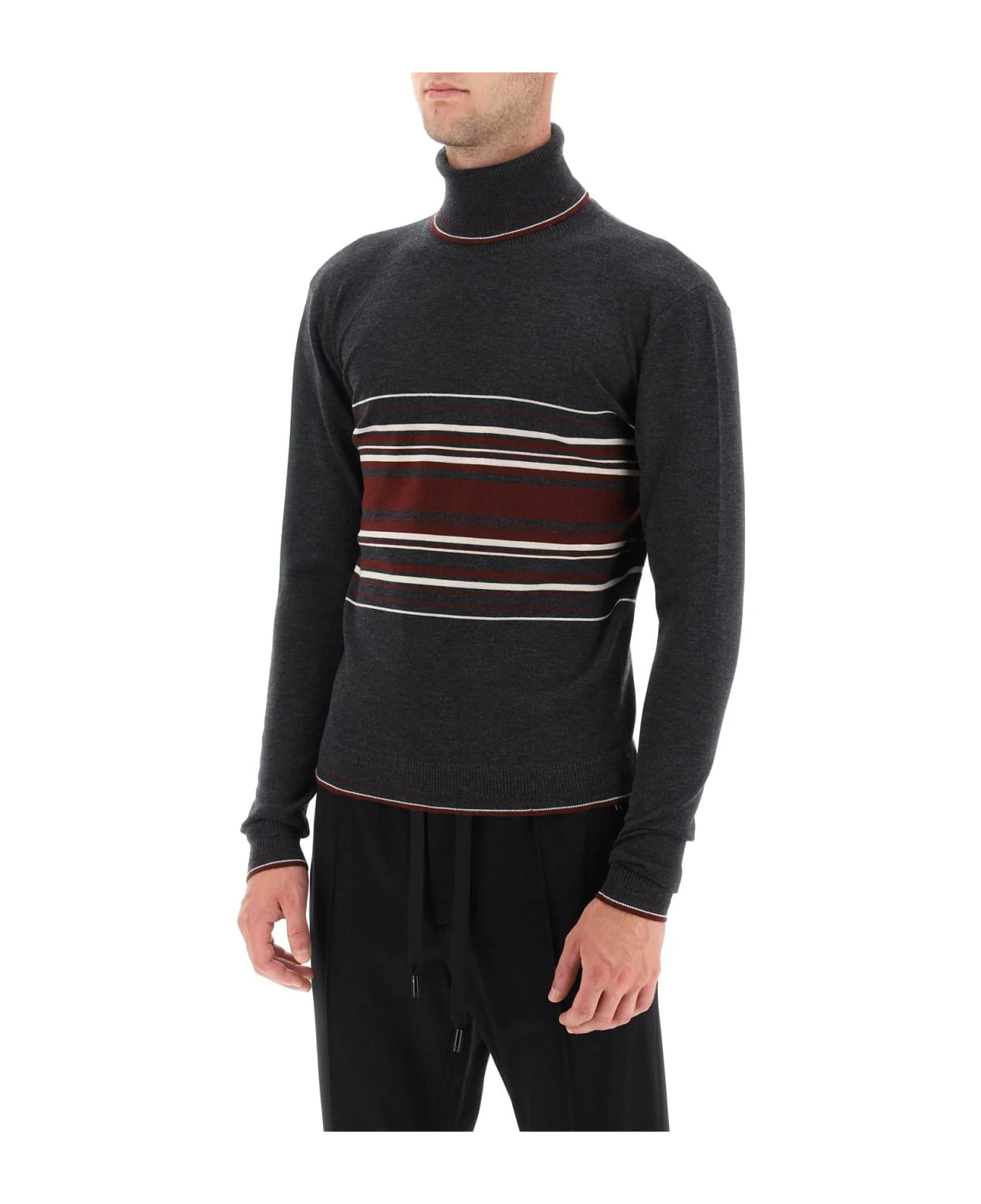 Dolce & Gabbana turtleneck sweater knitted from fine virgin wool to a fitted silhouette with slightly dropped shoulders. It is embellished with stripe motifs and finished with ribbed trims. The model is 187 cm tall and wears a size IT 48.