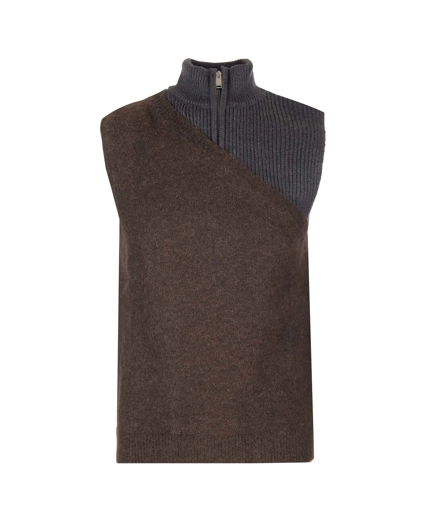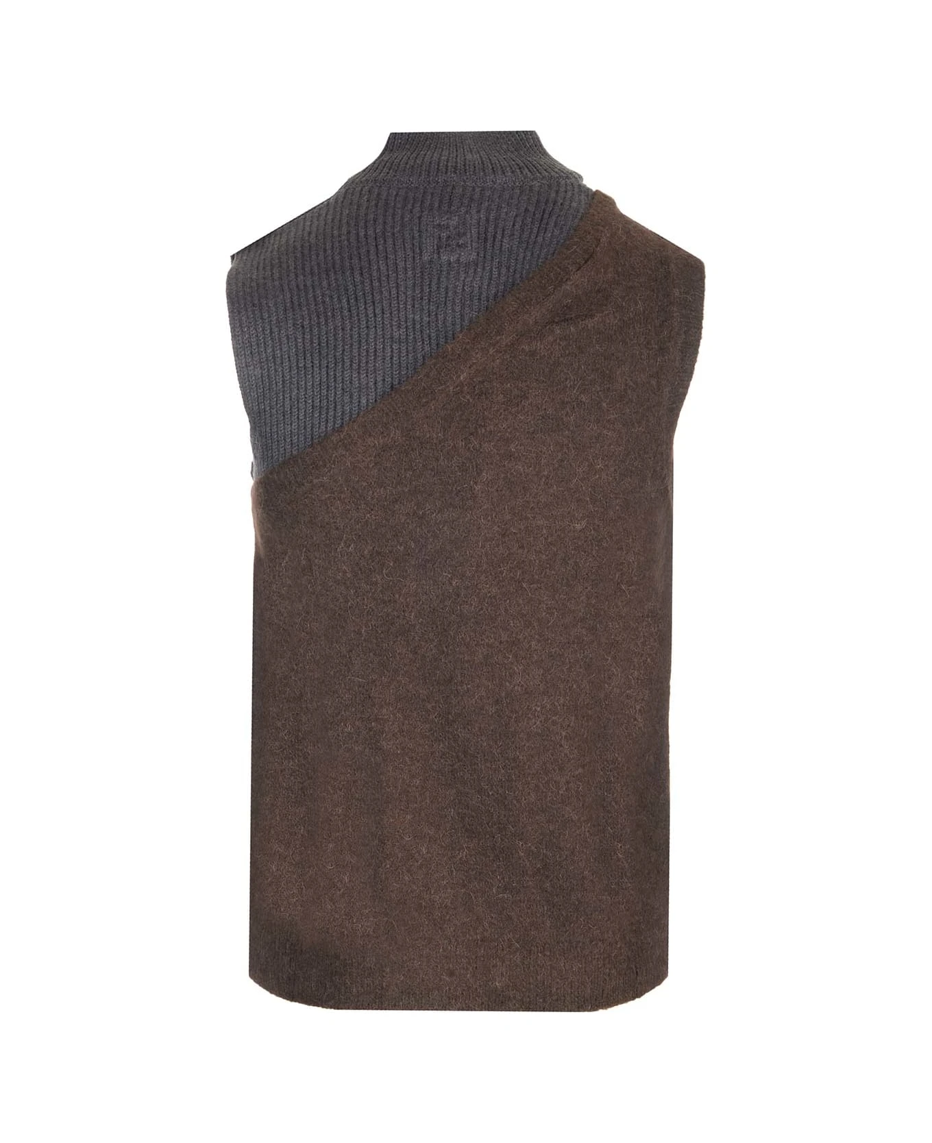 Waistcoat with high collar in gray wool yarn with english rib knit and one-shoulder insert in alpaca blend by Fendi with ribbed edges and zip closure.
