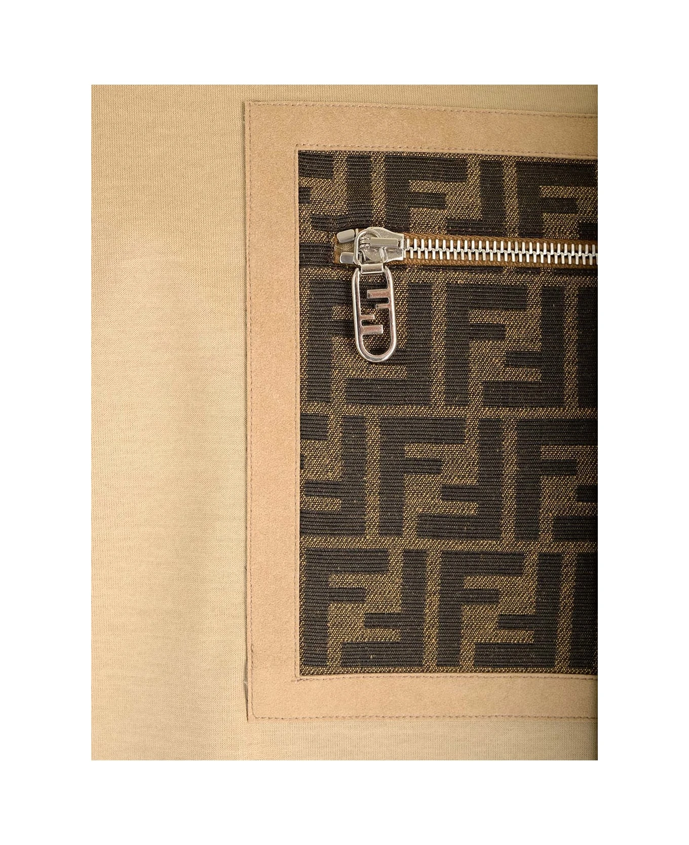 Fendi crew-neck T-shirt in beige cotton jersey with pocket in contrasting FF jacquard fabric
