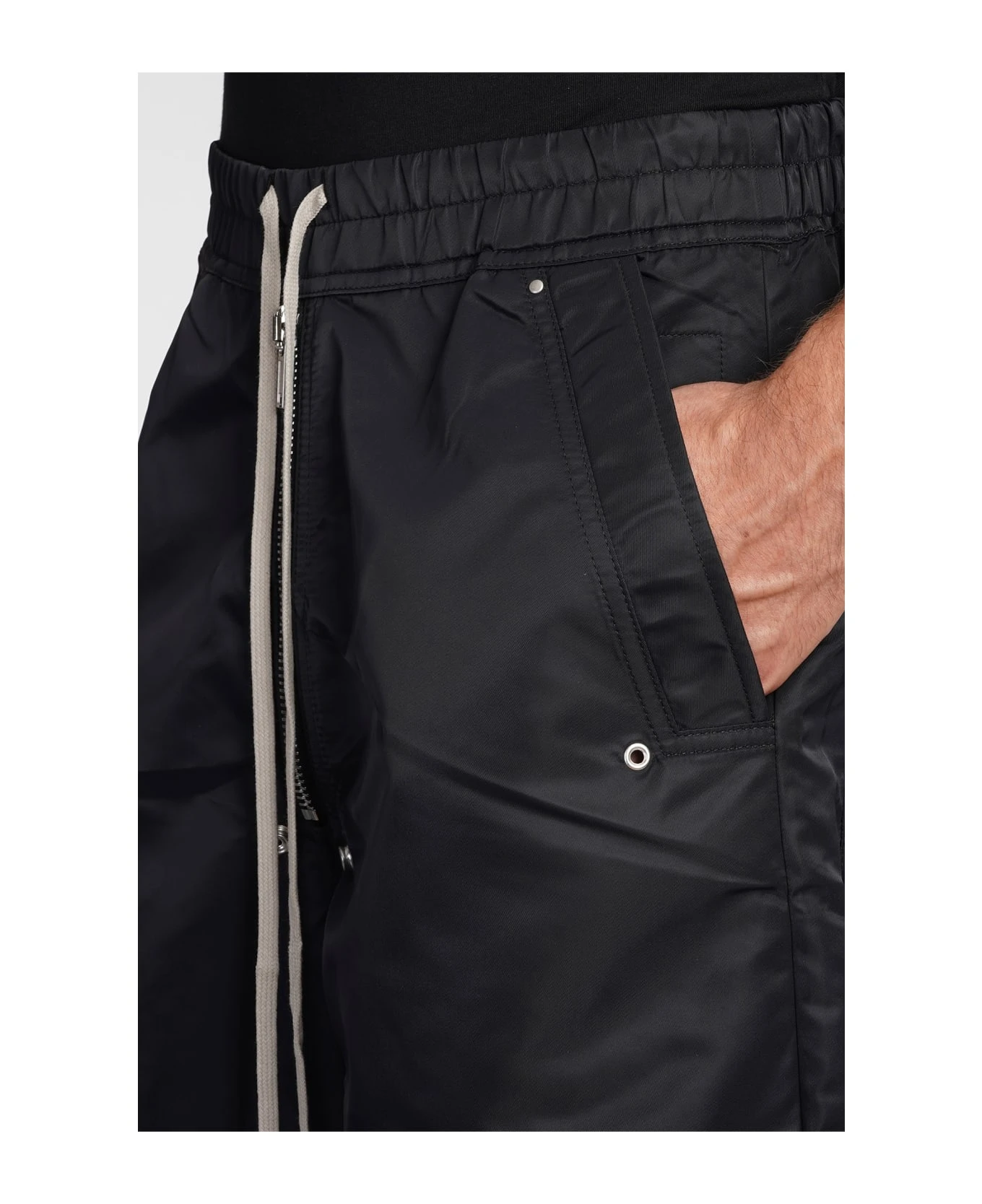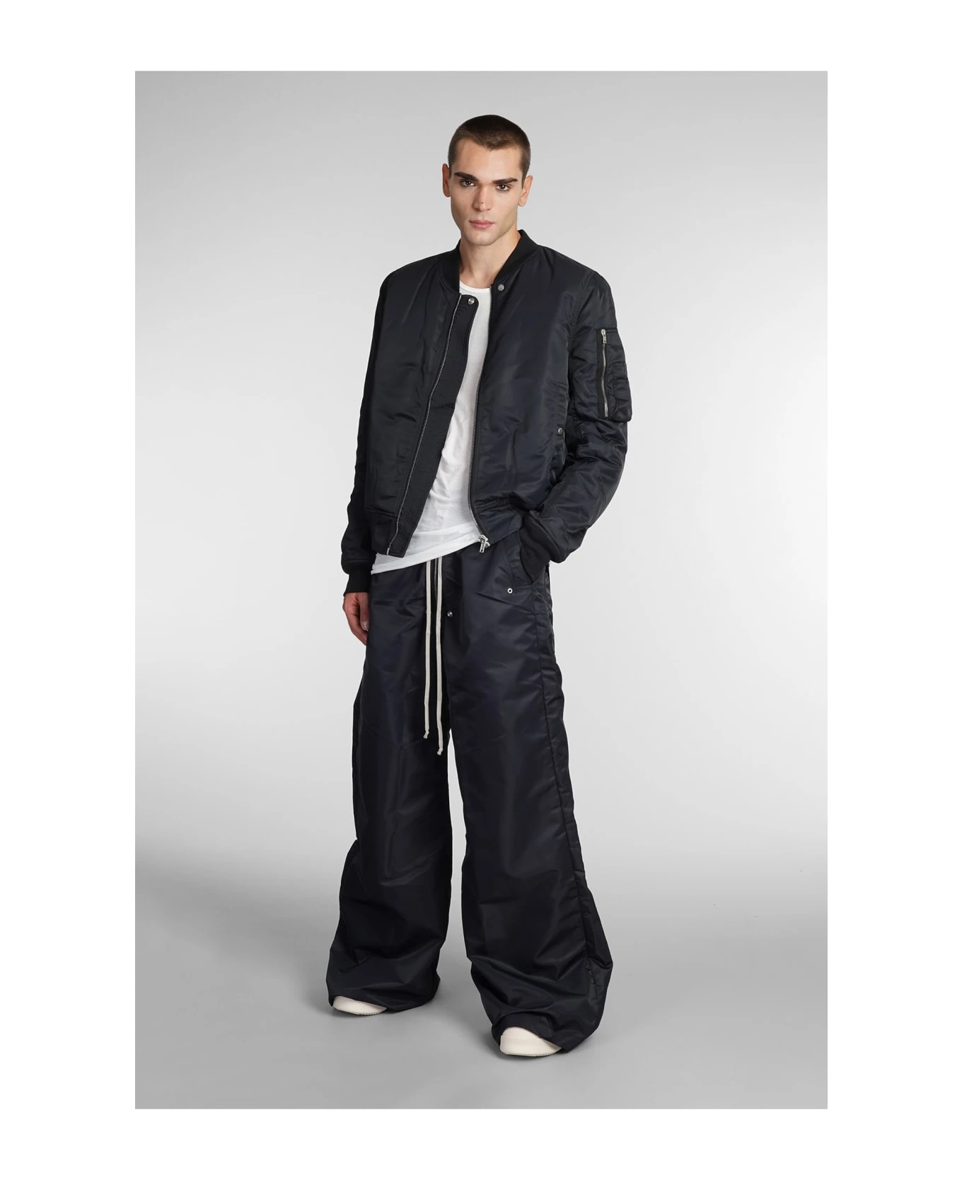 Geth belas Pants in black polyamide, elastic waist, Drawstring laces, front zip closure, flared, four pockets, 100% polyamide, Made in Italy, Model is 1. 83 and wears size S