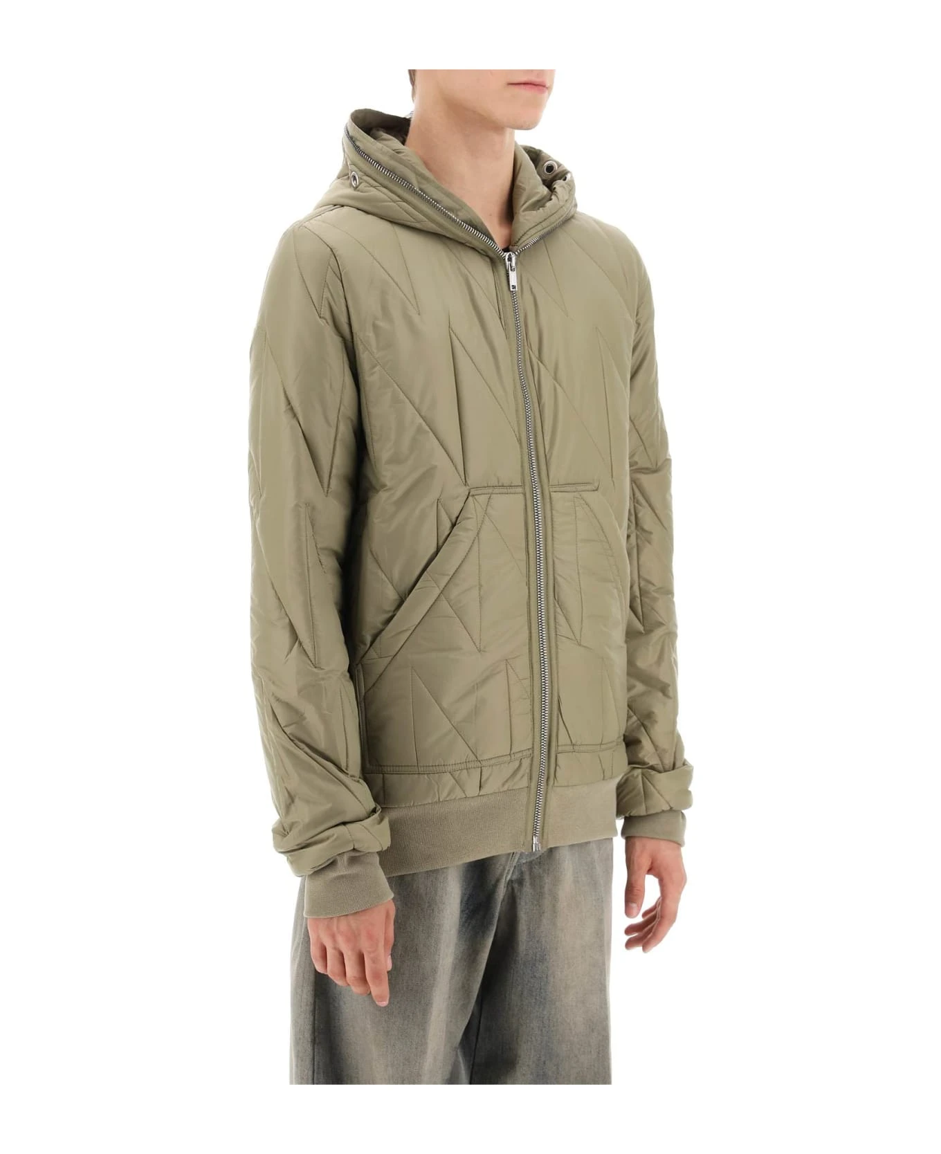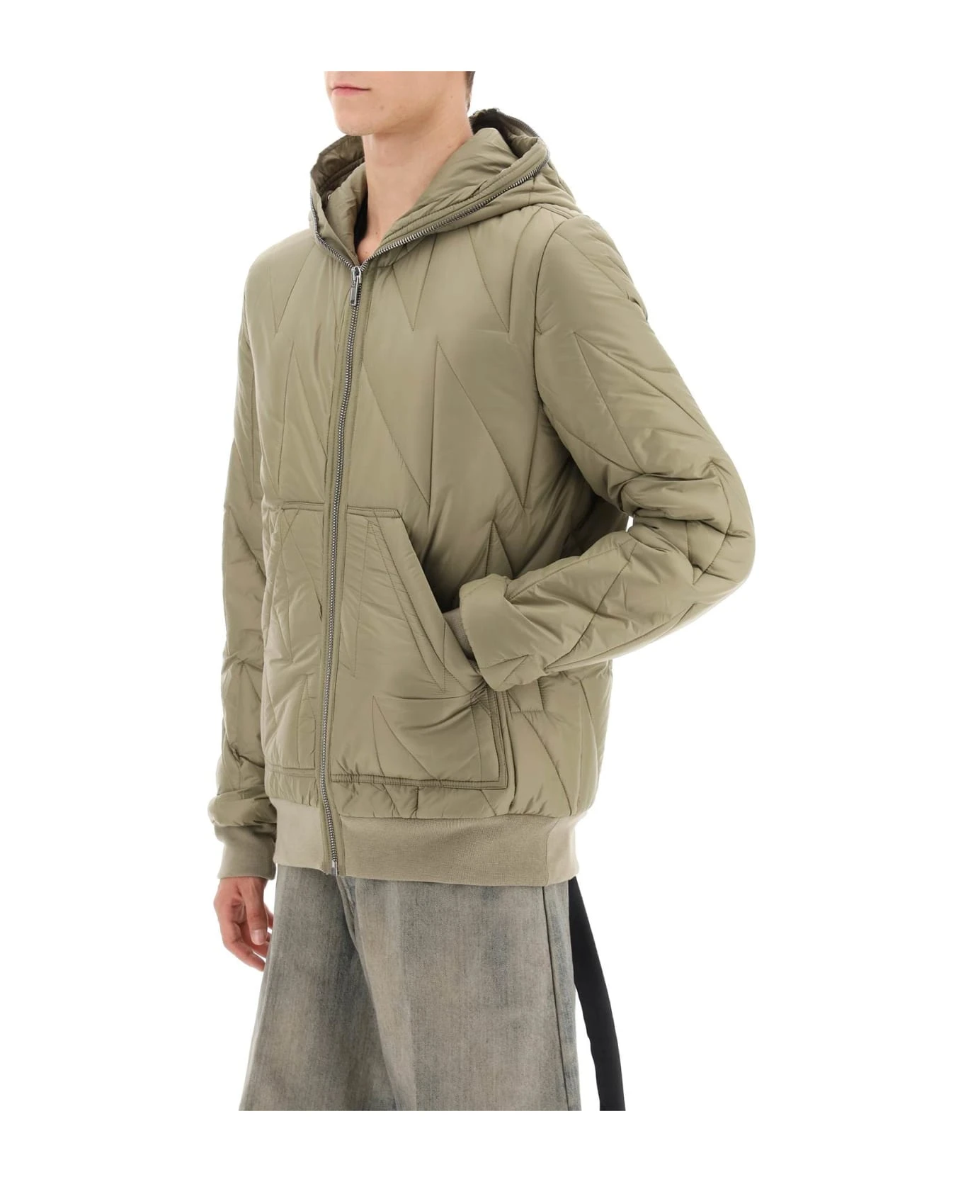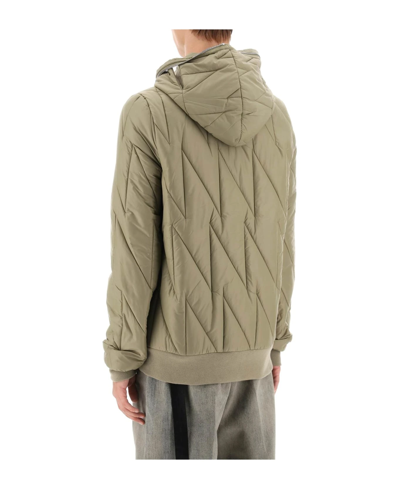 Drkshdw light padded jacket made of recycled nylon with graphic quilting. This hooded style can be zipped up completely to cover the face, the hood is conveniently designed with openings for the eyes and ventilation eyelets. It is finished with ribbed cuffs and hem, split pouch pockets, and an internal logo tape. Synthetic padding. The model is 187 cm tall and wears a size M.