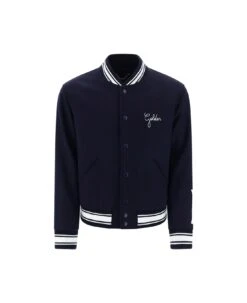 Fleece wool golden jacket by golden goose, snap button front closure, contrasting ribbed hem, contrasting ribbed cuffs, high ribbed crew neck, contrasting embroidered brand signature on front, two side welt pockets.