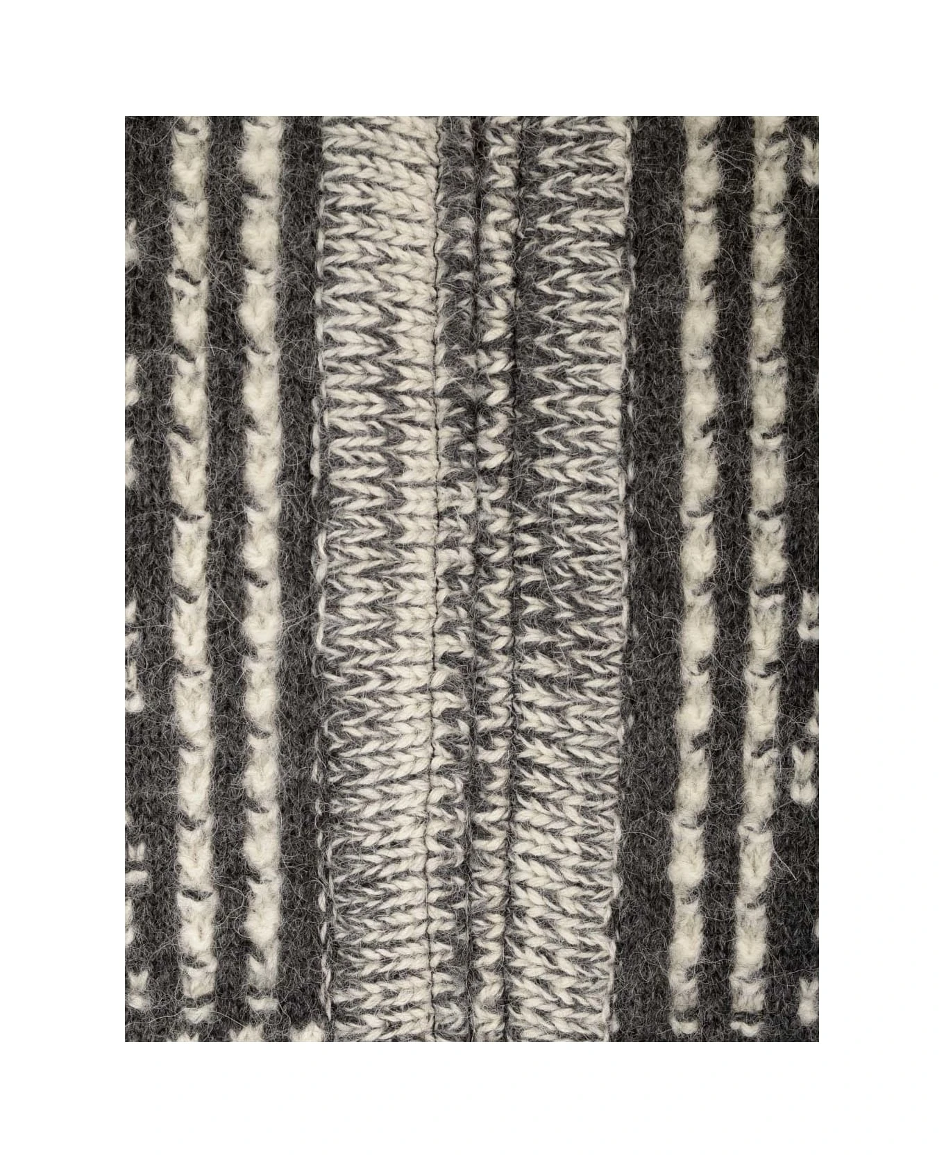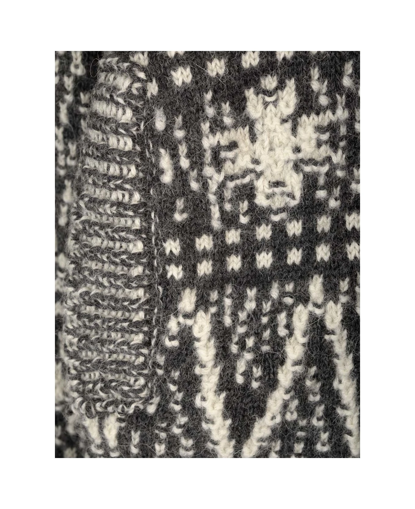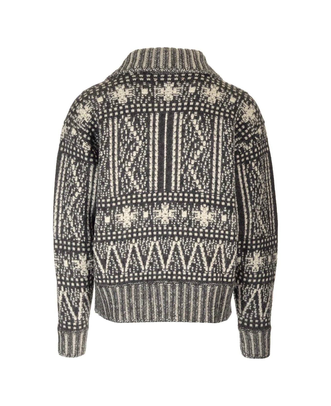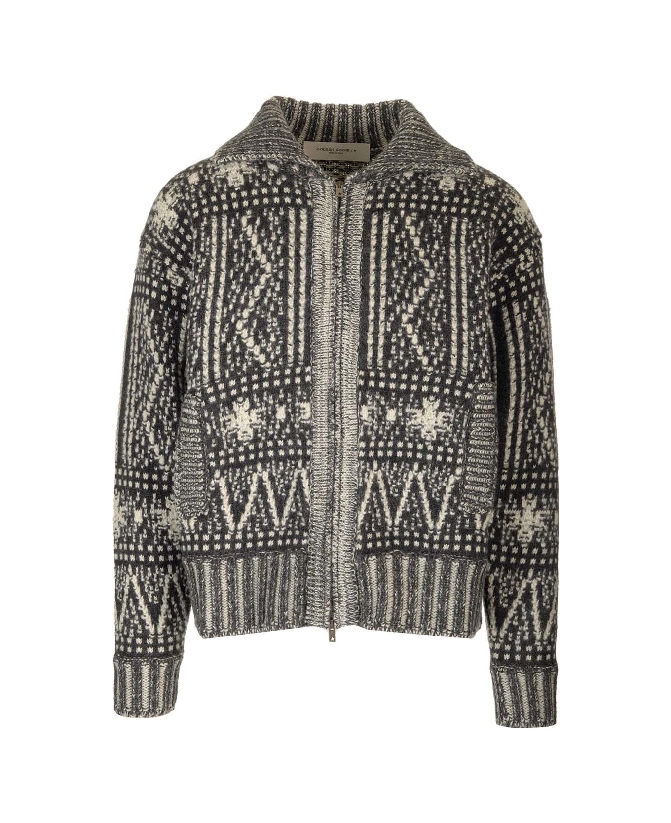 White, gray and black pattern ‘Journey’ cardigan in alpaca and wool by Golden Goose with zip closure and ribbed hem and cuffs.