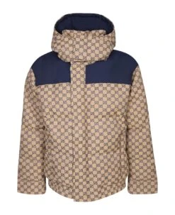 High neck. Removable hood. Concealed front fastening. Two side zip fastening pockets. All-over GG motif. Contrasting details. Padded. Color: beige/ blue