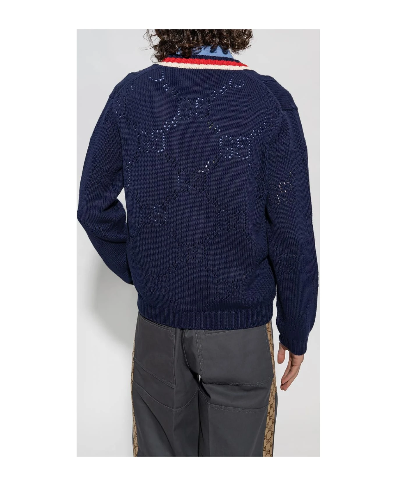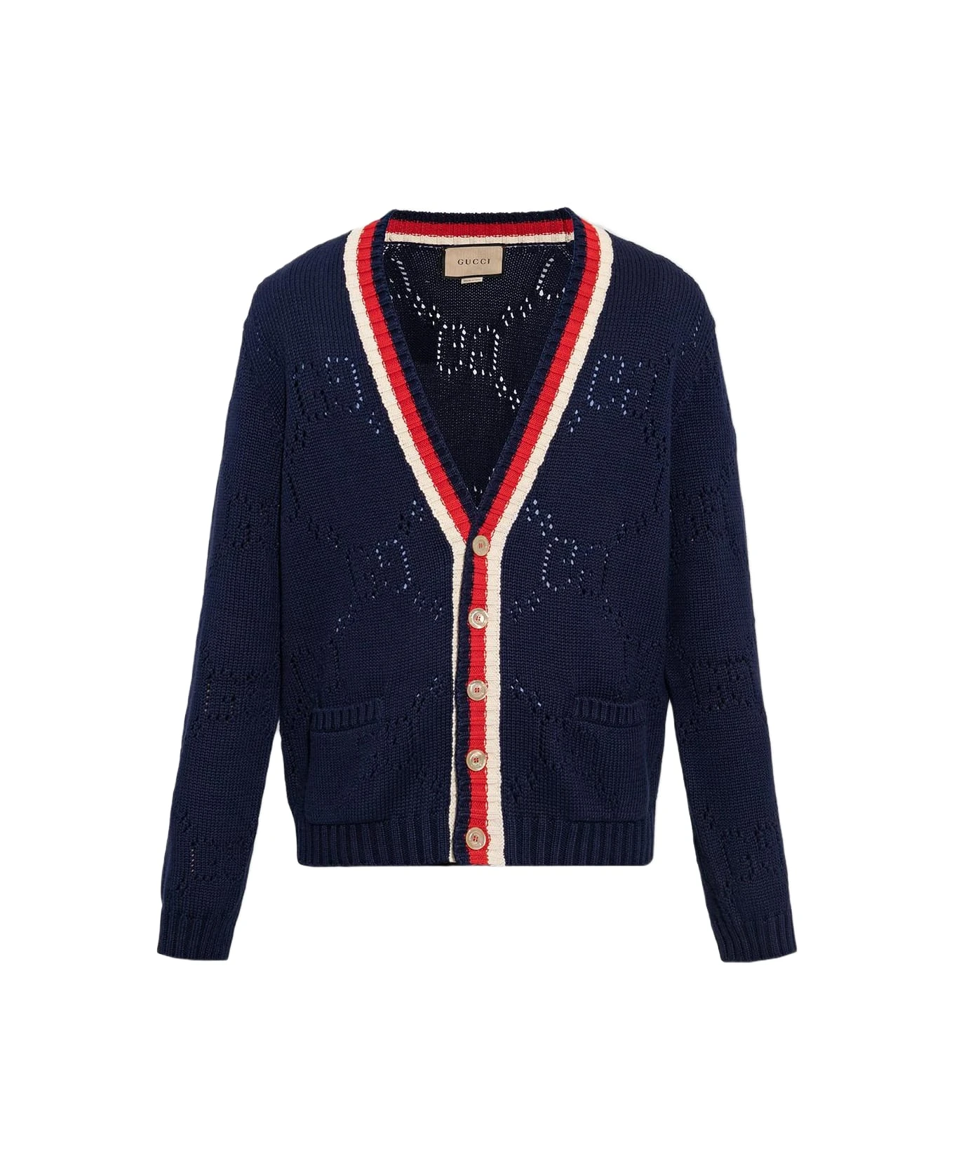 Navy blue cardigan from Gucci. Crafted from cotton accentuated with a monogram pattern, this style fastens with buttons and features a V-neckline, two slip pockets and red and white ribbing on the bottom hem and cuffs.
