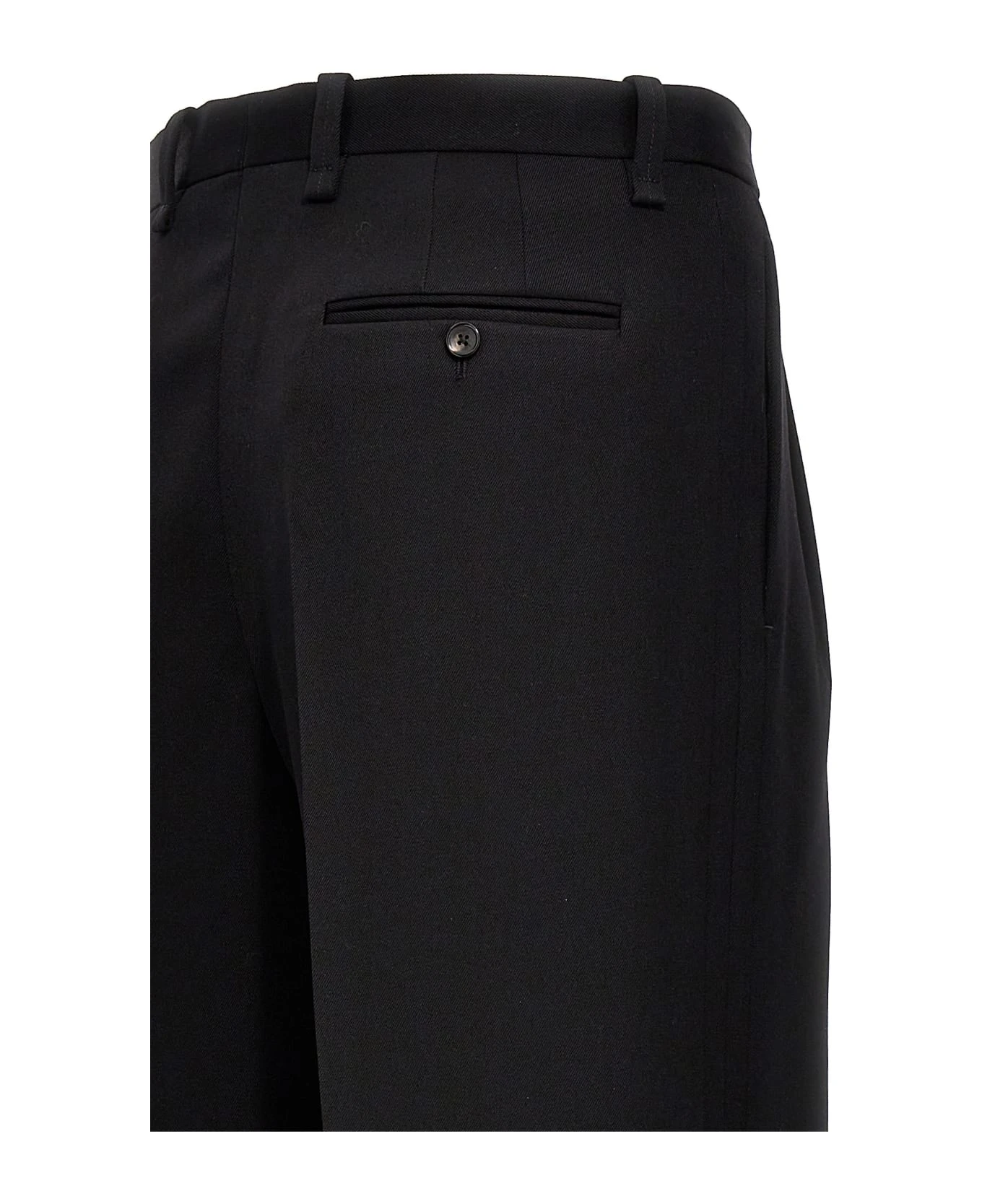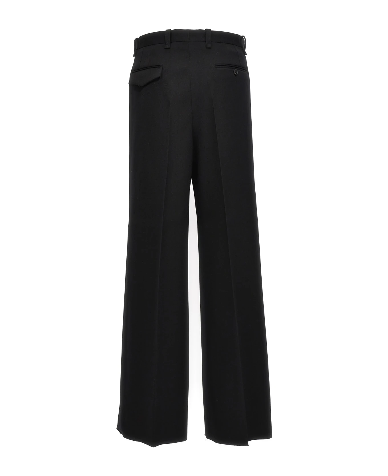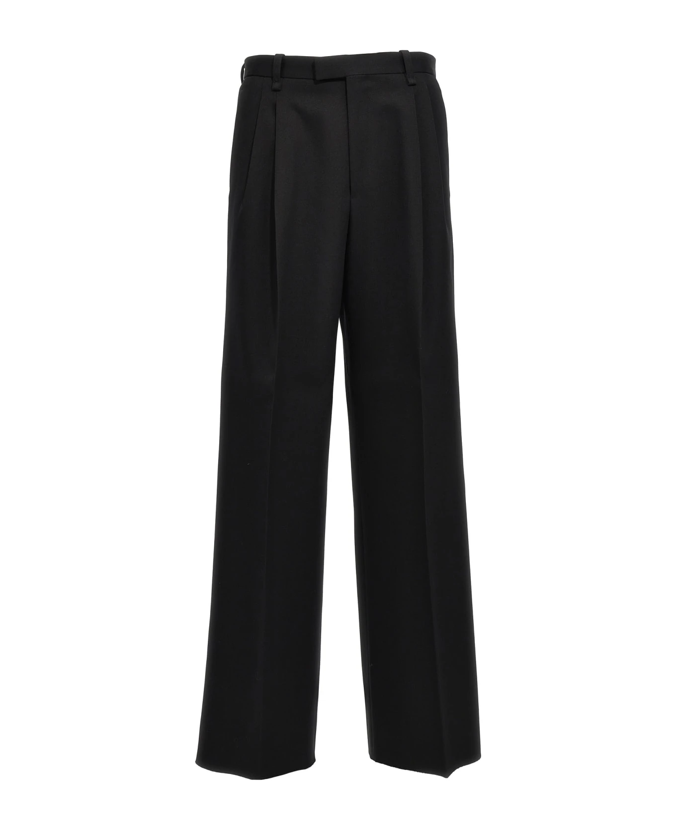 Wool pants with front pleats and a central pleat, loose leg, a zip, hook-and-eye and button closure, pockets.