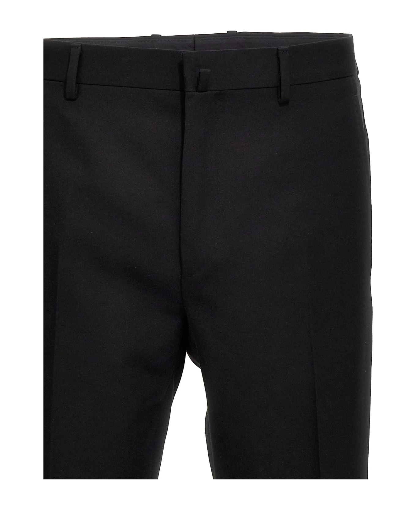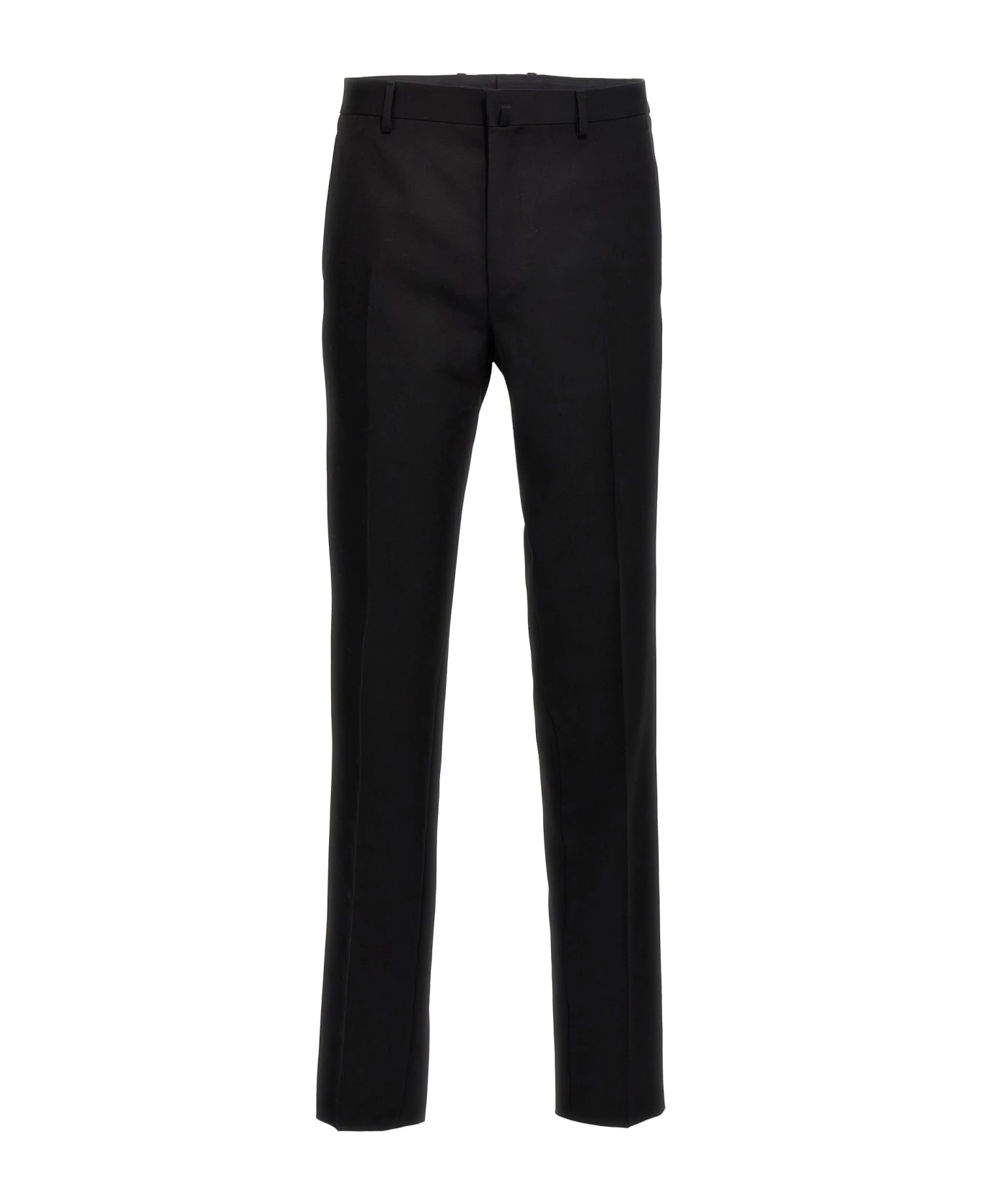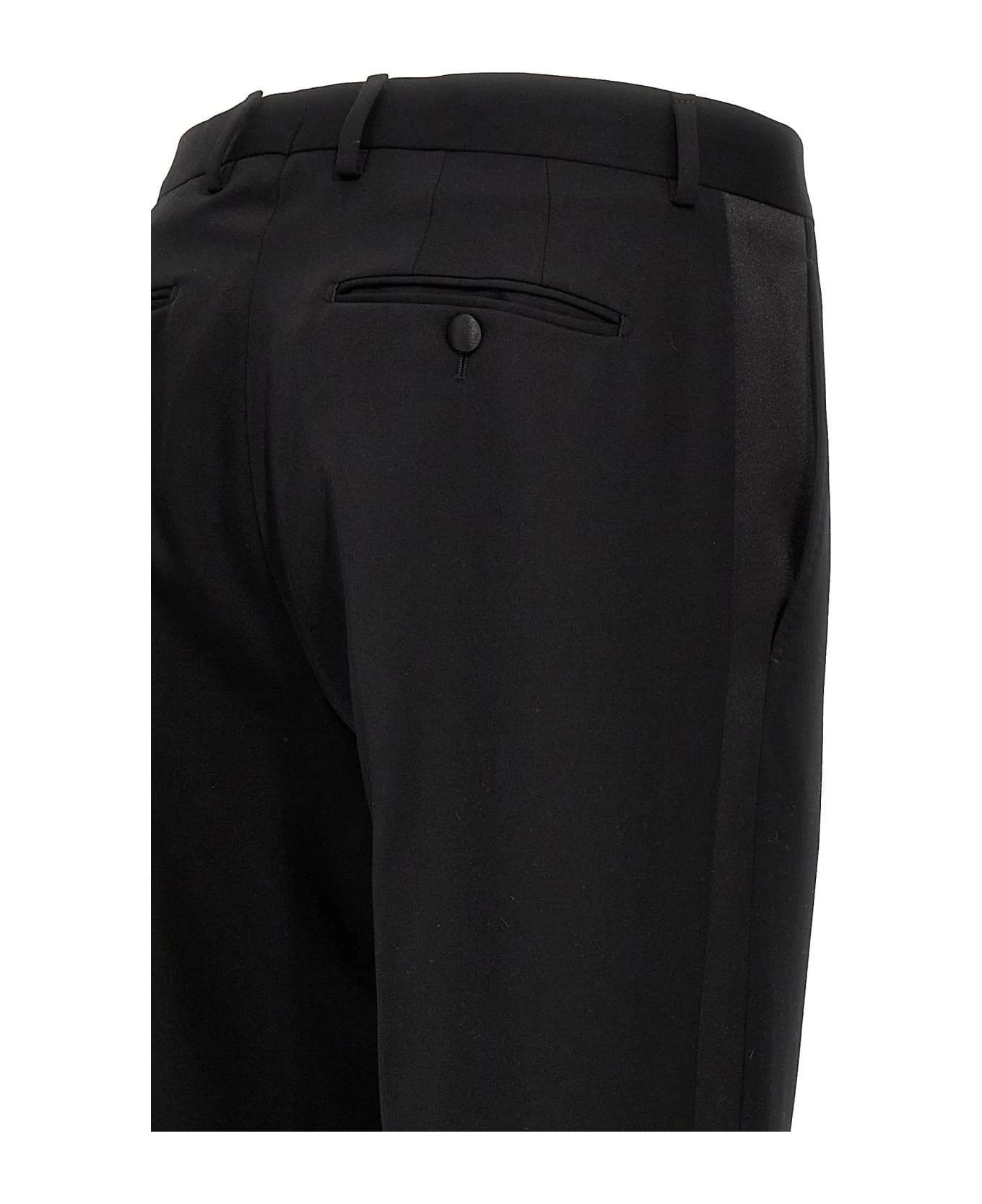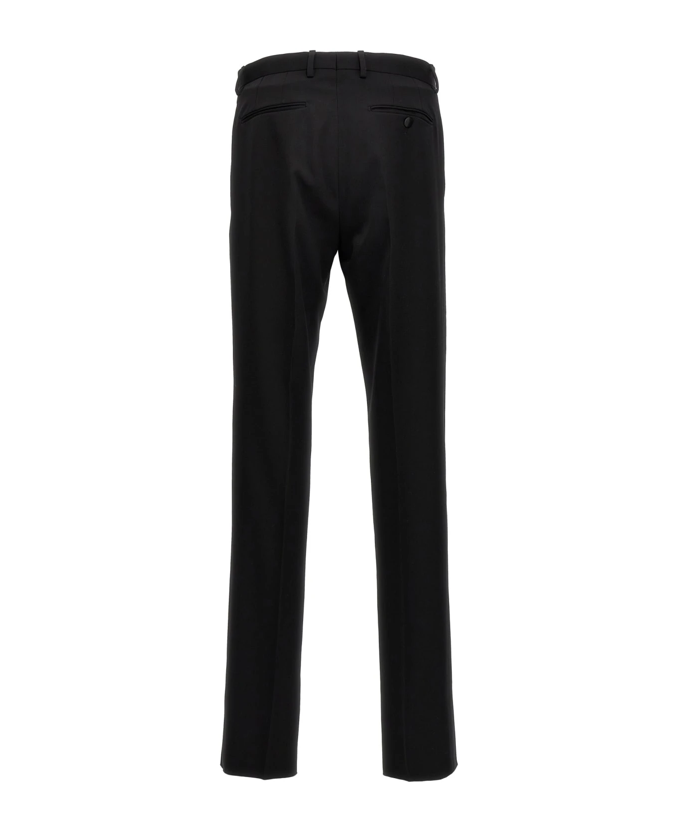 Tuxedo wool pants with satin side bands, hook-and-eye zip and button closure, pockets.