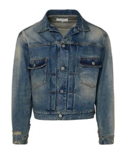 Contrast stitching, destroyed details on the sleeves, front pockets with flap and buttons, adjustable straps at the waist on the sides, four stitcher at the back