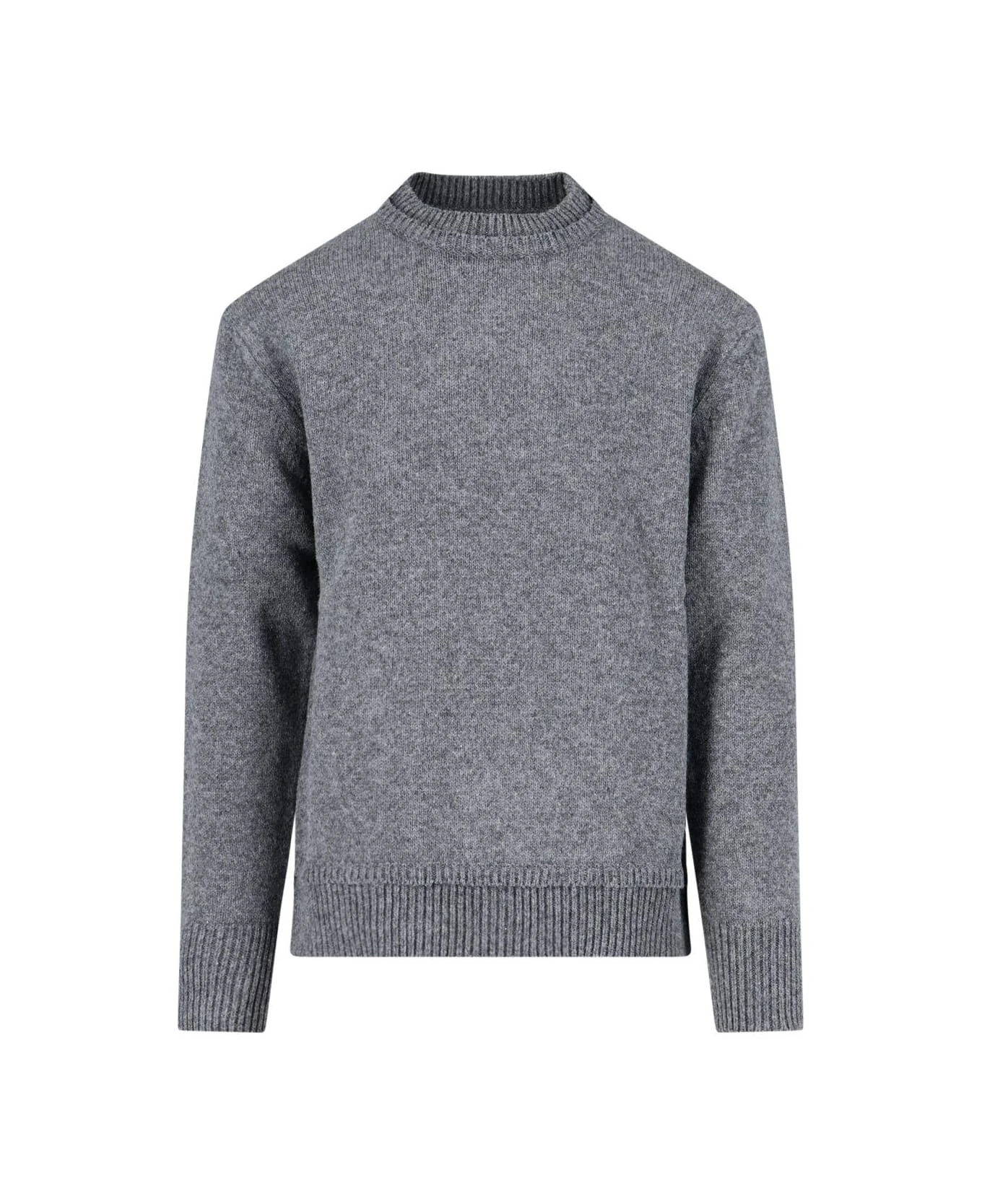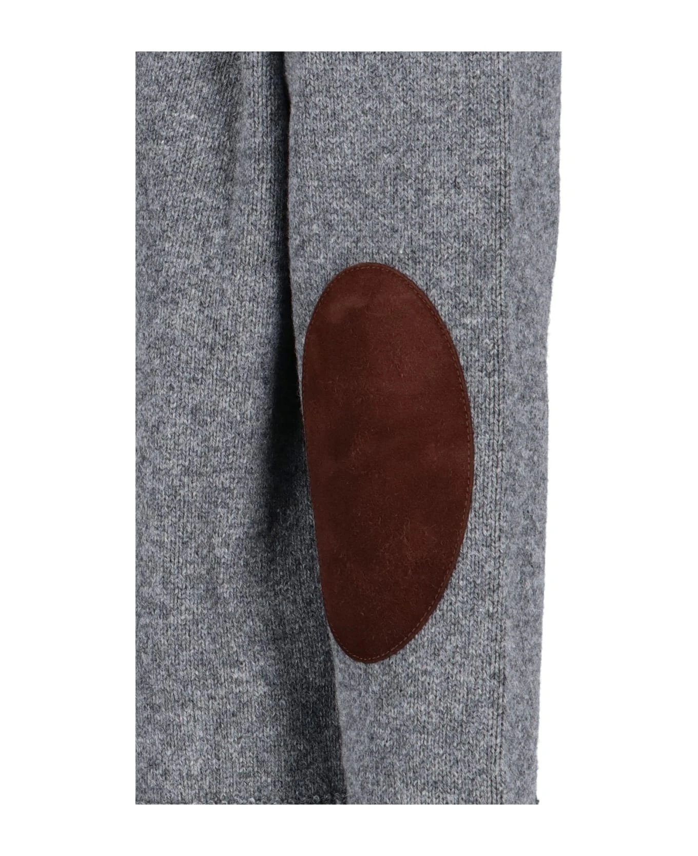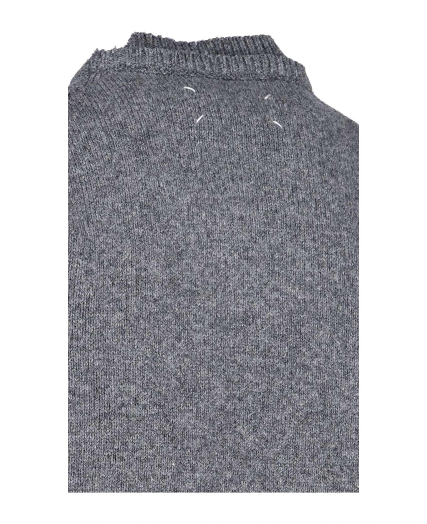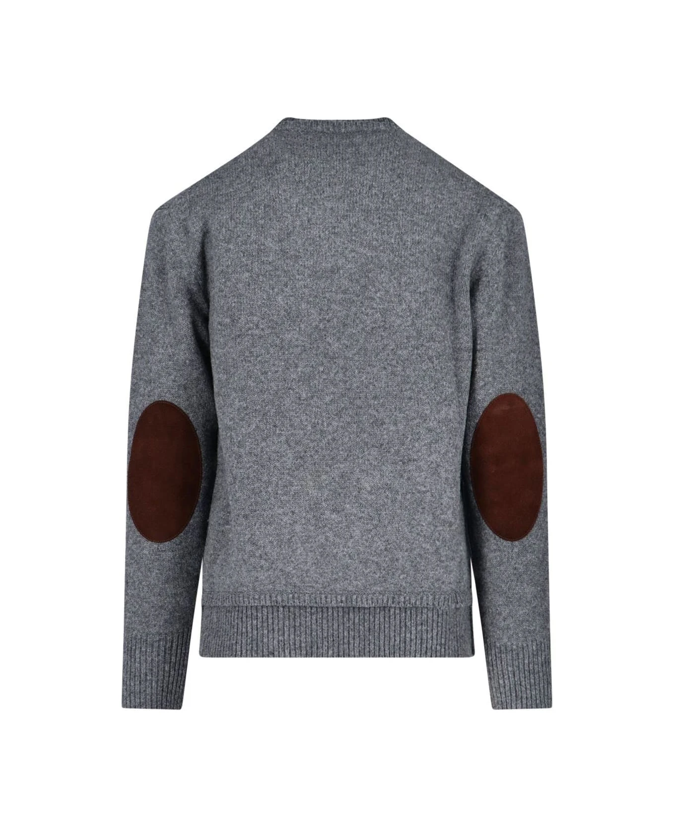 Maison Margiela Patches Sweater, wool, linen and cotton blend, gray color, crew neck, double collar detail, long sleeves, brown elbow patches detail, iconic white back stitching, ribbed collar, hem and cuffs.