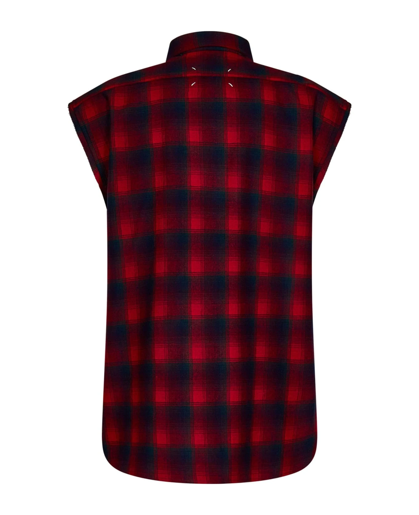 Red Pendleton check wool sleeveless shirt, front buttons closure, pointed collar, pendleton logo patch at placket, white Four stitches detail at back, patch pocket at chest, side slits at bottom, rounded hem, mother of pearl buttons