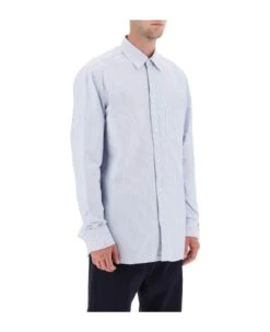 Blue cotton denim shirt with all-over Body Scan motif. It features classic collar, front button closure, a patch pocket on chest and buttoned cuffs.