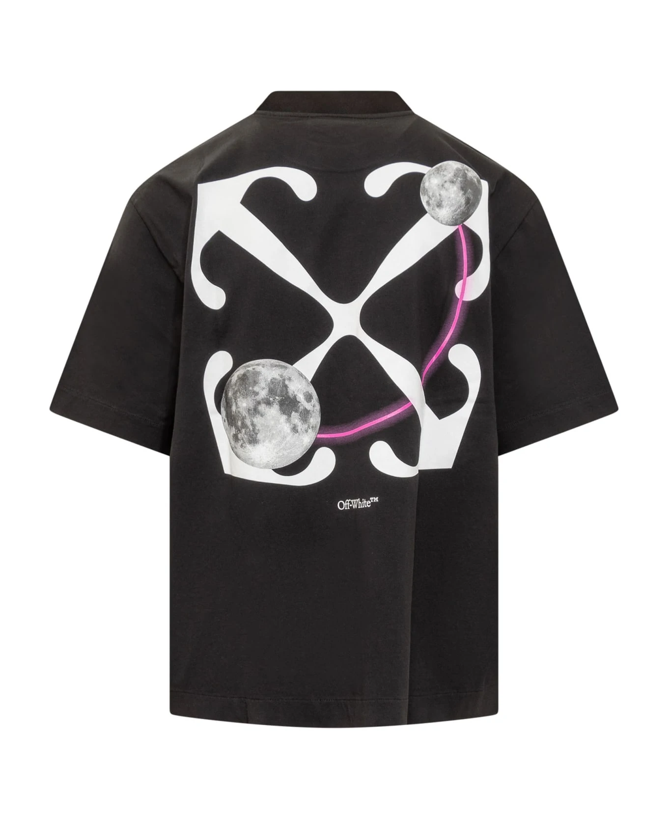Black T-shirt. Crew neck. Logo printed on the front and back. Ribbed collar.