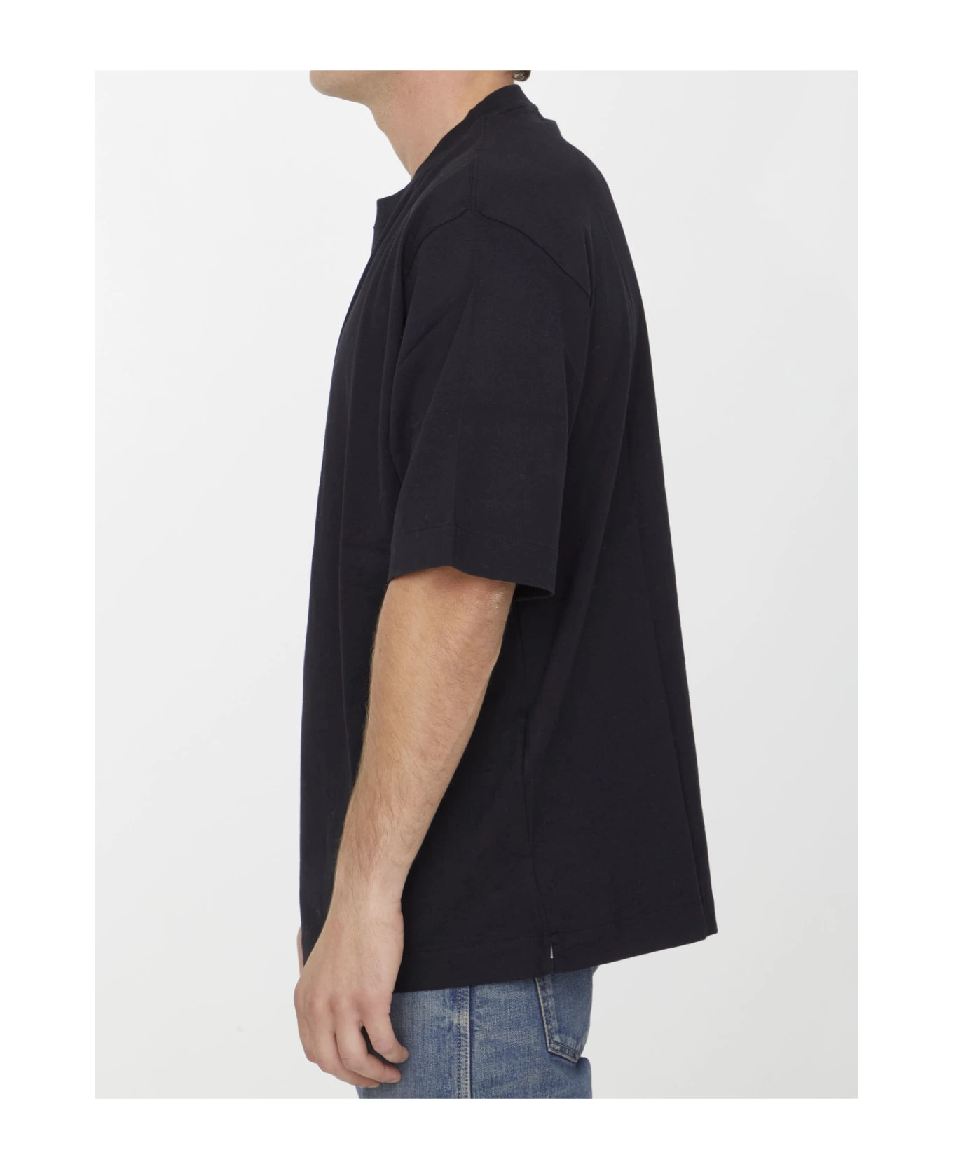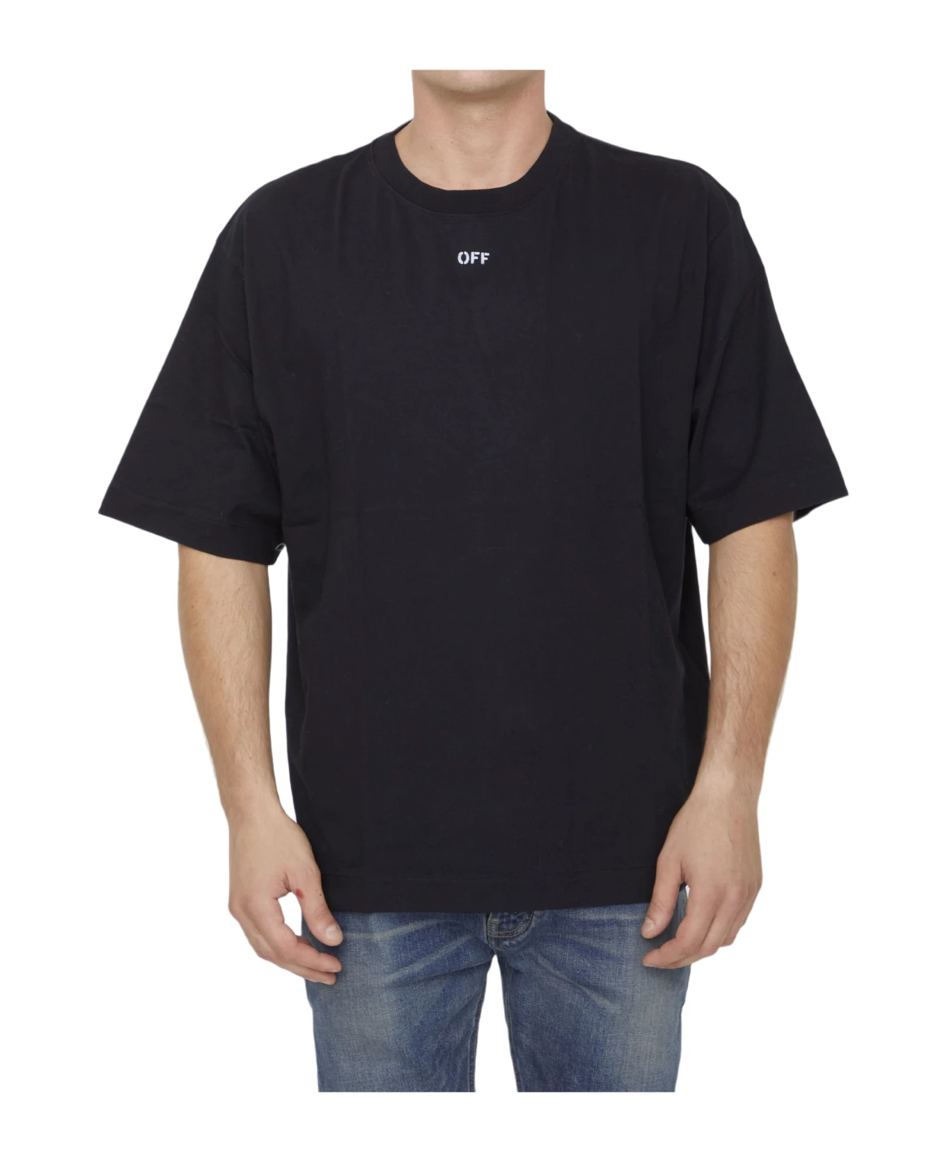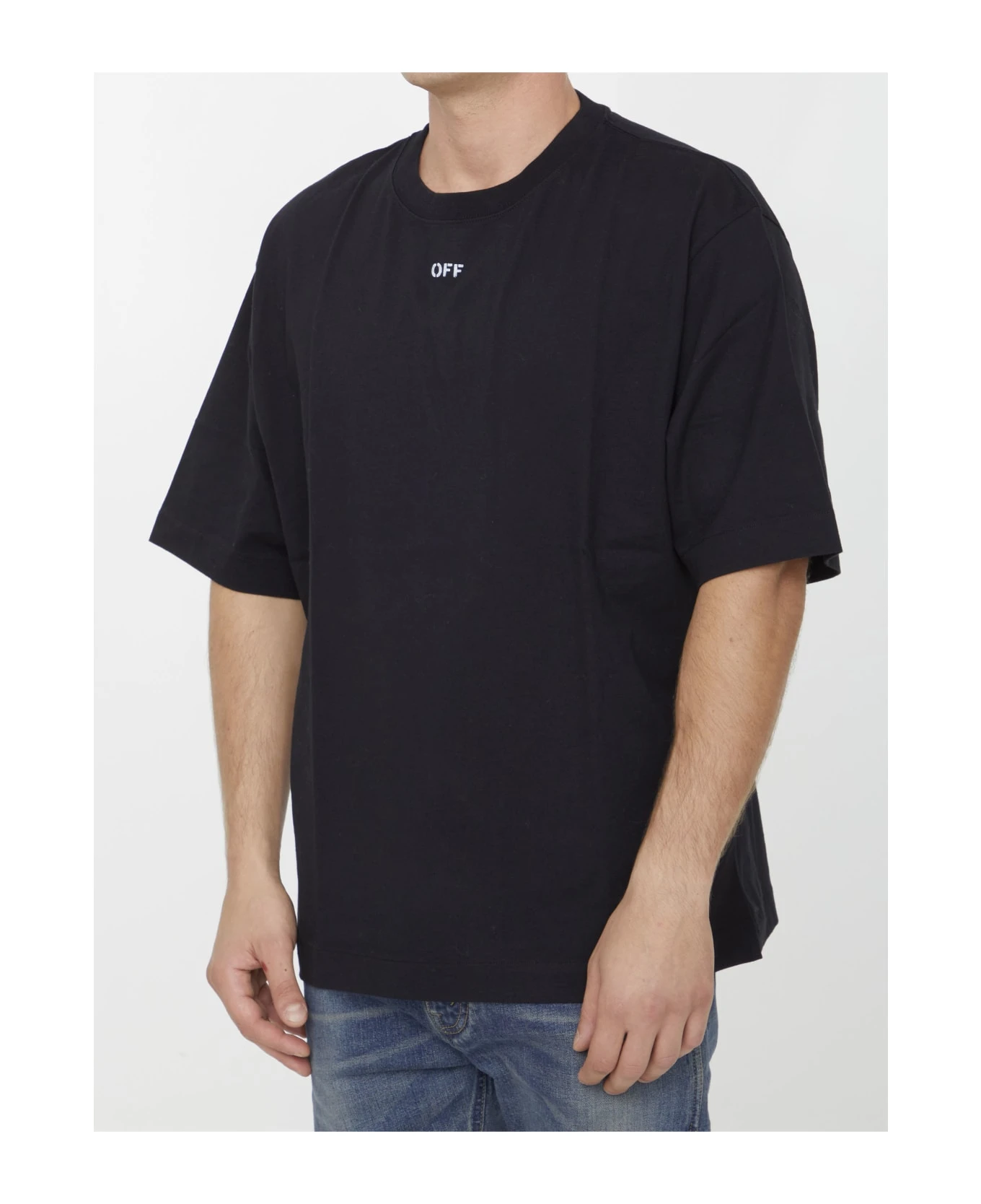 Short-sleeved crewneck t-shirt in black cotton with Off logo on chest. Ribbed neck. Wide fit.