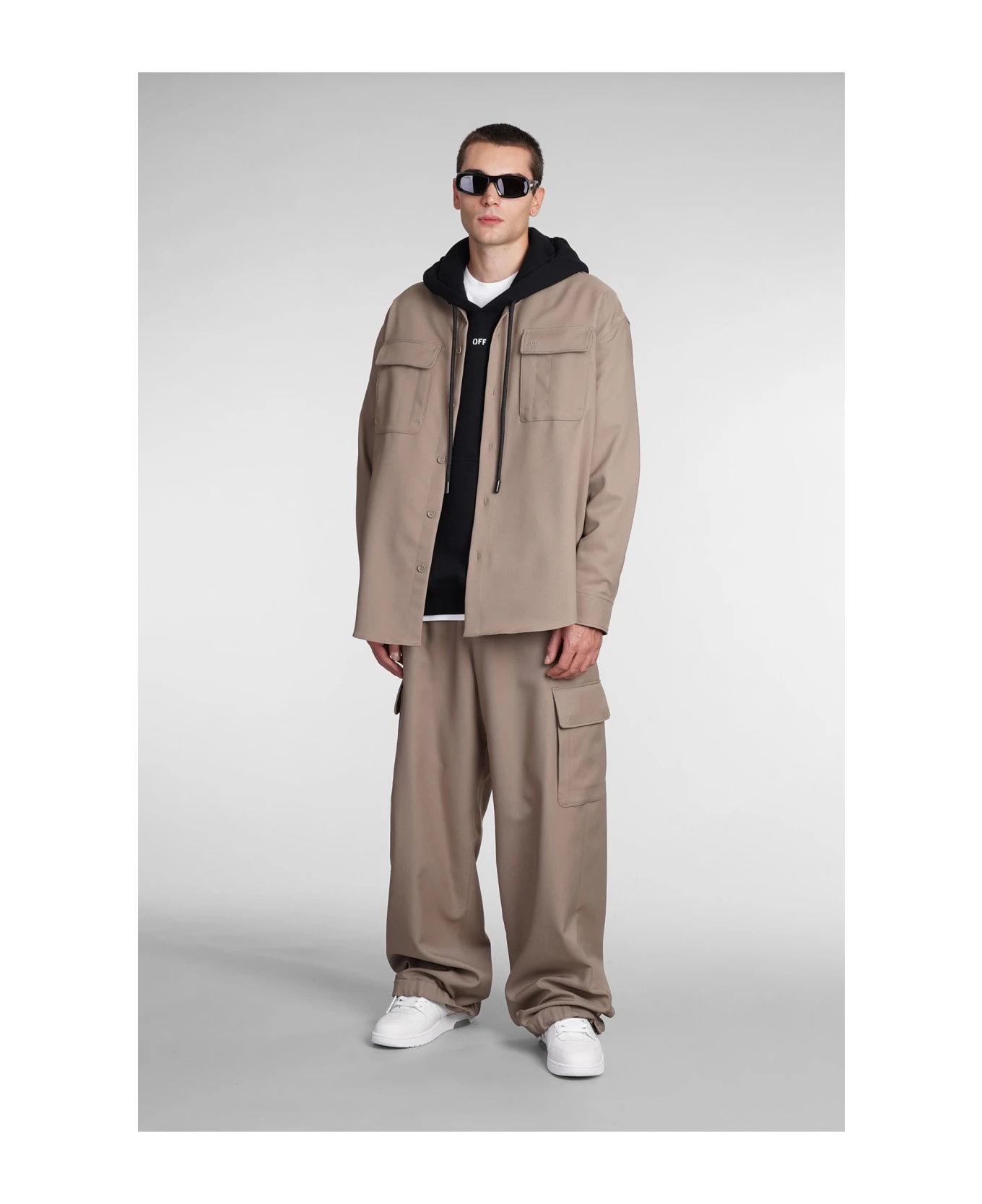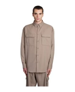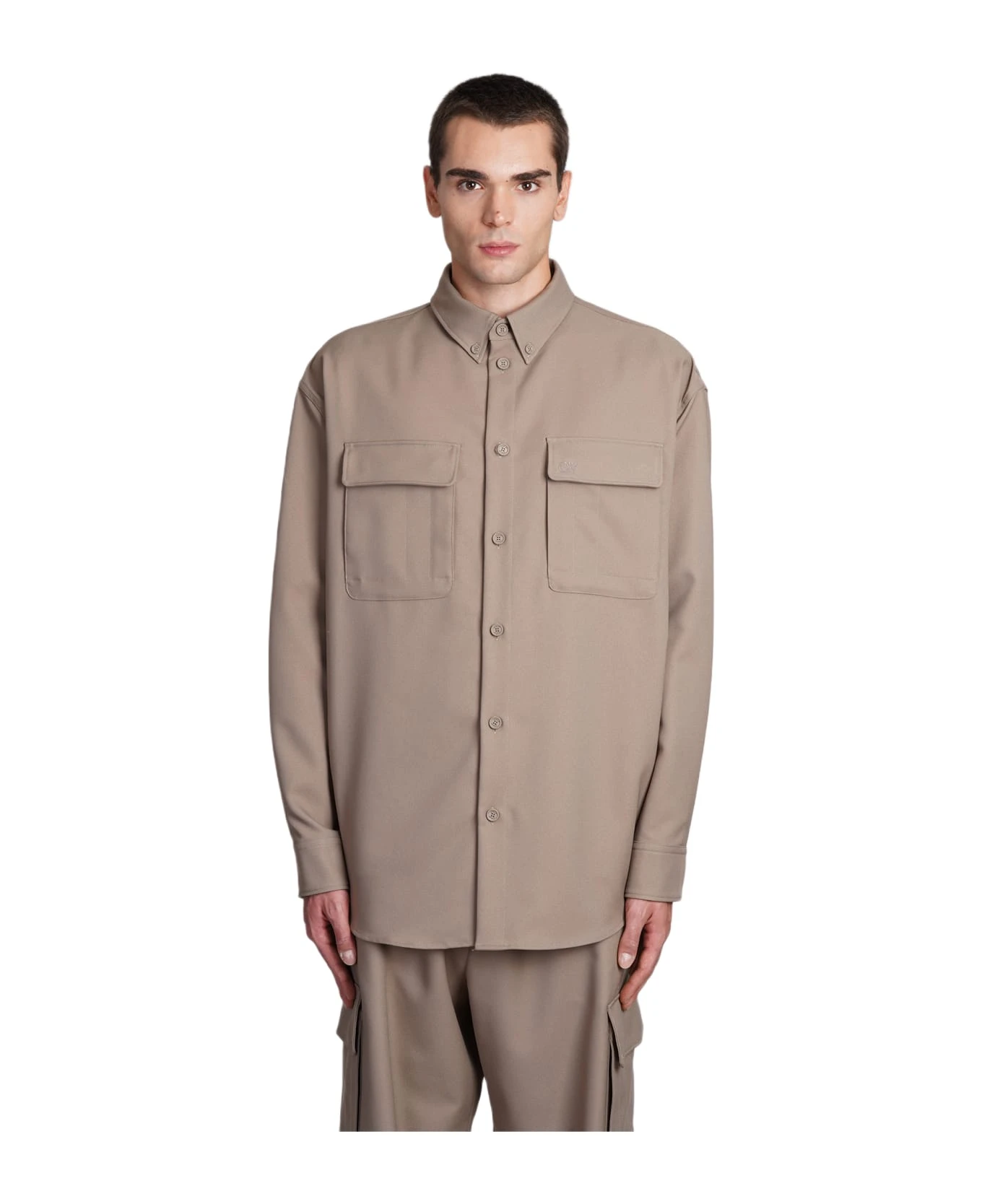 Shirt in beige polyester, frontal buttoning, collar, long sleeves, frontal pockets, oversized fit, 100% polyester, Made in Italy, Model is 183 cm and wears size L