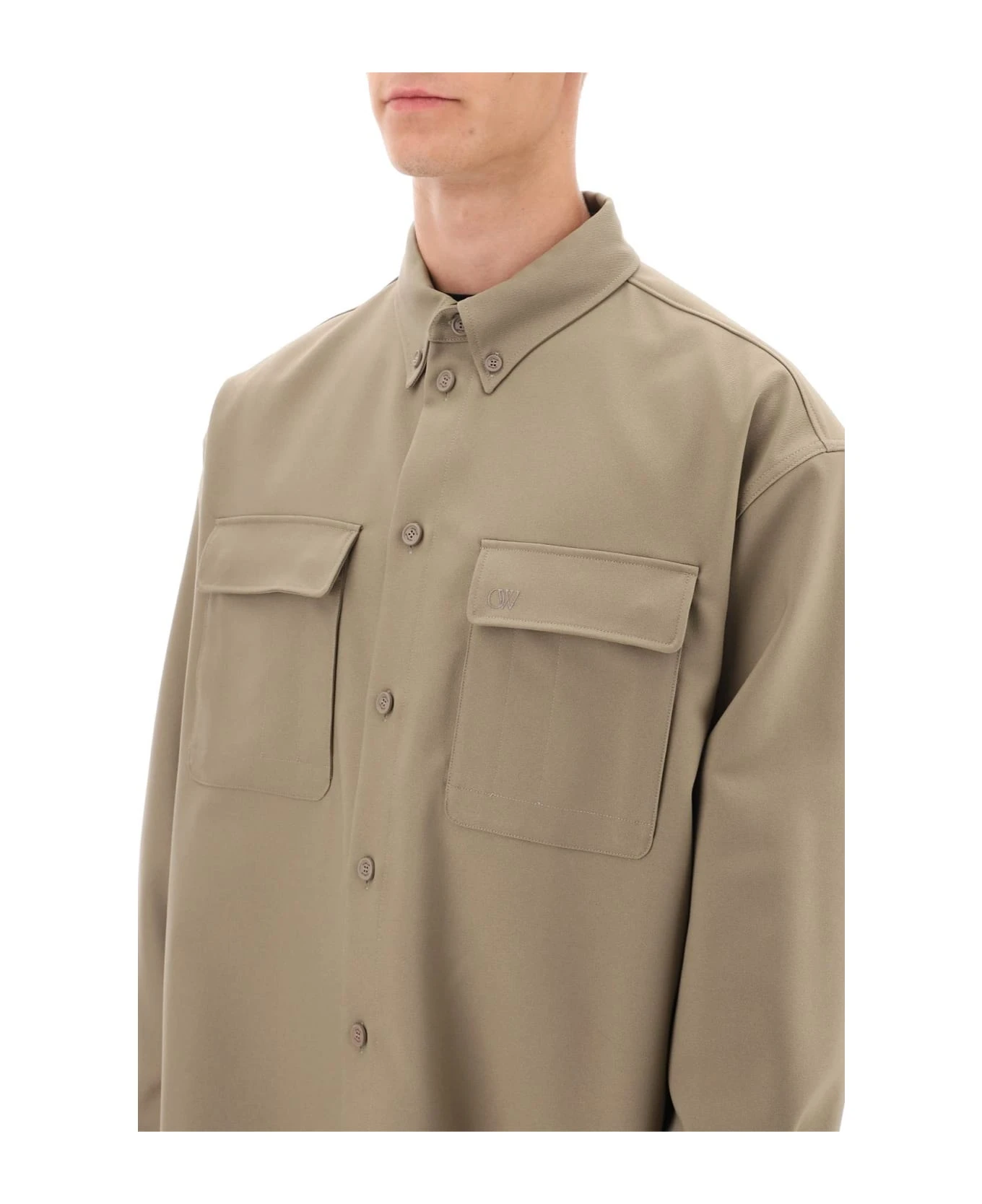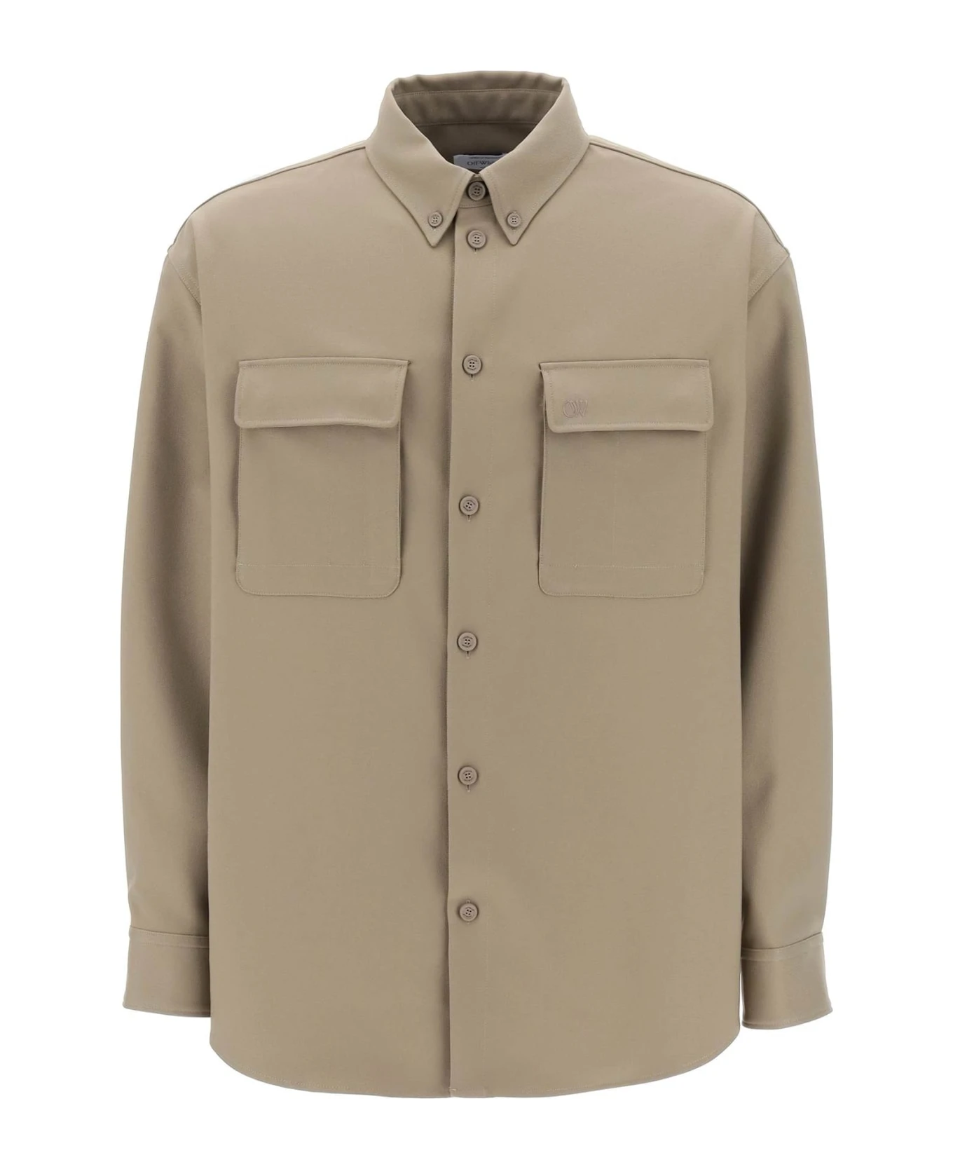 Off White overshirt crafted in technical drill. It features button-down collar, front button fastening, patch pockets with pen-holder compartment at chest and curved hemline. Oversized fit enhanced by dropped shoulders. The model is 187 cm tall and wears size L.