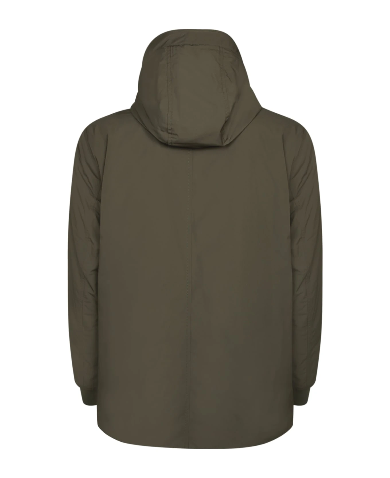 High neck. Drawstring hood. Front zip and button fastening. Long sleeves. Logo patch to the sleeve. Two side zip fastening pockets. Internal pocket. Ribbed cuffs. Drawstring waistband. Color: military green
