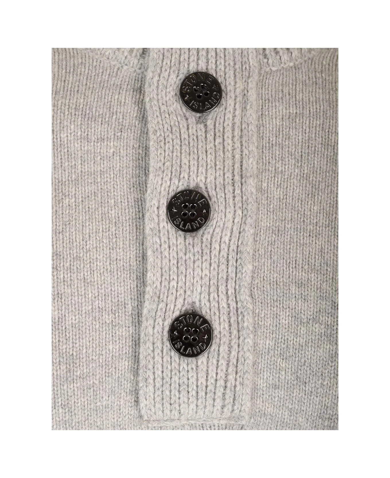 Pearl gray wool blend sweater by Stone Island featuring a stand-up collar with black button fastening, ribbed trims and logo patch on the sleeve.