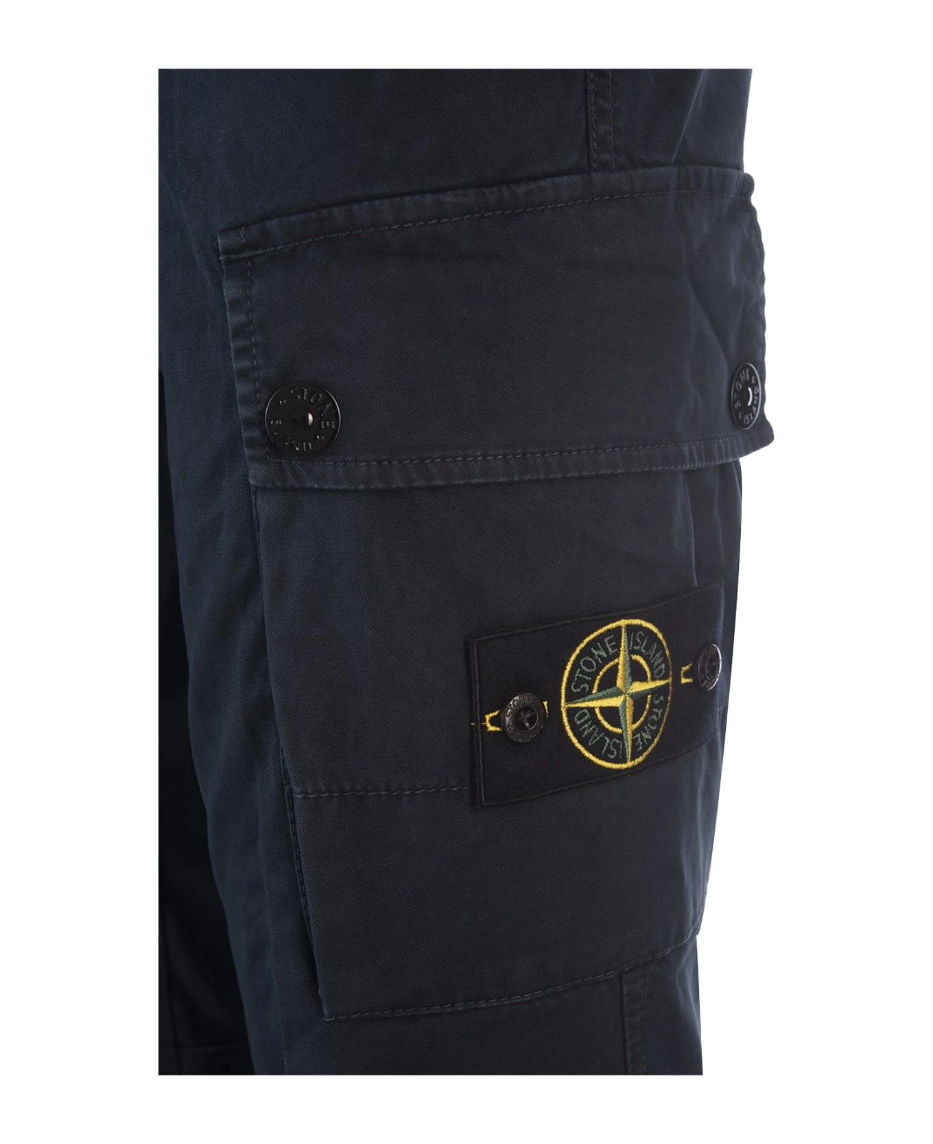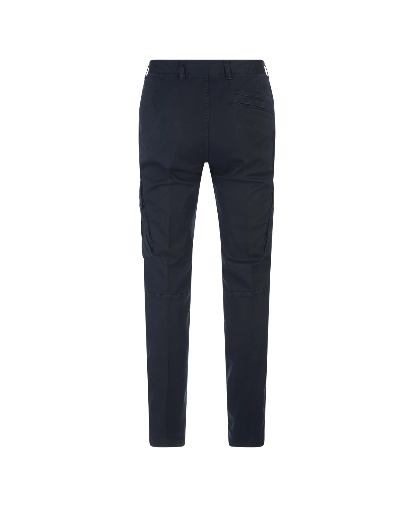 Slim fit cargo trousers by Stone Island in navy blue broken twill stretch cotton, garment dyed with an “OLD” effect: an exclusive treatment of dyeing and subsequent fading on the finished garment to create a slightly worn and three-dimensional look. Flush pockets, closed by concealed zip. On the back, one welt pocket with concealed snap fastener. Bellows pockets on the legs, fastened with flaps and snap fasteners; Stone Island badge on the left pocket. Reinforced seat. Zip and button fastening.