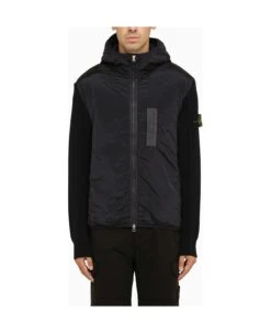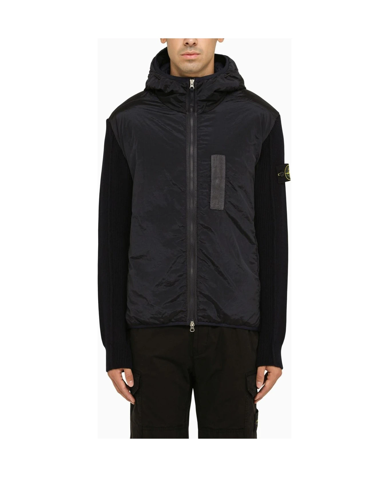 Stone Island nylon and navy wool jacket featuring long sleeves, fixed hood, removable logo patch and zipped chest pocket.