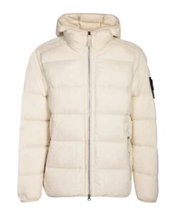 Stand-up neck. Classic hood. Front zip fastening. Long sleeves. Logo patch to the sleeve. Two side zip fastening pockets. Padded. Regular fit. Straight hem. Color: cream