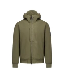 Military green hooded light blouson by Stone Island made of a 3-ply performance material with an 8000 MM water column. The 100% recycled polyester stretch canvas outer face is woven with yarns using the e. dye Waterless Color System technology, the innovative yarn colour saturation system which reduces by 85% the use of water and 90% of the chemicals used in the dye process. The fabric is laminated to a breathable, wind and water-resistant inner membrane, protected by a polyester pile backing. The outer structure of the material gives a great flexibility and comfort to the garment. Hood with visor and contour drawstring. Hand pockets on seam, with hidden zip fastening. Three ventilation eyelets under the sleeve. Stone Island badge on the left sleeve. Ribbed cuffs and bottom band. Two-way zip fastening.