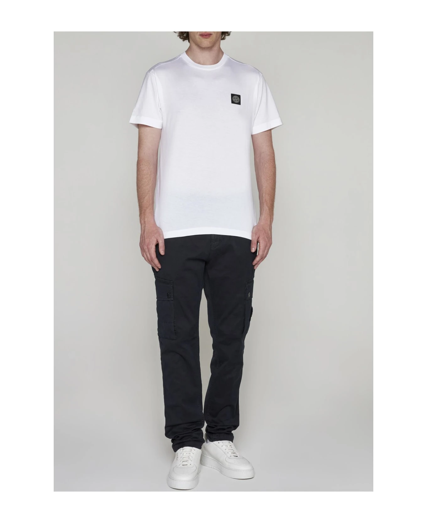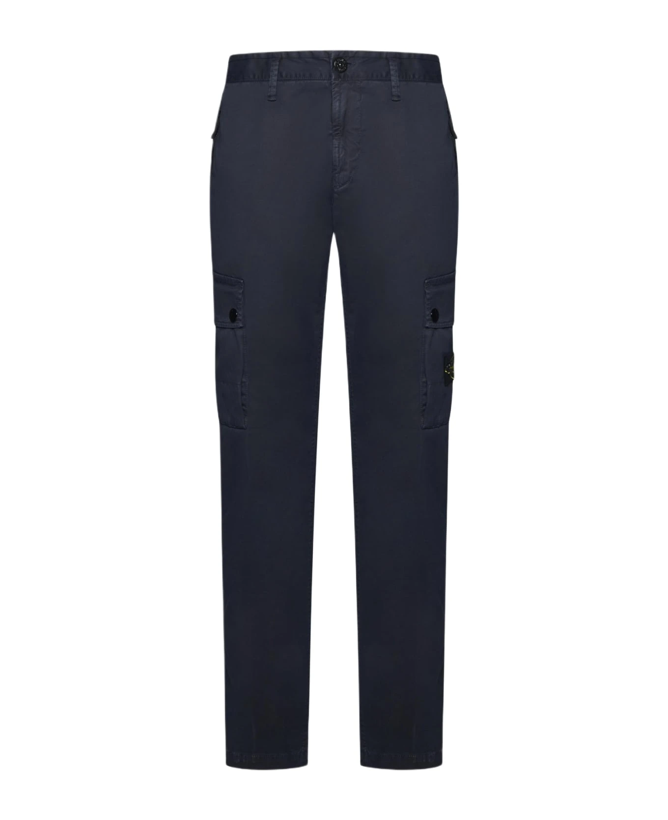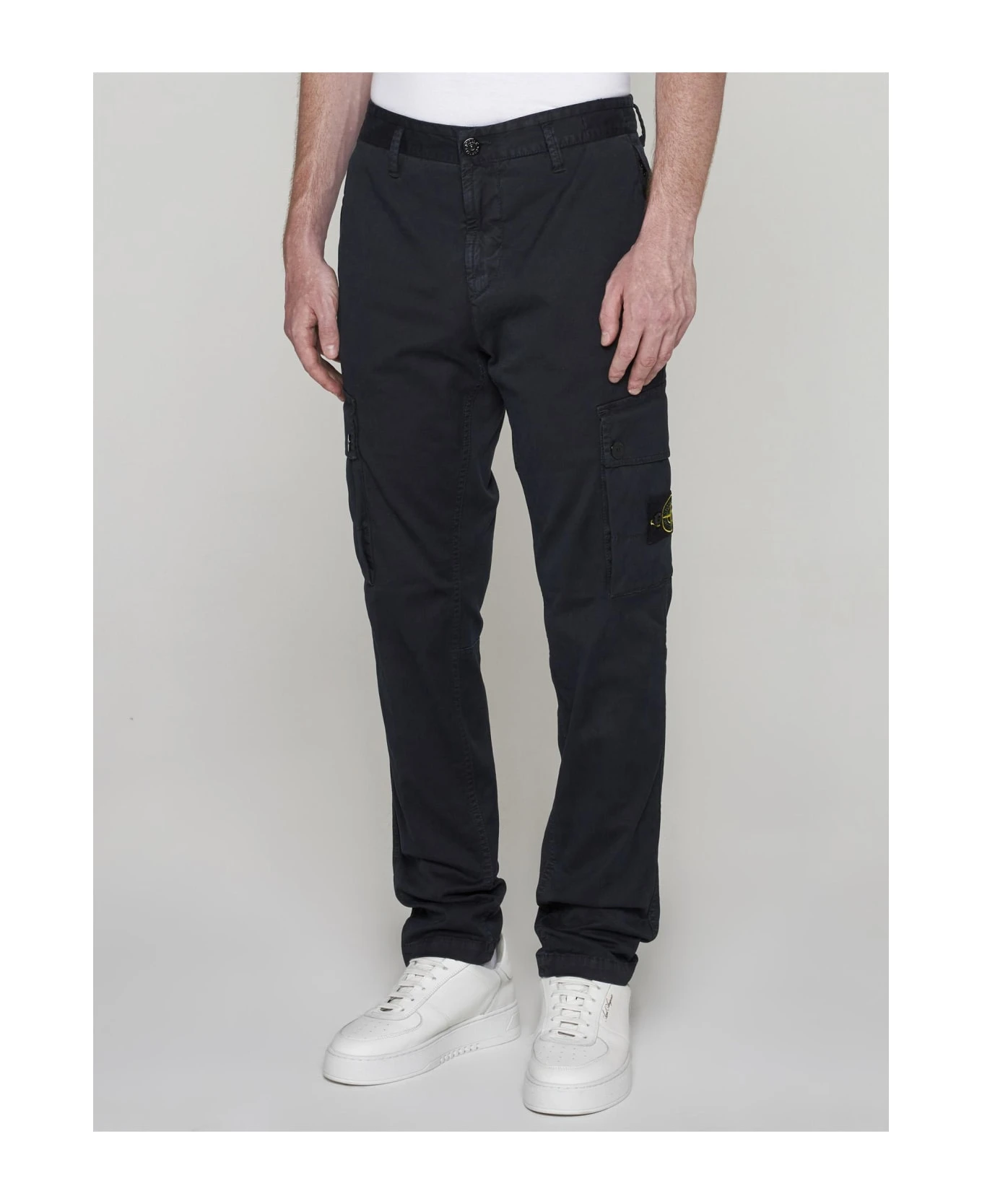 Stone Island’s slim-fit cargo pants in navy blue stretch cotton featuring belt loops, button and zip fly, side pockets, back welt pocket and large pockets along the legs with turn-ups, buttons and logo-label.