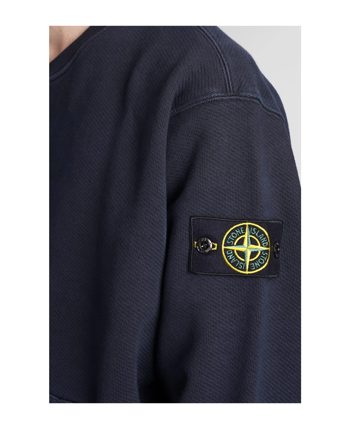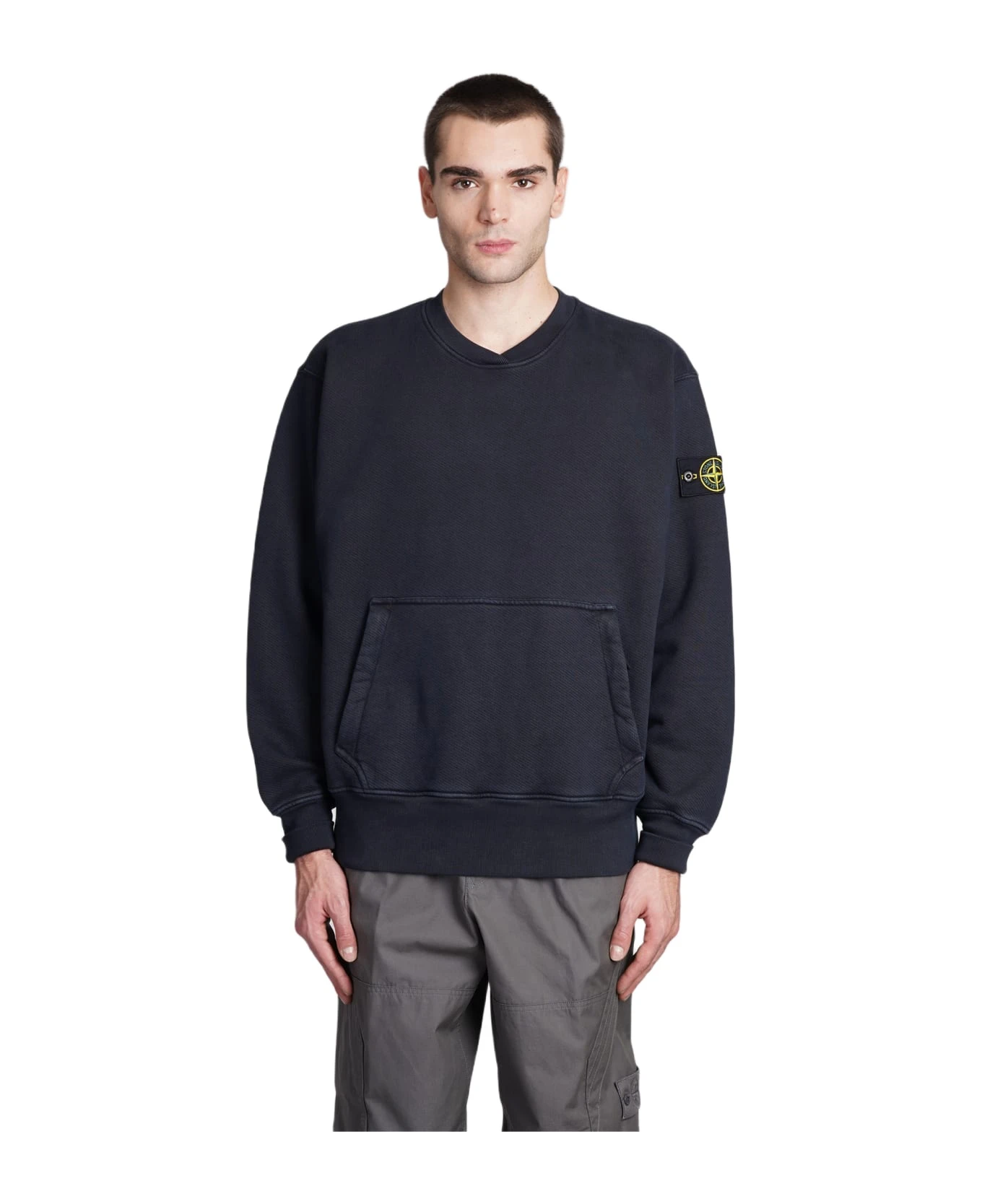 Sweatshirt in blue cotton, V neck, kangaroo pockets, patch logo sleeves, long sleeves, ribbed cuffs and bottom, 100% cotton, Made in Turkey, Model is 1. 83 and wears size M
