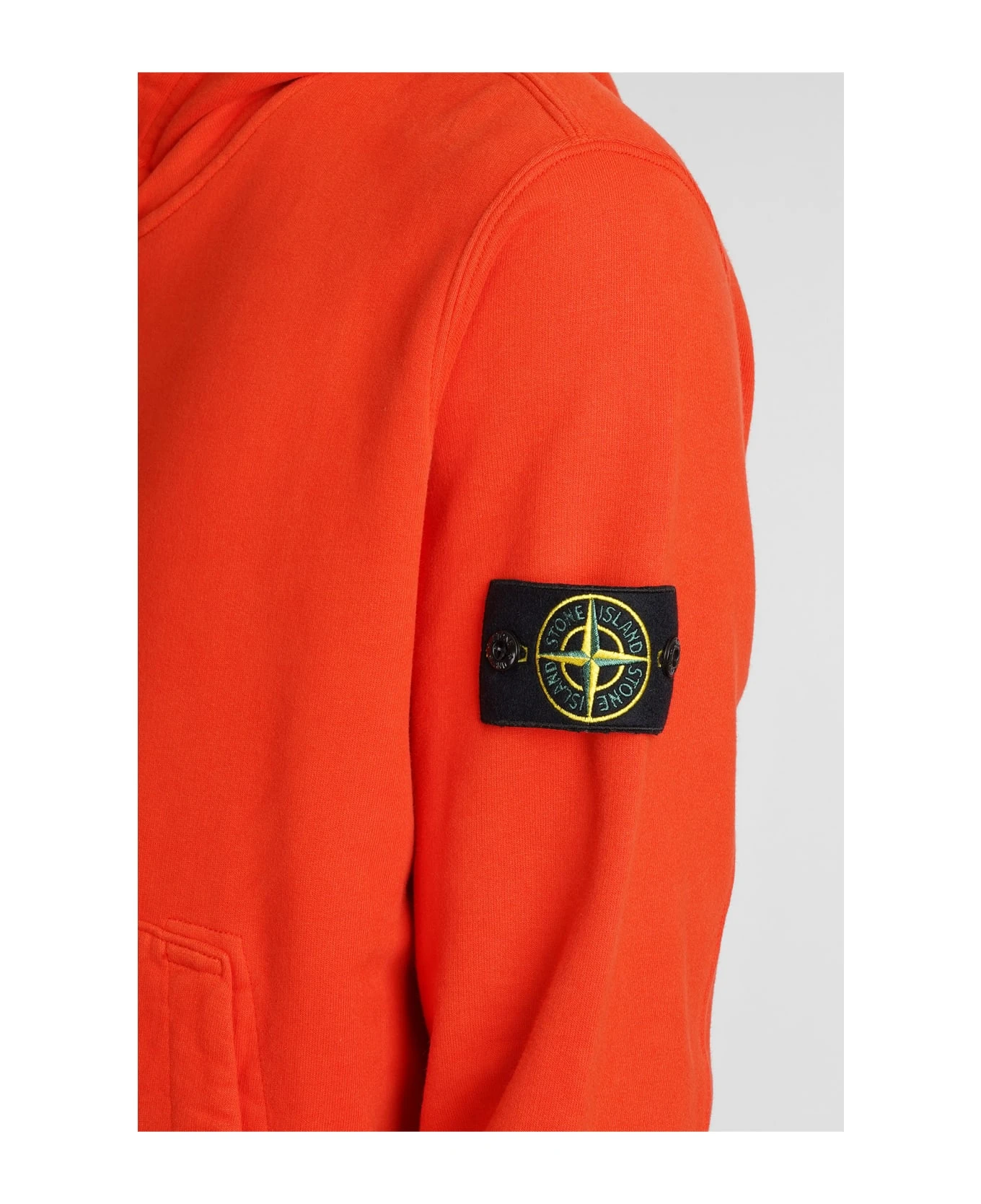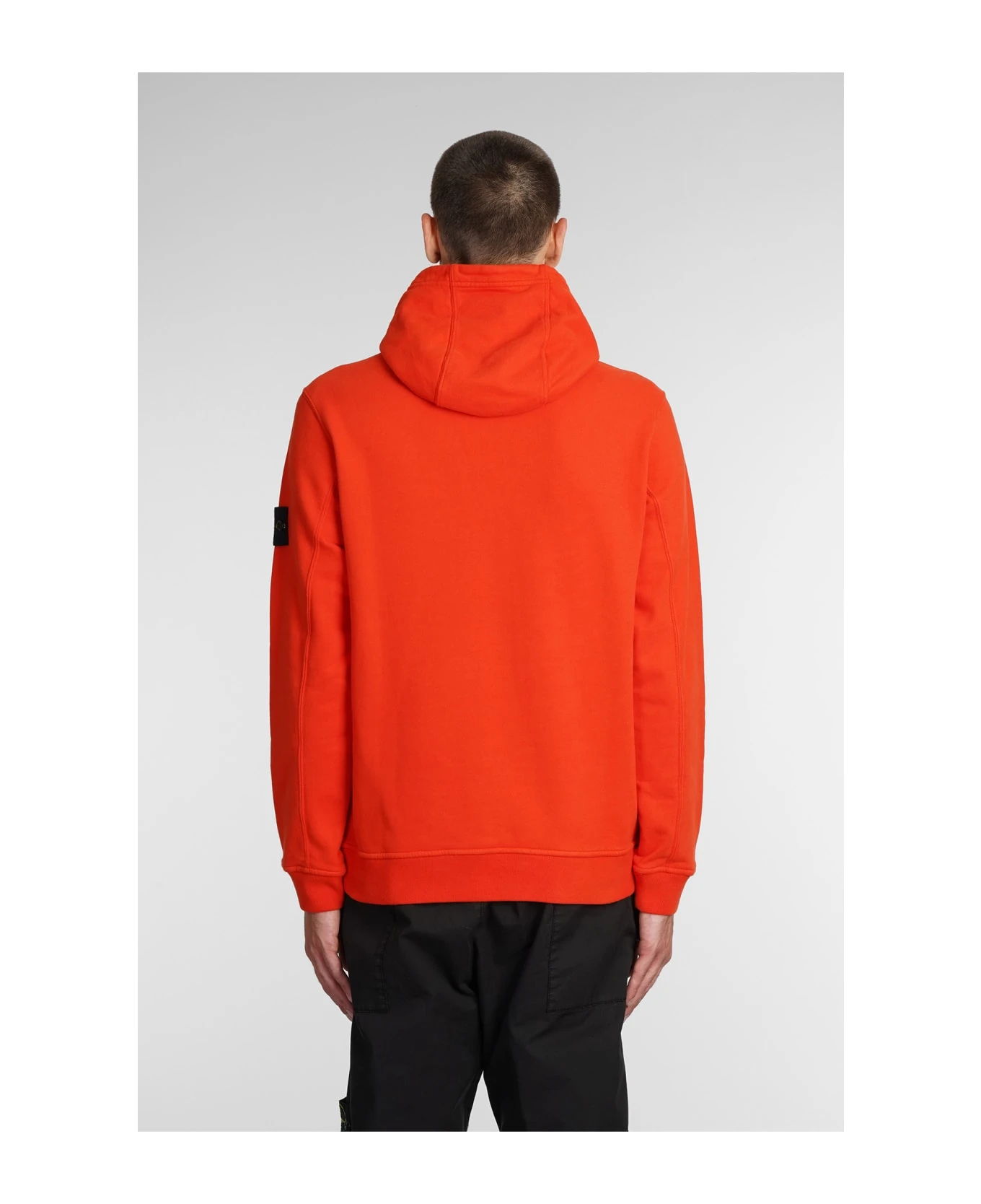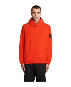Sweatshirt in orange cotton, hood, kangaroo pockets, ribbed cuffs and bottom, patch logo sleeves, Buttons detail, 100% cotton, Made in Romania, Model is 183 cm and wears size L