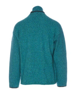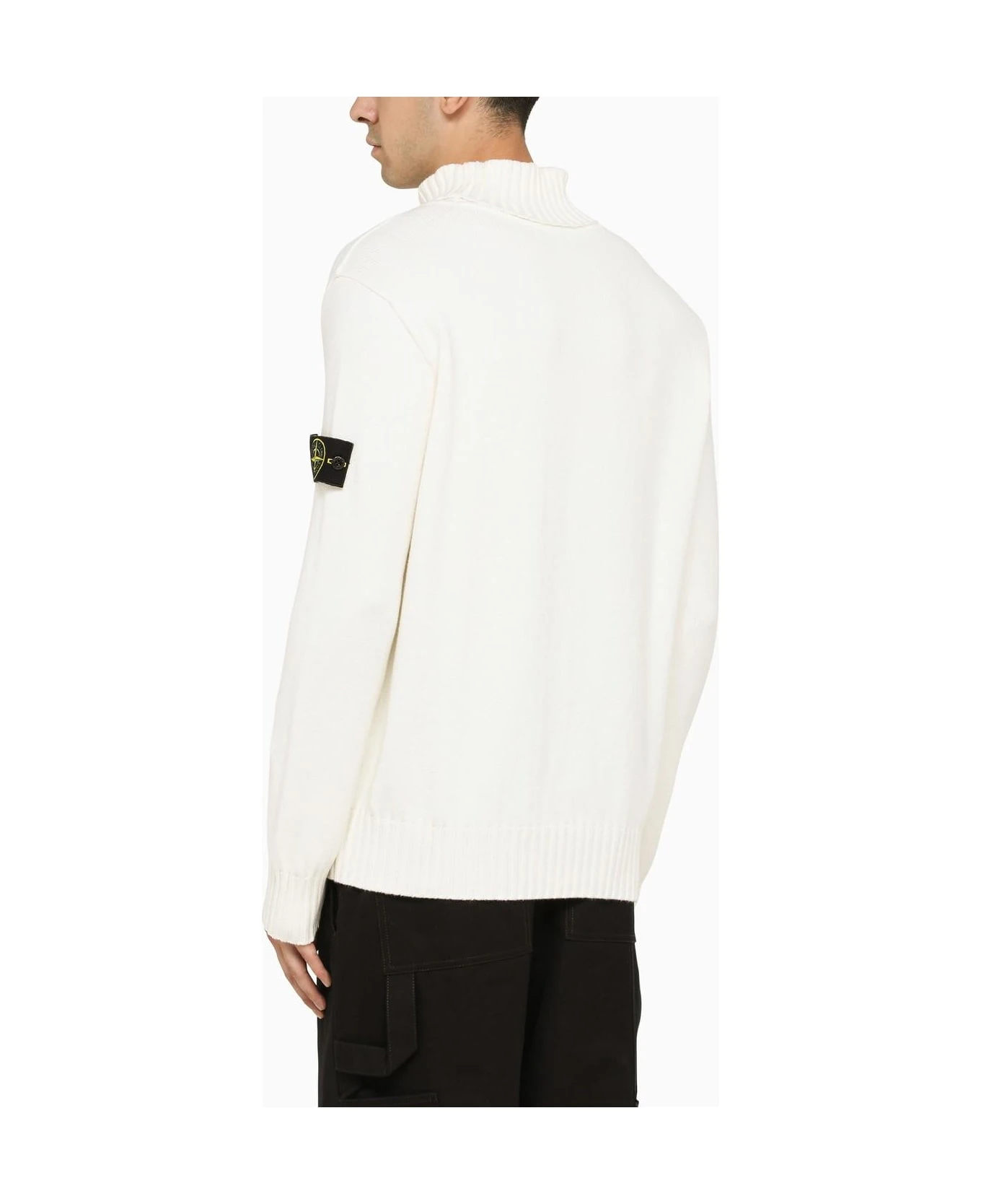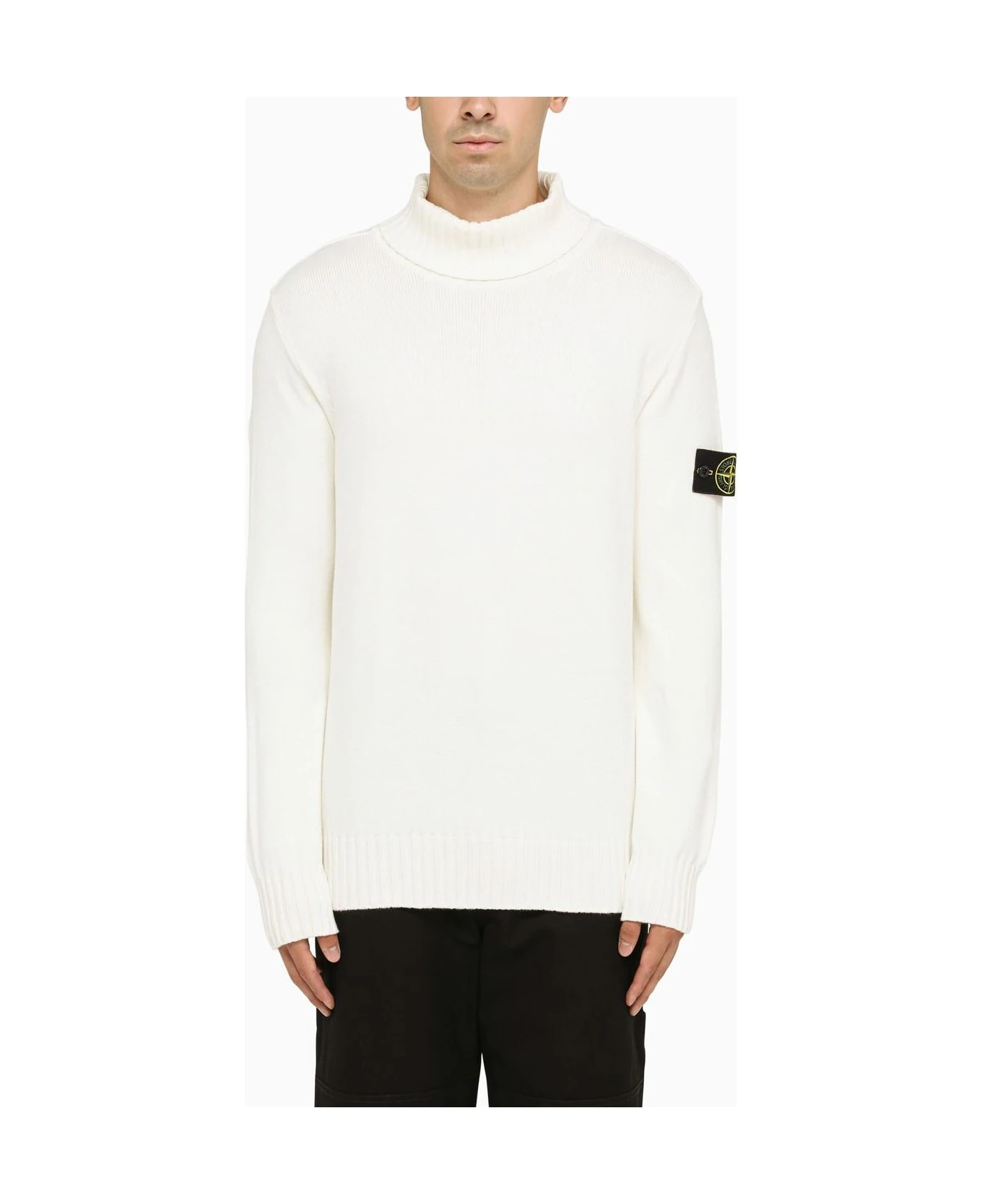 White wool-blend Stone Island turtleneck with long sleeves and logo patch on the sleeve.