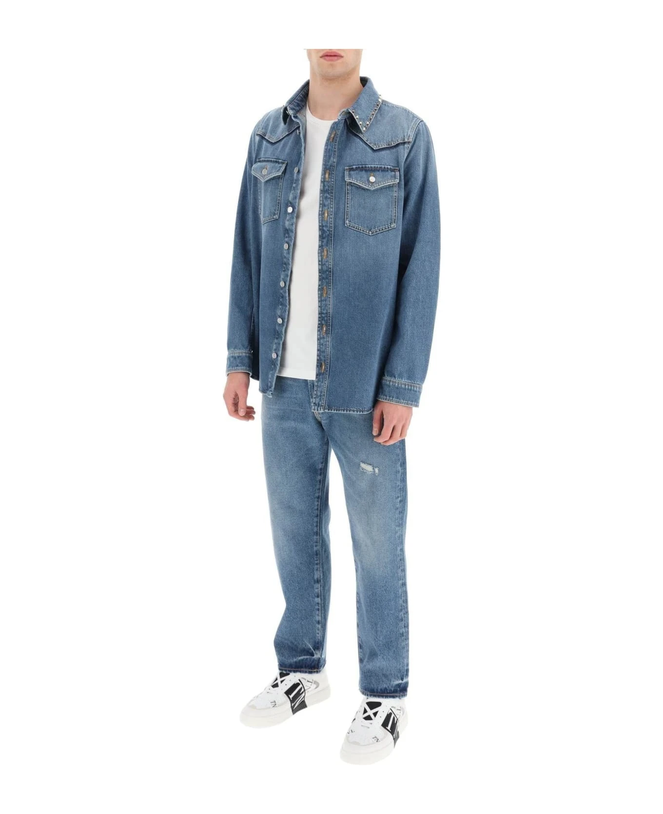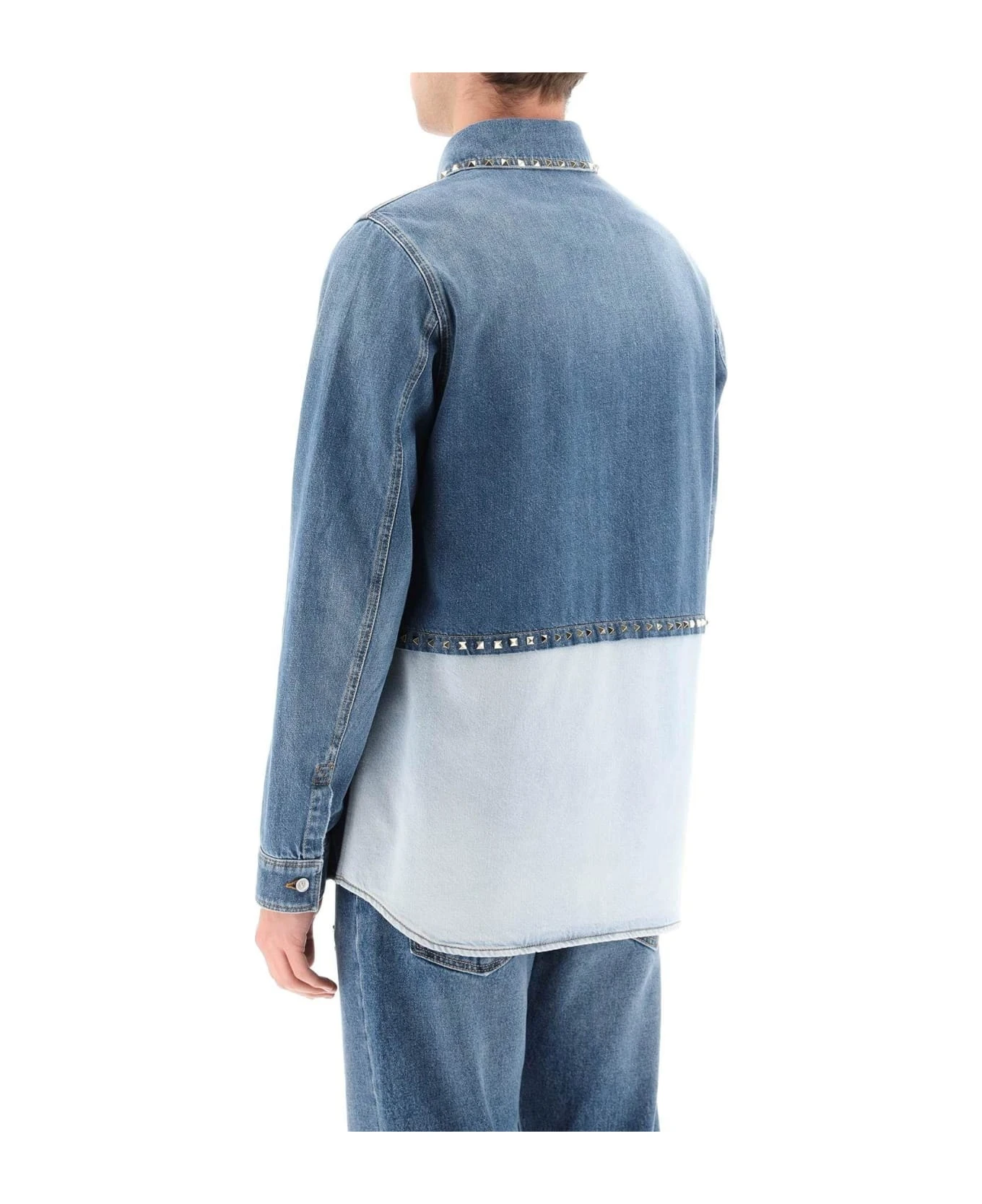 Valentino shirt in pure cotton denim with light wash insert on the back, enriched with the iconic platinum-finished metal studs on the collar and on the back. Front buttoning, pointed collar, one-button cuffs and chest patch pocket with flap and button. Steel-finished metal buttons with debossed VLogo Signature detail. Regular fit. The model is 187 cm tall and wears a size 48.