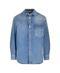 Denim shirt from Valentino in cotton denim, long sleeves, wide collar, flap pocket on one side of the chest with embossed logo, front closure with buttons.