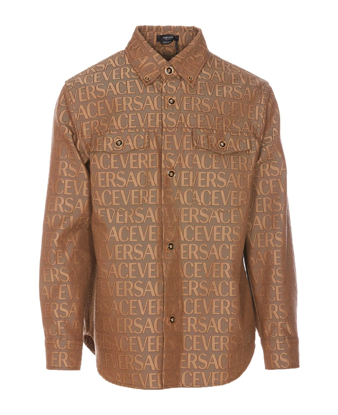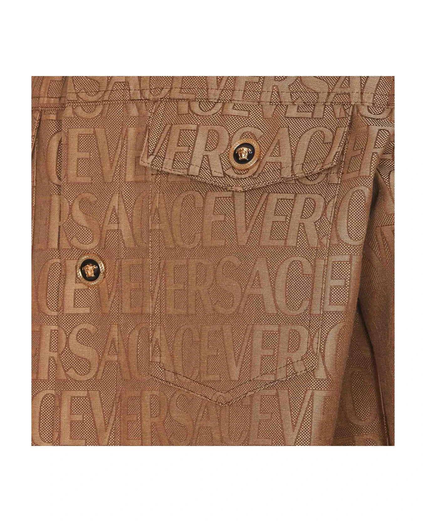 Versace brown jacket with frontal golden logo buttons, regular collar, long sleeves, golden buttons details on cuffs, all over logo, pockets