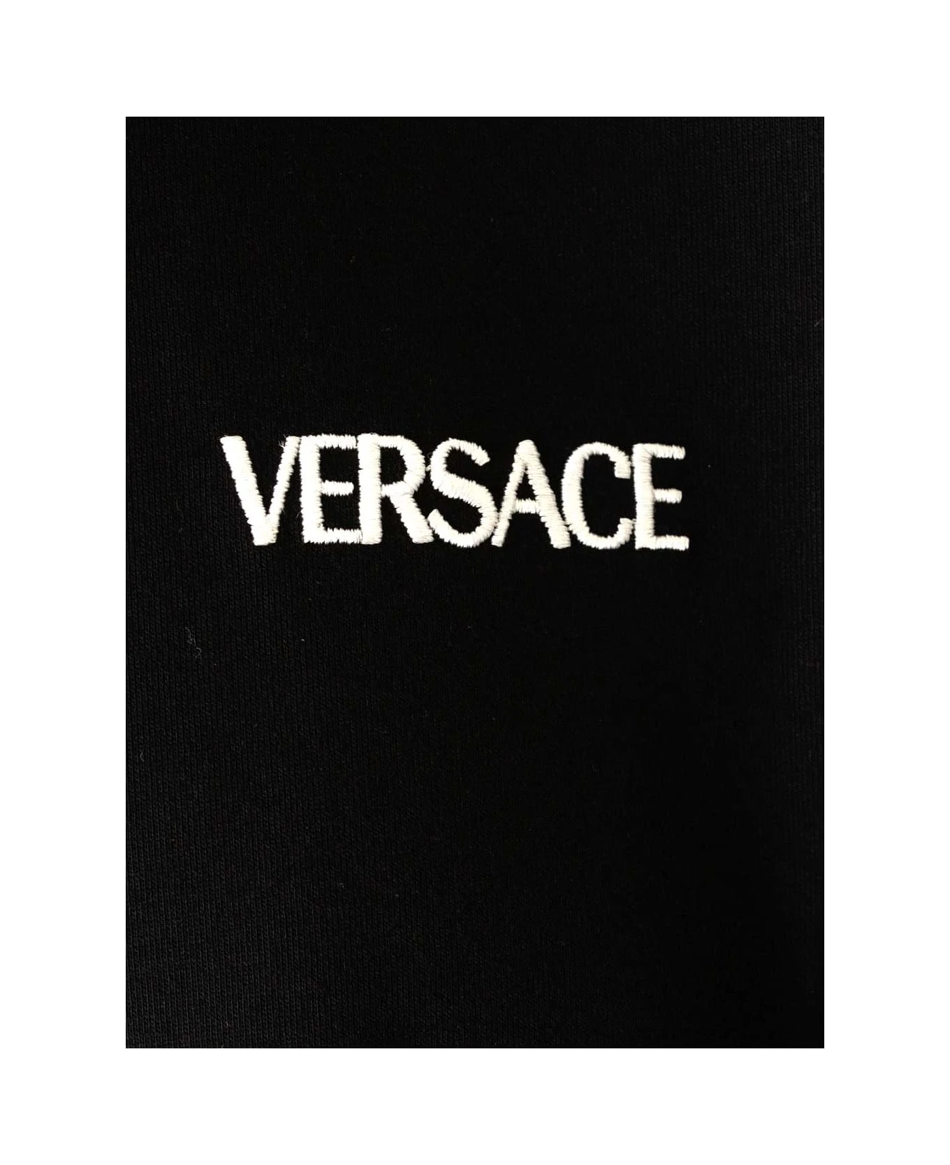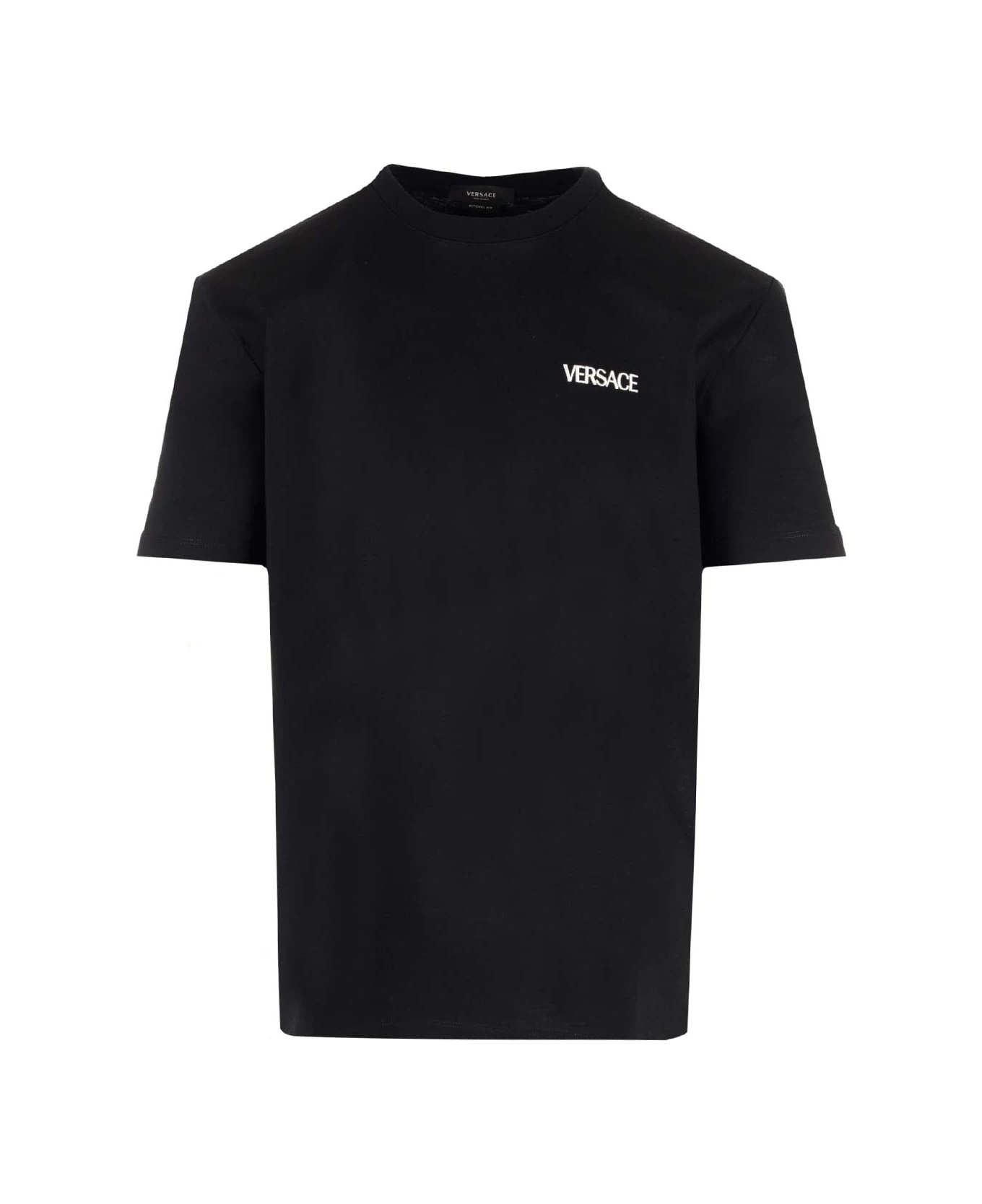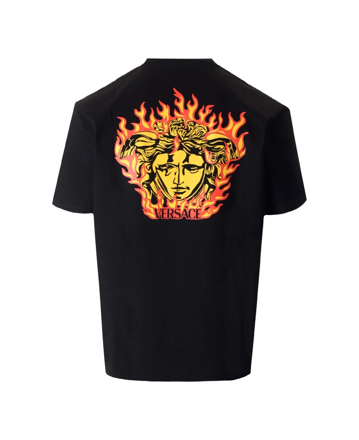 Black “Fiamma Medusa” t-shirt from Versace in cotton, “Fiamma Medusa” print on the back, white mini logo on one side of the chest, short sleeves, round neck.