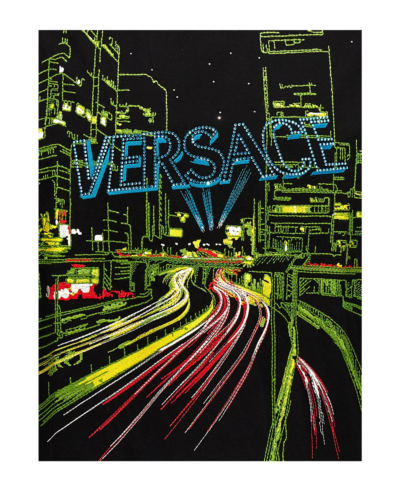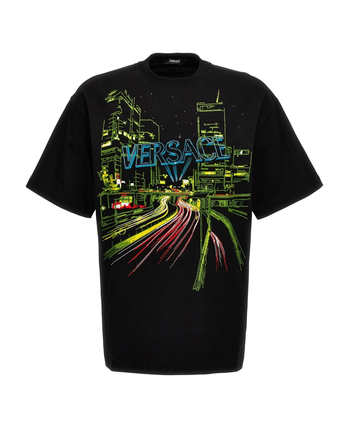 ‘Blinding Lights’ cotton T-shirt with front embroidery and rhinestone logo, crewneck, and short sleeves.
