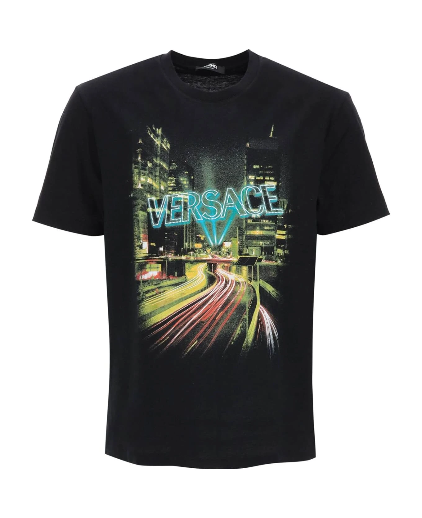 Versace T-shirt crafted in pure cotton jersey with City Lights print on the front. It features ribbed crew neck. Loose fit. The model is 187 cm tall and wears size L.