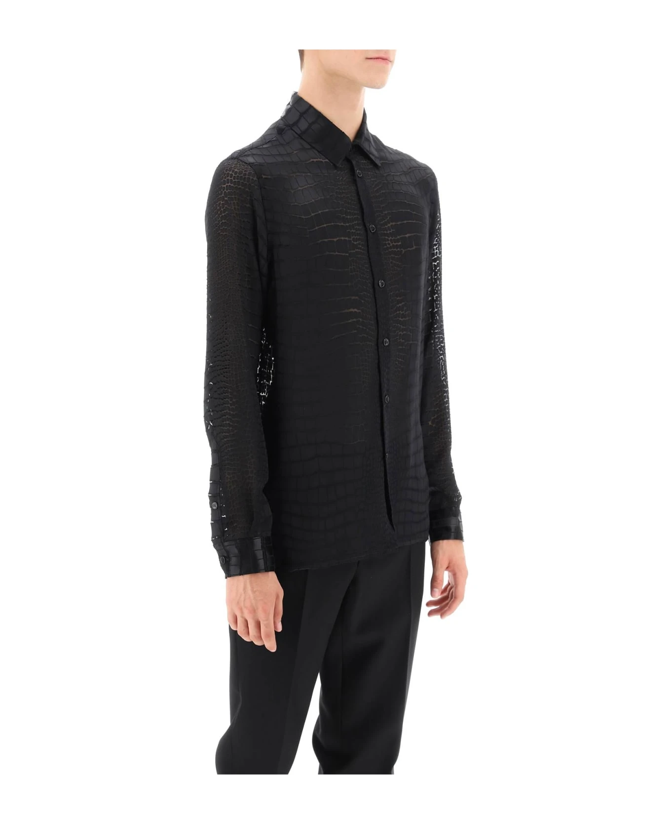 Crafted from d?vor? viscose-silk satin with a crocodile effect, this Versace shirt features a classic collar, front button placket and classic angled cuffs. Loose fit. The model is 187 cm tall and wears a size IT 48.