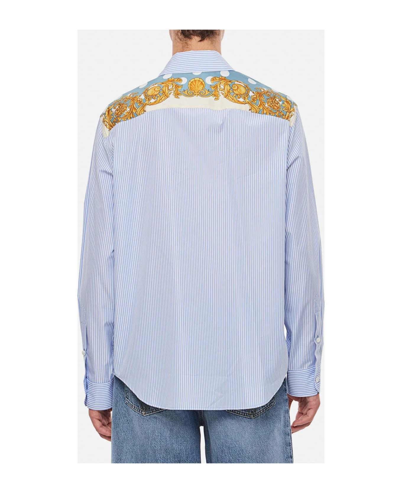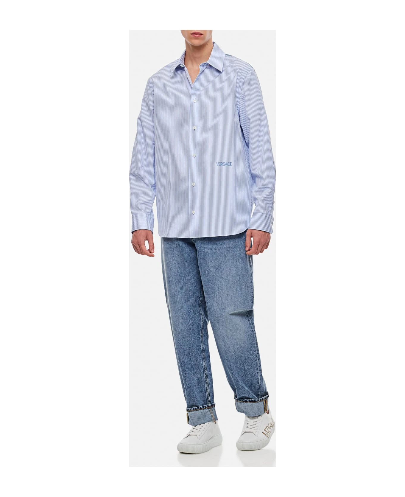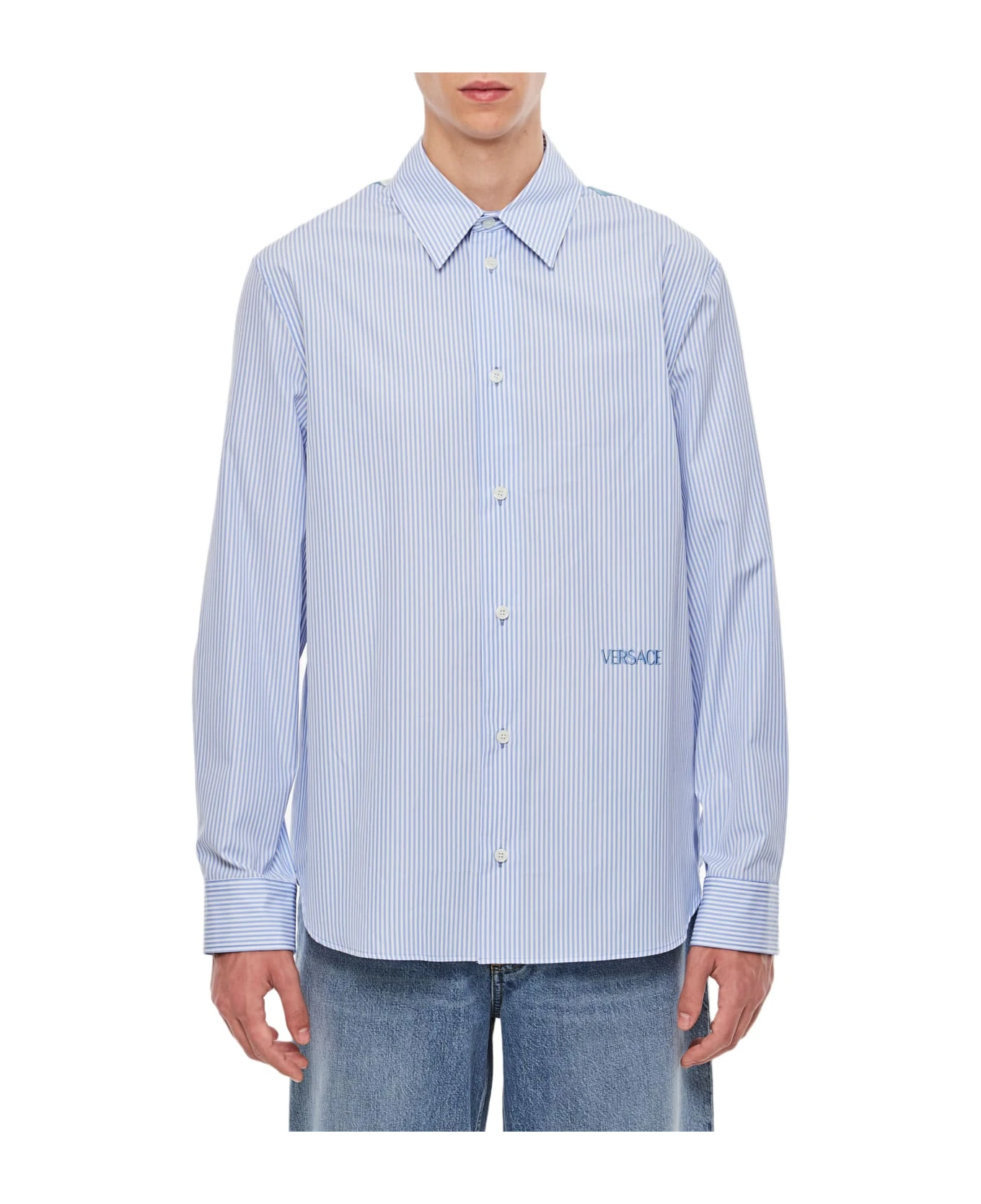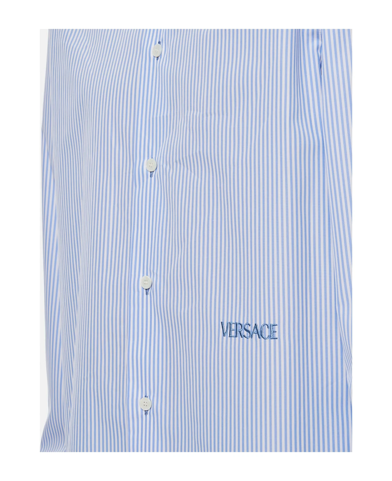 Striped cotton poplin fabric. Frontal buttons closure. Long sleeves. Classic collar. Color: light blue.