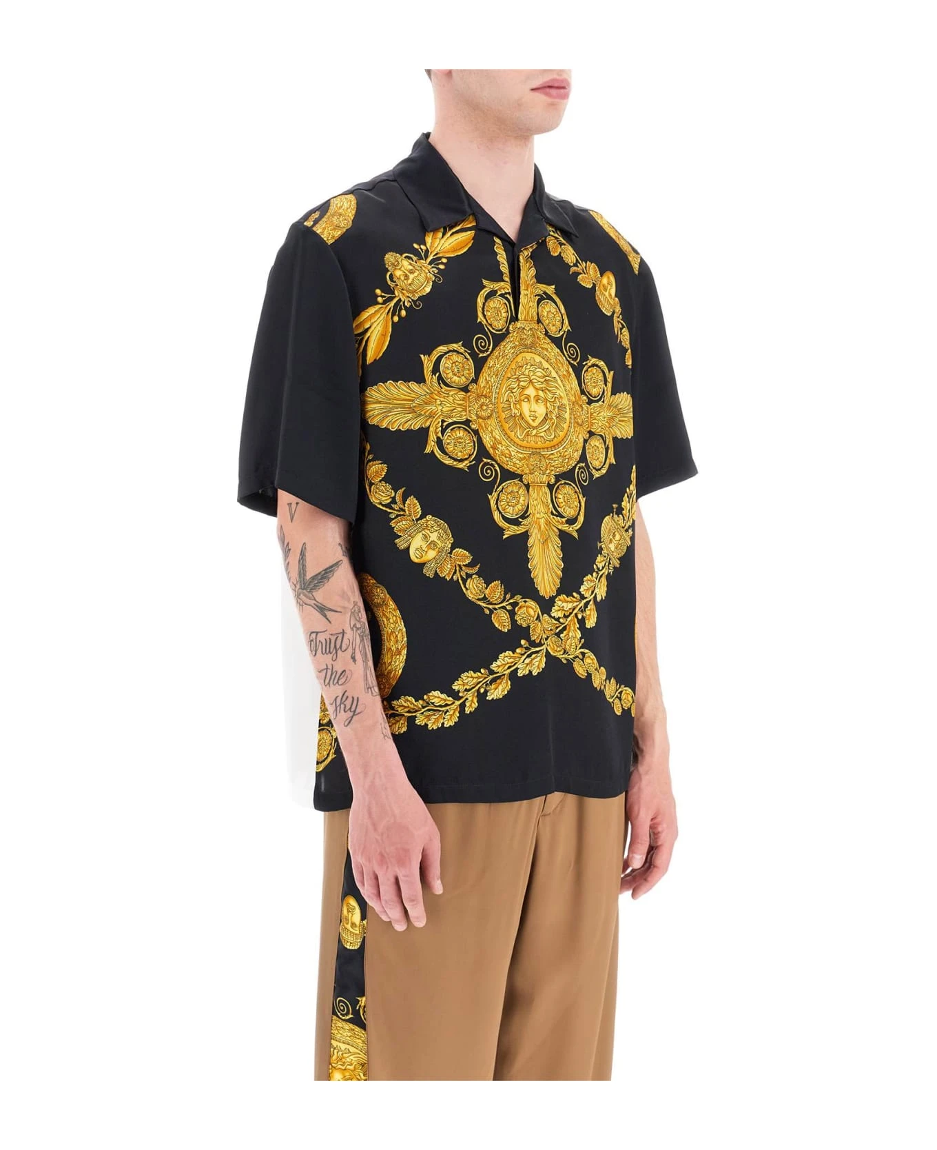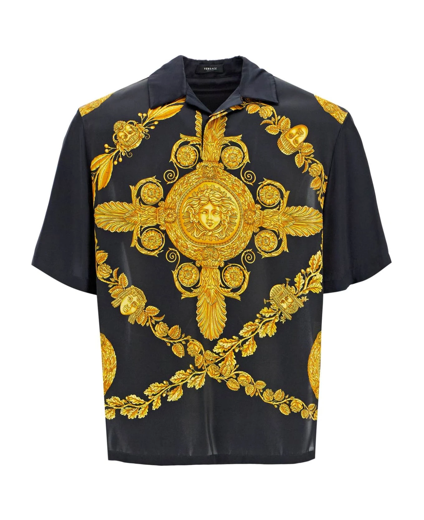 Versace short-sleeved polo shirt made of Maschera Baroque printed viscose satin with contrast back. Cut to a relaxed fit, it is finished with a camp collar with hidden button. The model is 187 cm tall and wears a size IT 48.